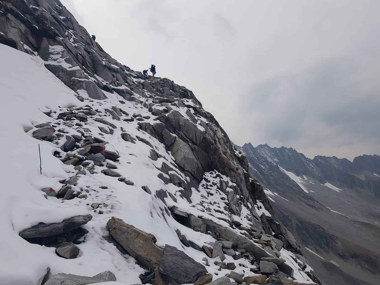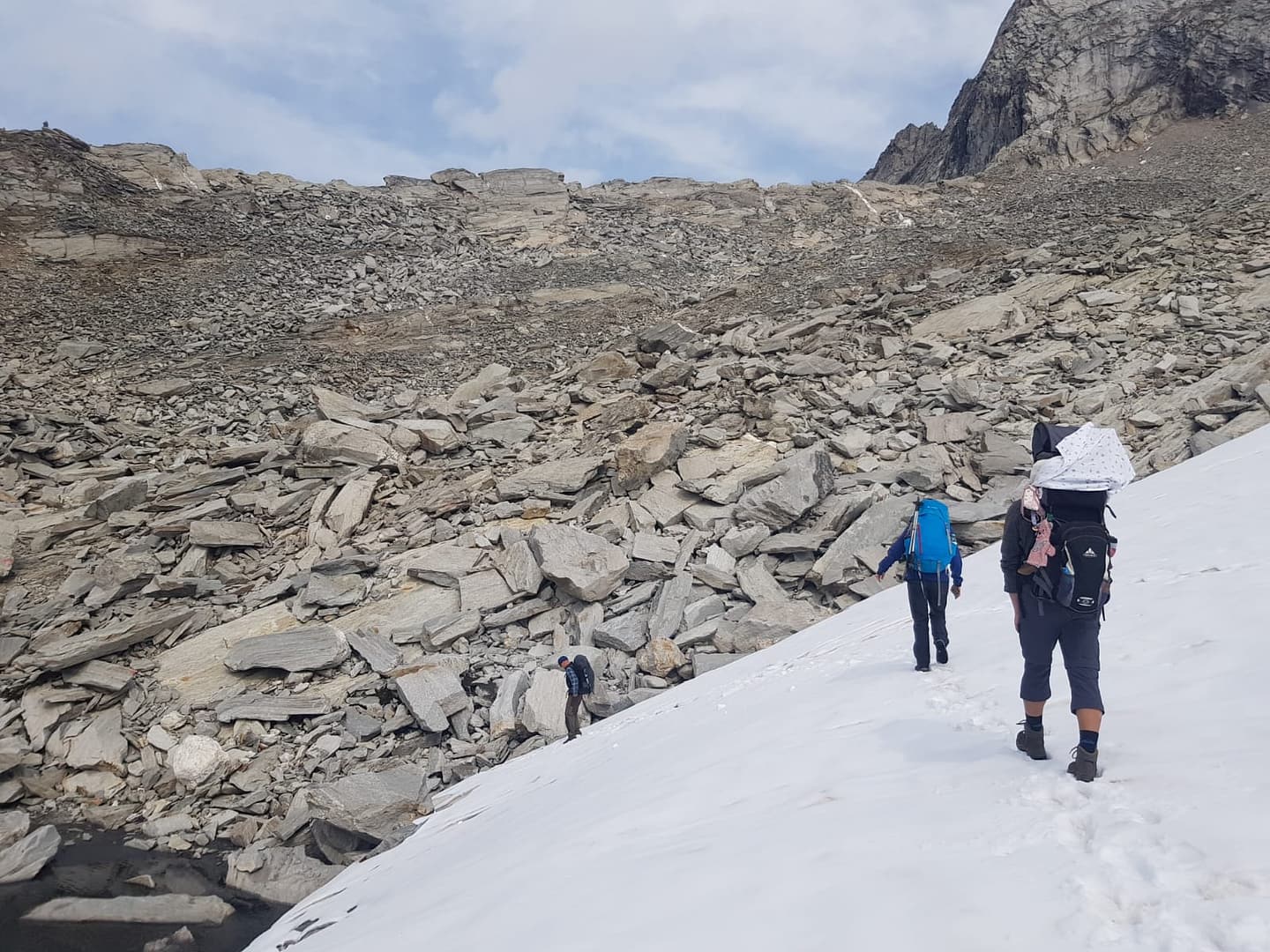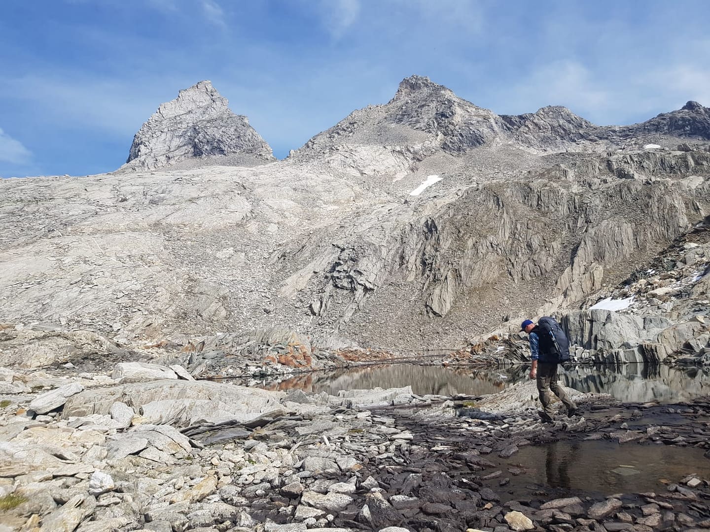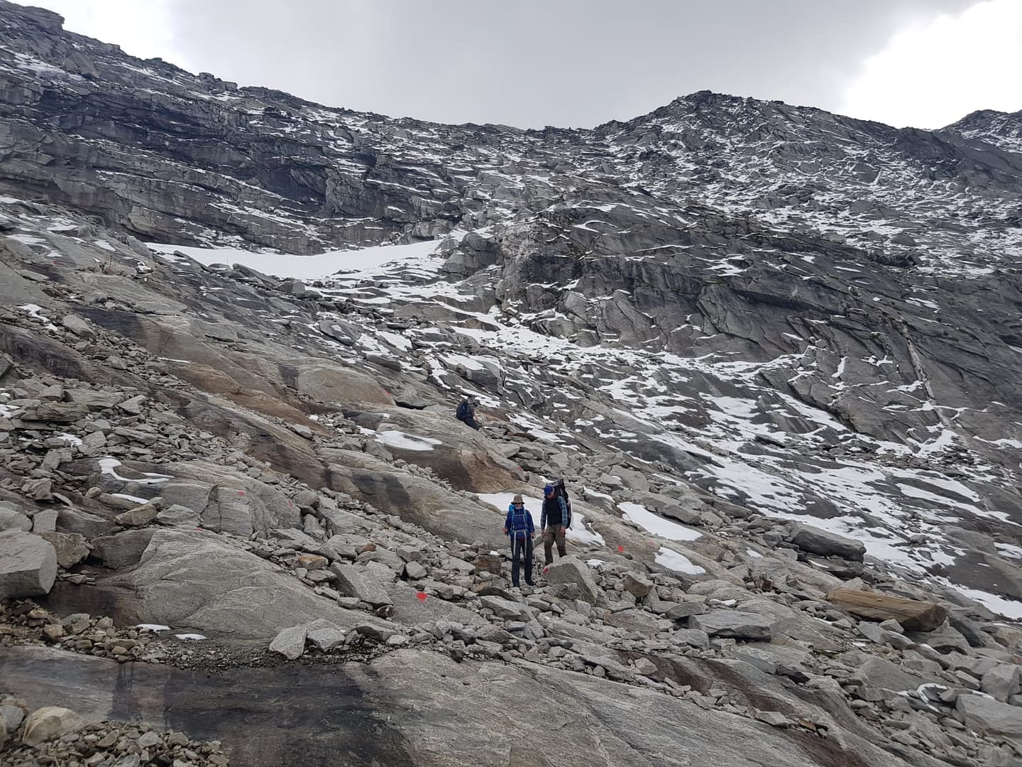 Vom See folgen wir dem steileren Weg 2472 bis zu einer weiteren Gabelung, die uns links zur Melkerscharte führt. In einem etwas flacheren Gelände gelangen wir zum Eissee, selbst im Sommer gibt es hier noch Schneereste, mit welchem wir uns eine kleine „Schneeballschlacht“ geliefert hatten. Nach dem Eissee wird der Weg wieder steiler und führt über Blockgelände zur Melkerscharte. Hier oben hat man einen fantastischen Ausblick auf die Gipfel um einen rum sowie auf das Gunggl-Tal.