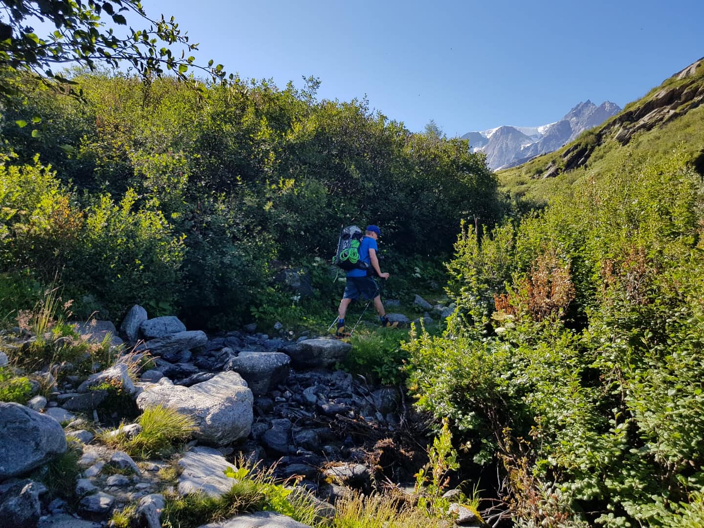 Nachdem man ein paar Meter wieder abgestiegen ist, sieht man schon die mächtigen Moränenwälle des Glacier de Valsorey. Über schmale Wege und Weiden erreichen wir ein flacheres Platteau und danach geht es erst über Blockgelände und dann in vielen Kehren hinauf zur Cabane de Valsorey.