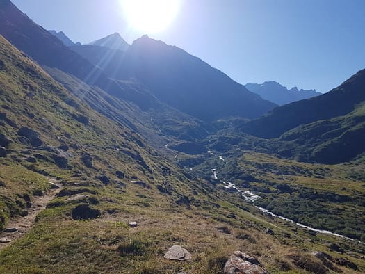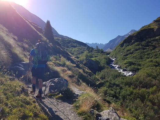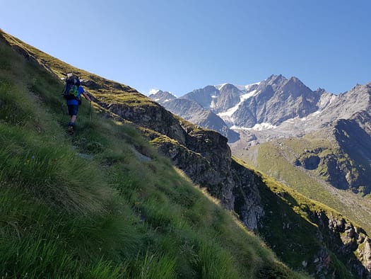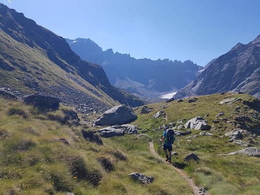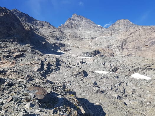 Nachdem man ein paar Meter wieder abgestiegen ist, sieht man schon die mächtigen Moränenwälle des Glacier de Valsorey. Über schmale Wege und Weiden erreichen wir ein flacheres Platteau und danach geht es erst über Blockgelände und dann in vielen Kehren hinauf zur Cabane de Valsorey.