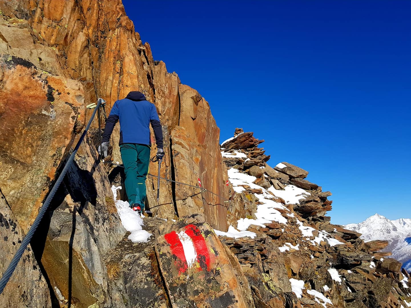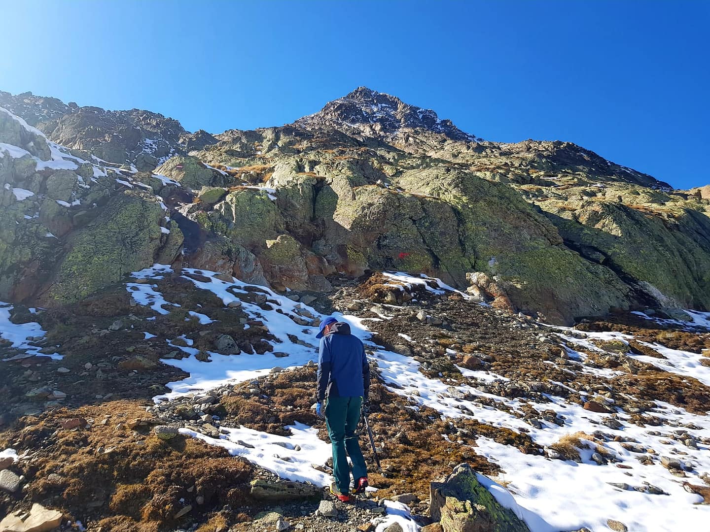 Es führen zwei Wege zu den drei Gipfeln der Hintergraslspitzen: Entweder über die rechte / westliche Moräne, am Winterraum vorbei – anfangs gleicher Anstieg wie zum Fluchtkogel und man quert vor einem Felsriegel rechts über Blockgelände auf eine breite Geländeschulter oder man geht den alten Bergweg von der Vernagthütte aus, auch über Blockgelände mit mal besseren, mal schlechter sichtbaren Markierungen. (Zuhause gelesen, dass dieser Weg nicht mehr gewartet wird.)