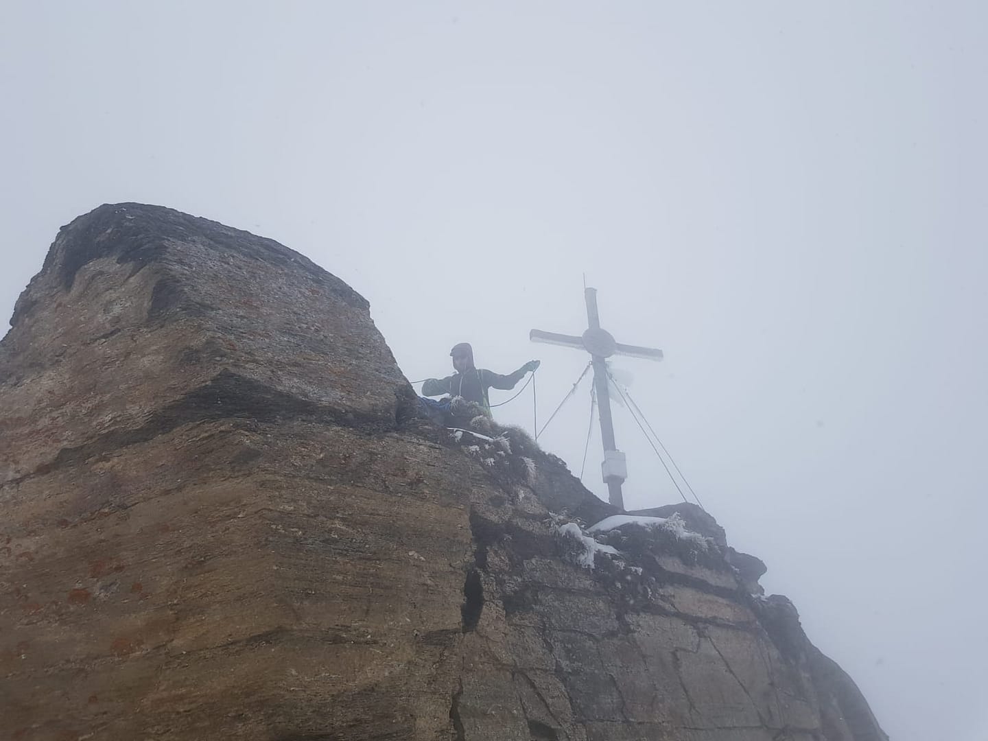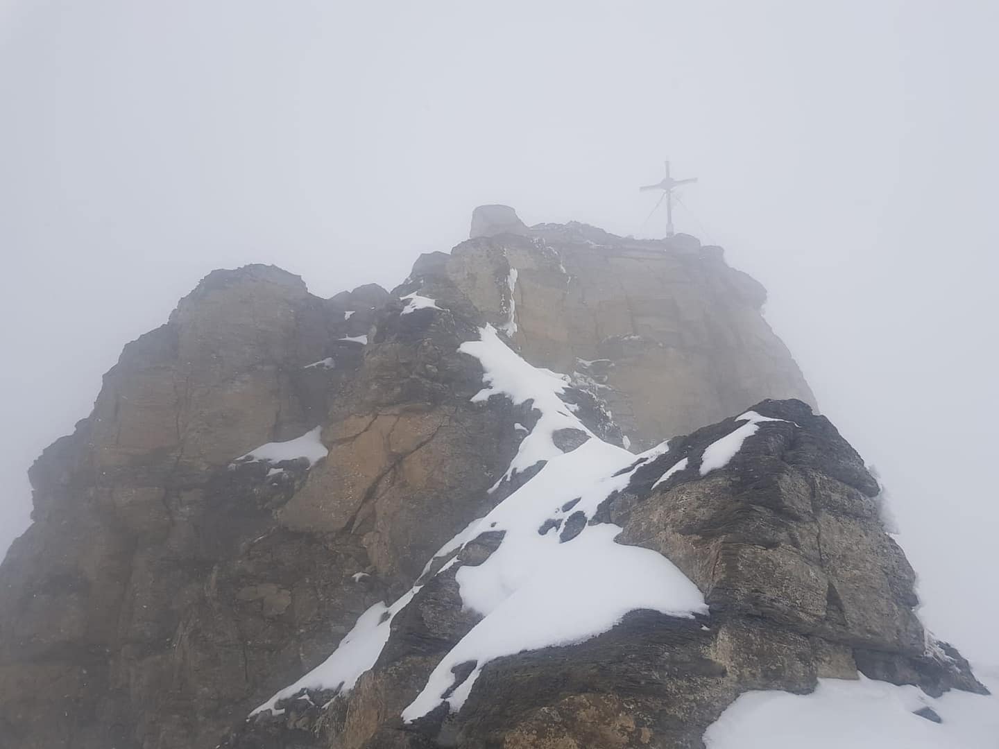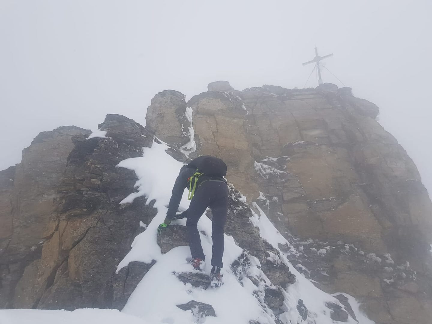 Die letzten Meter zum Gipfelkreuz muss man sich im exponierten Fels im 2. Grad erklettern, bei uns war es eine etwas rutschige Angelegenheit aufgrund des Schnees, aber schlussendlich doch machbar. Der Abstieg wurde dann noch interessant, da wir aufgrund des Wetters einfach nichts gesehen hatten.