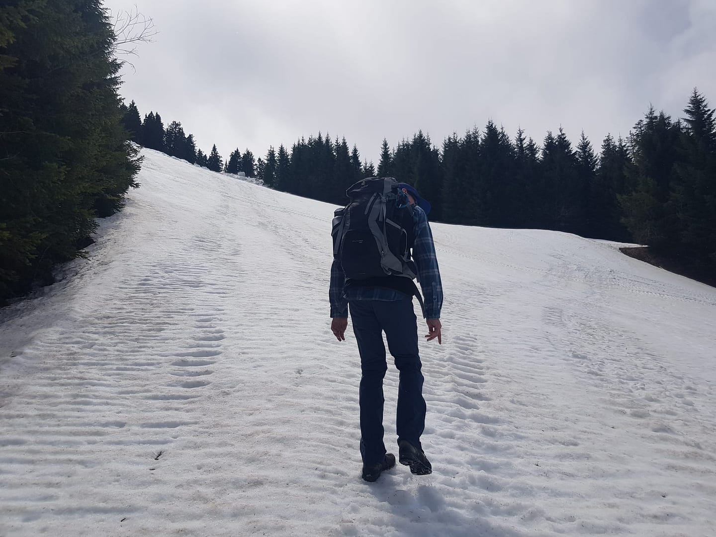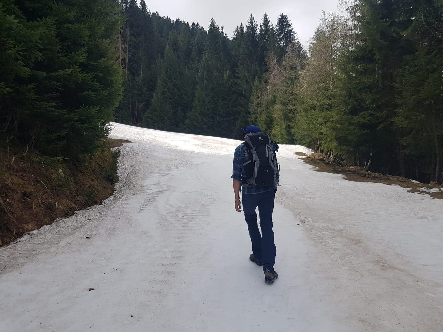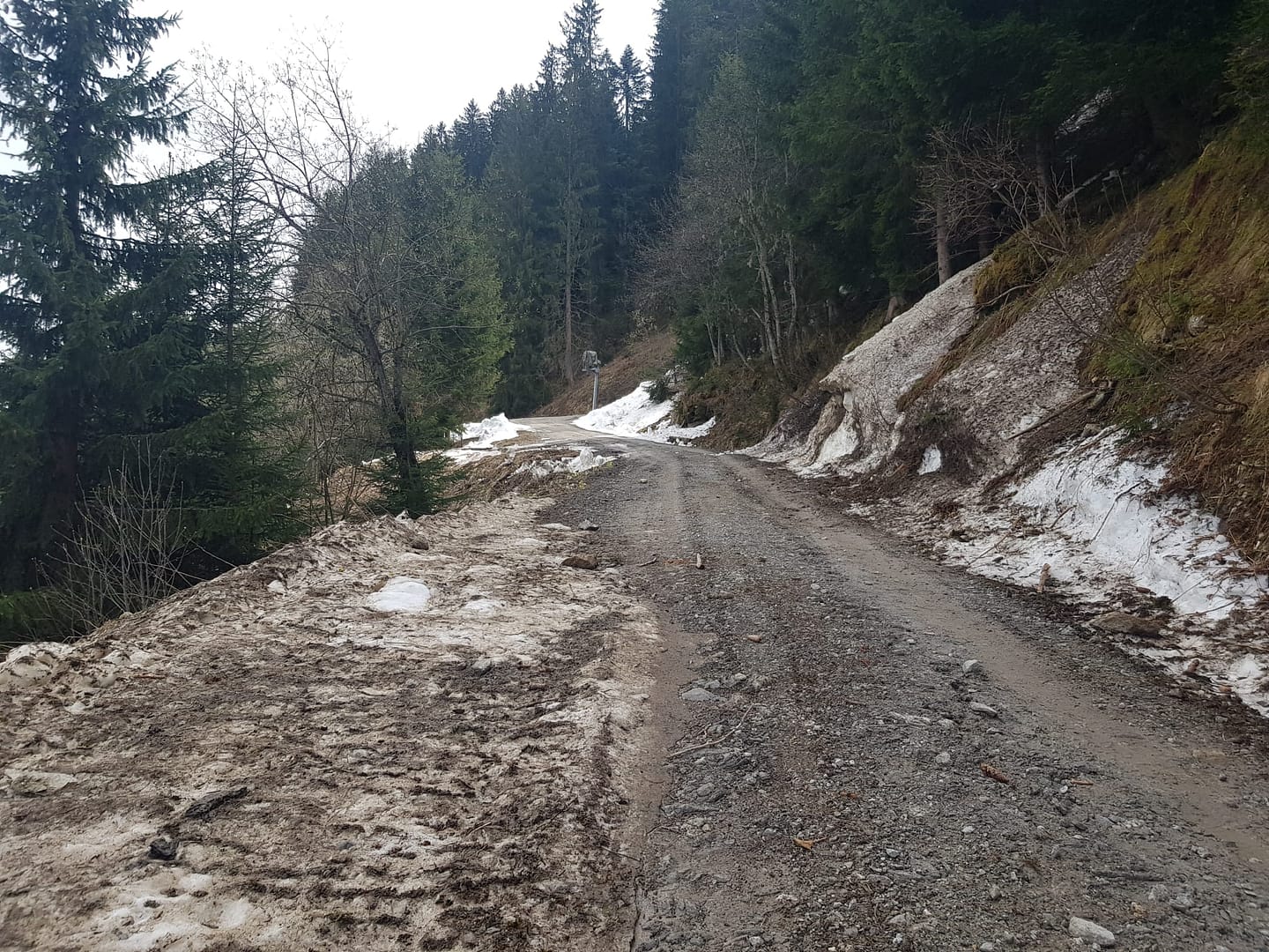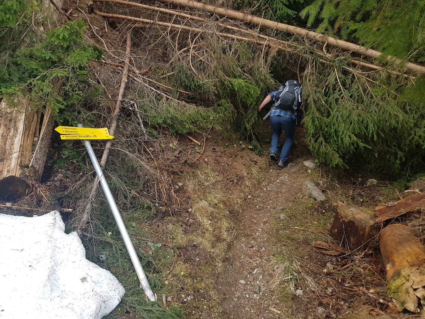 Ab hier wird der Weg eher langweilig, dafür wurden wir vom Wetter überrascht, denn zusätzlich den paar Tropfen regen am Anfang kam nun auch Schnee und teilweise starker Wind hinzu. Wir wurden auch mit Gämsen und Rehen überrascht, die anscheinend bei dem rauen Wetter keine Wanderer erwartet hatten. Auf 1.520 m haben wir eine Serpentine über die schneebedeckte Piste abgekürzt, denn man konnte recht gut auf dem Kunstschnee laufen ohne einzusinken.