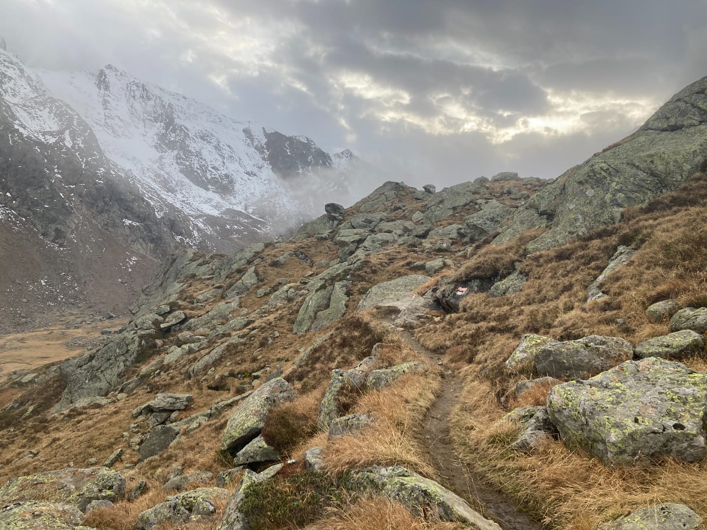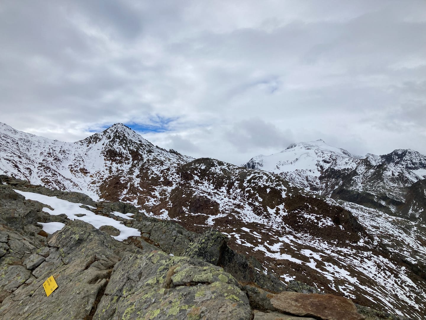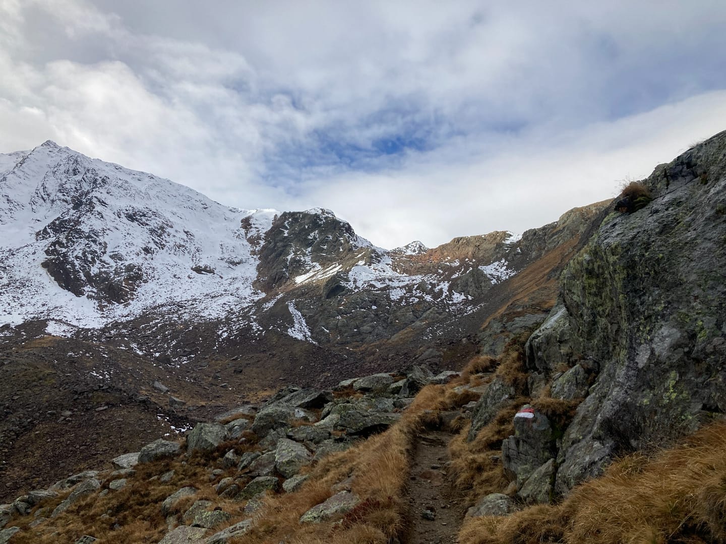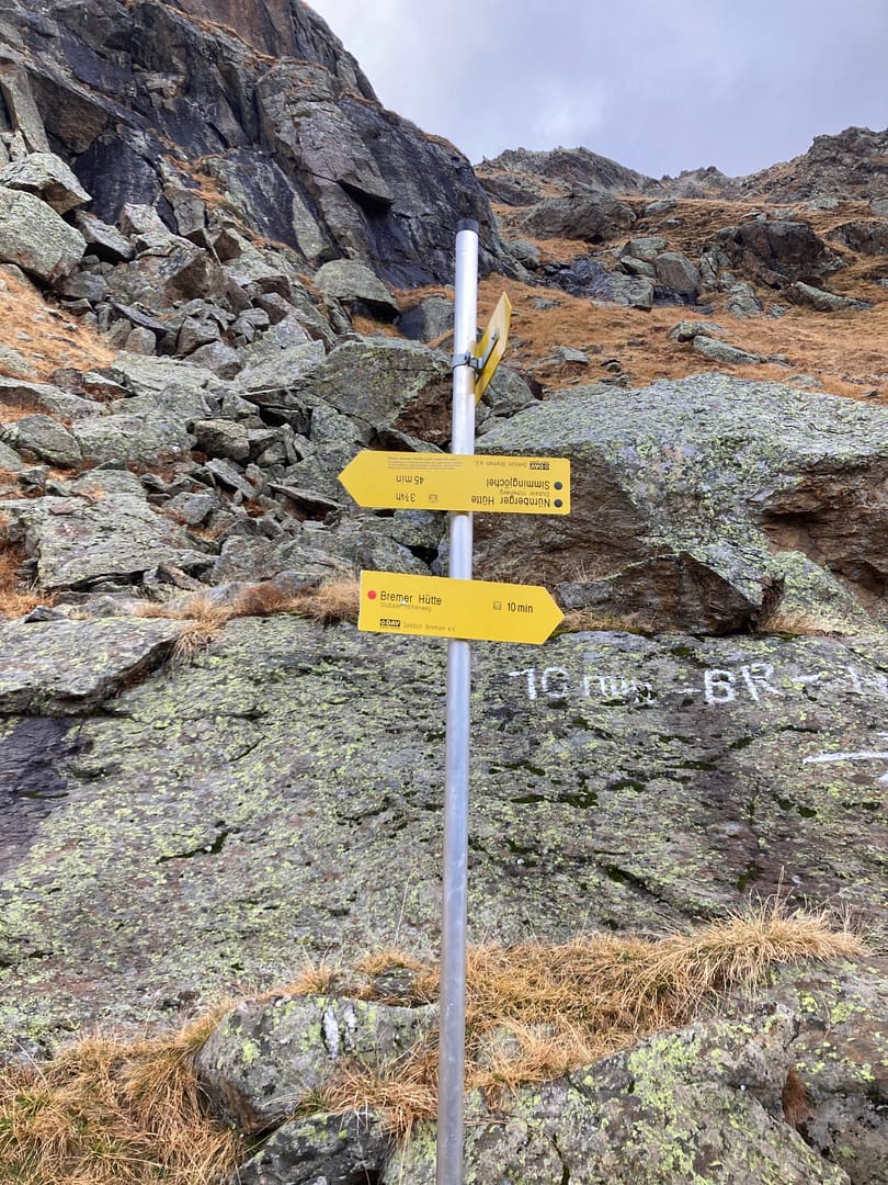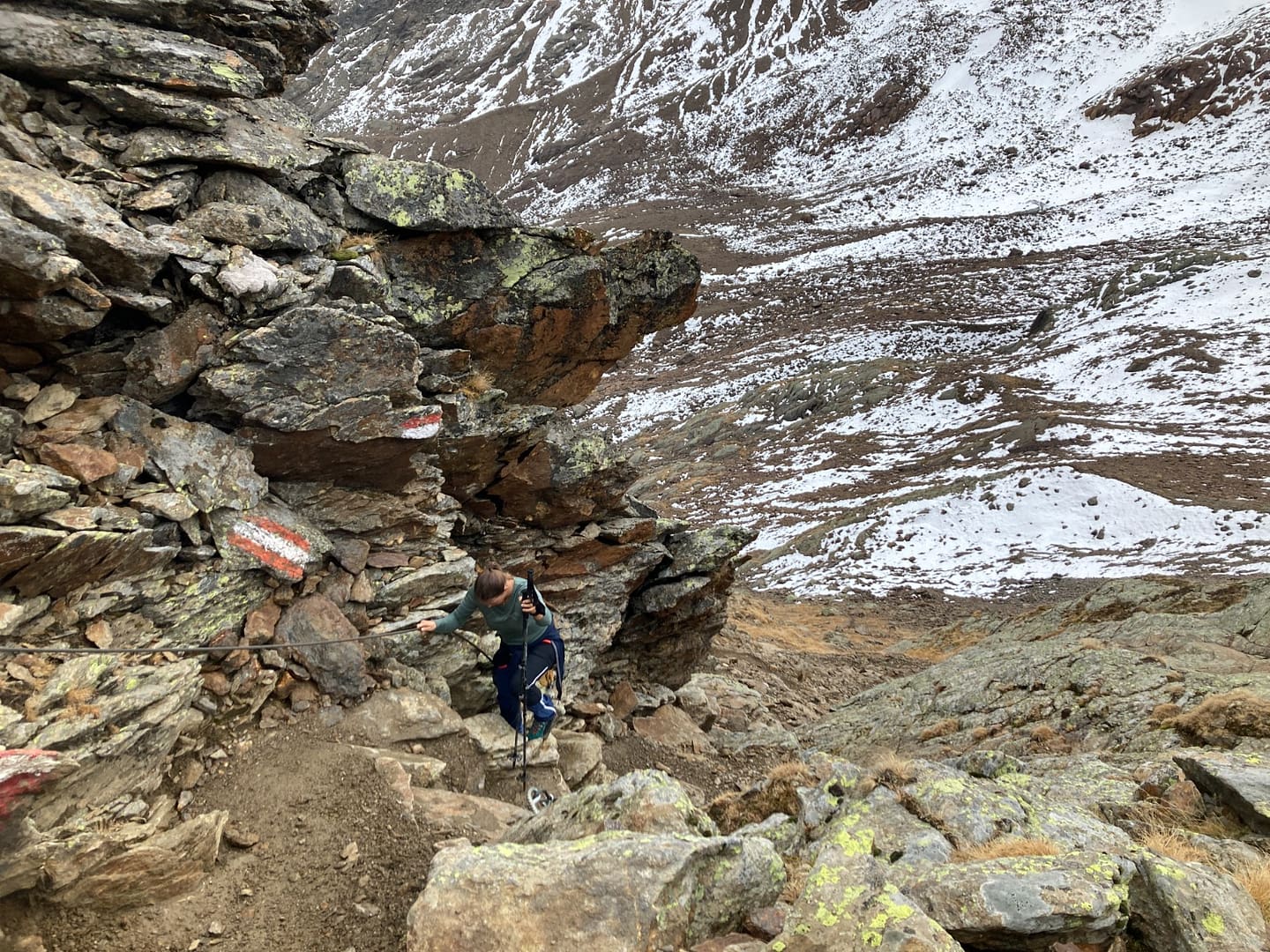 Von der Bremer Hütte folgen wir dem Stubaier Höhenweg zum Simmingjöchl auf 2.764 m. Die ersten 1,7 km haben nur eine leichte Steigung, bzw. verliert man kurz nach der Hütte einige Höhenmeter, weil die Felsrippe von der Inneren Wetterspitze so tief ragt, dass man diese umgehen muss. Am tiefsten Punkt des Weges führt ein Steig über den Grenzkamm zur Magdeburger Hütte in Südtirol ab. Bis auf ca. 2.600 ist es ein mäßig ansteigender Pfad, jetzt wird es steiler und führt teilweise seilversichert durch eine brüchige Rinne zur Zollhütte hinauf.