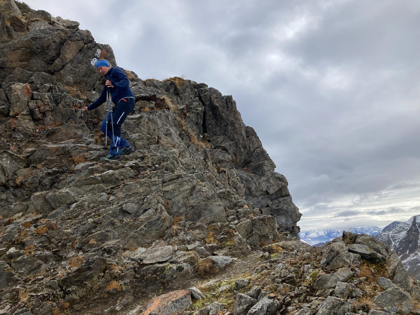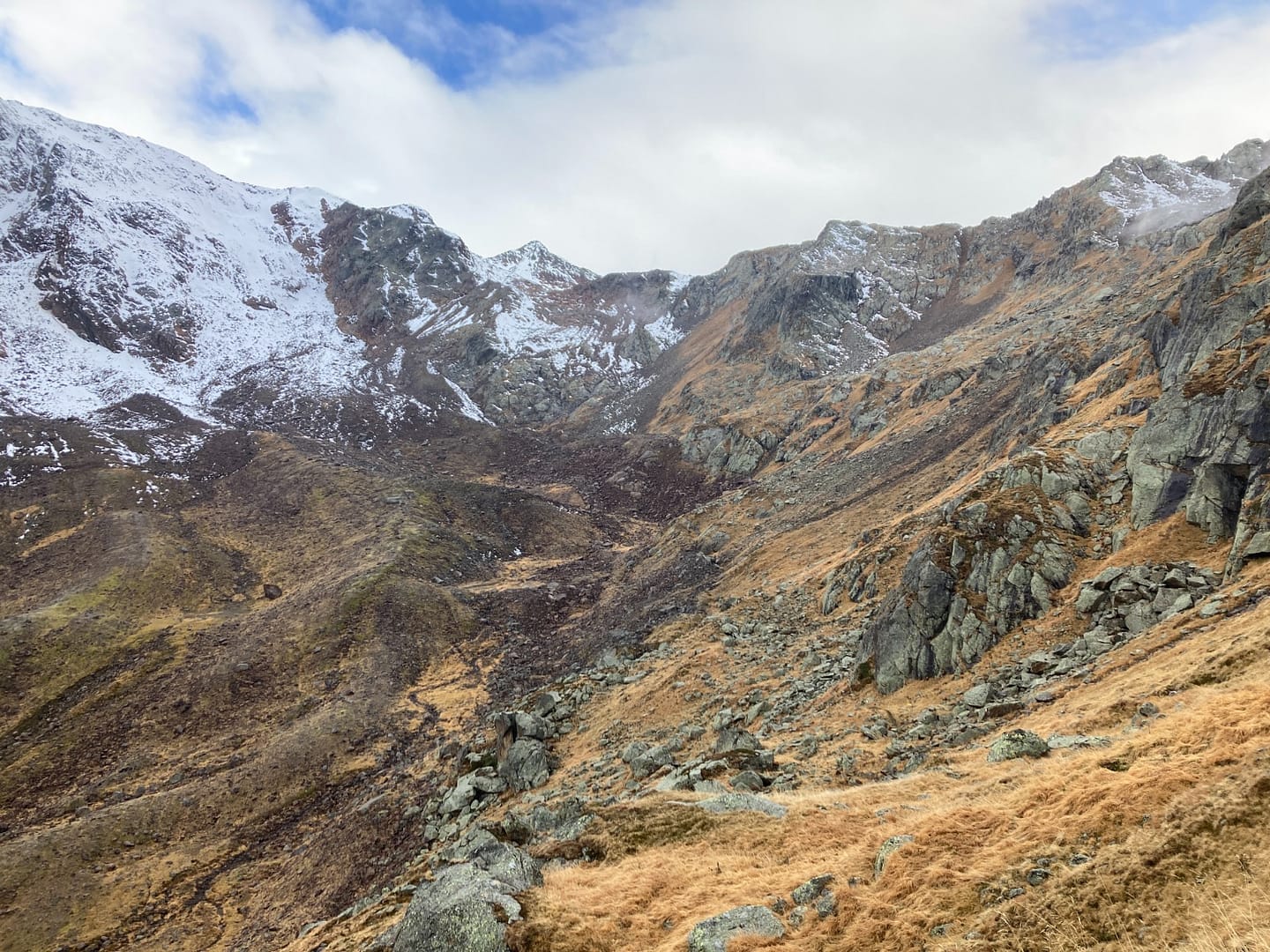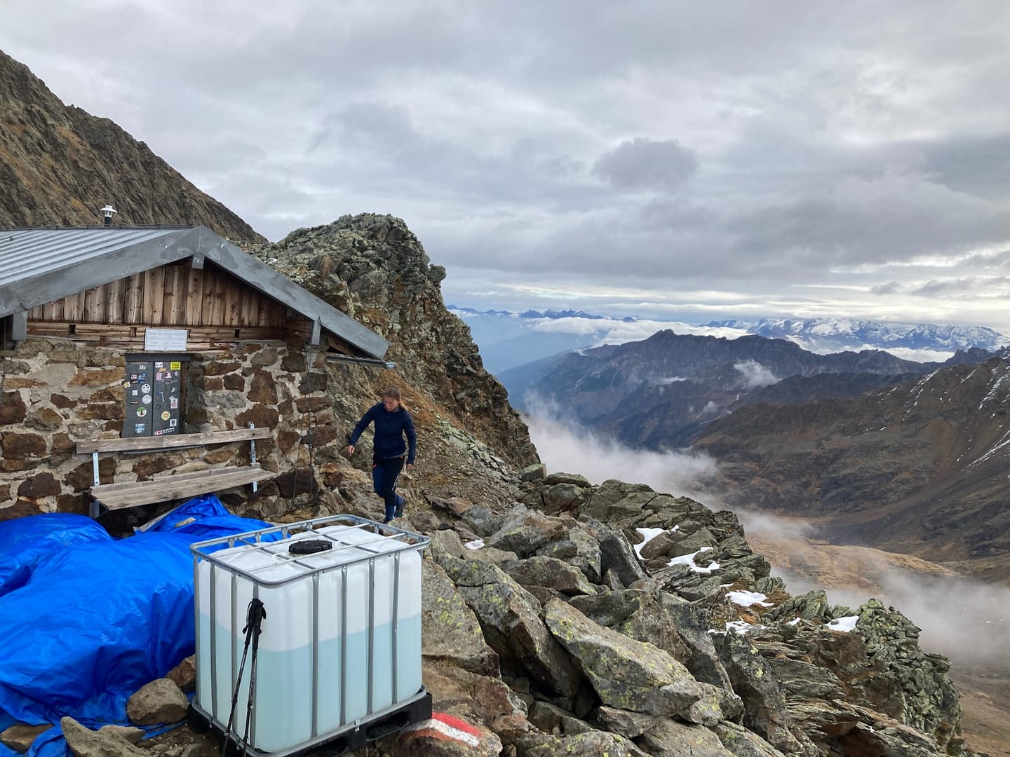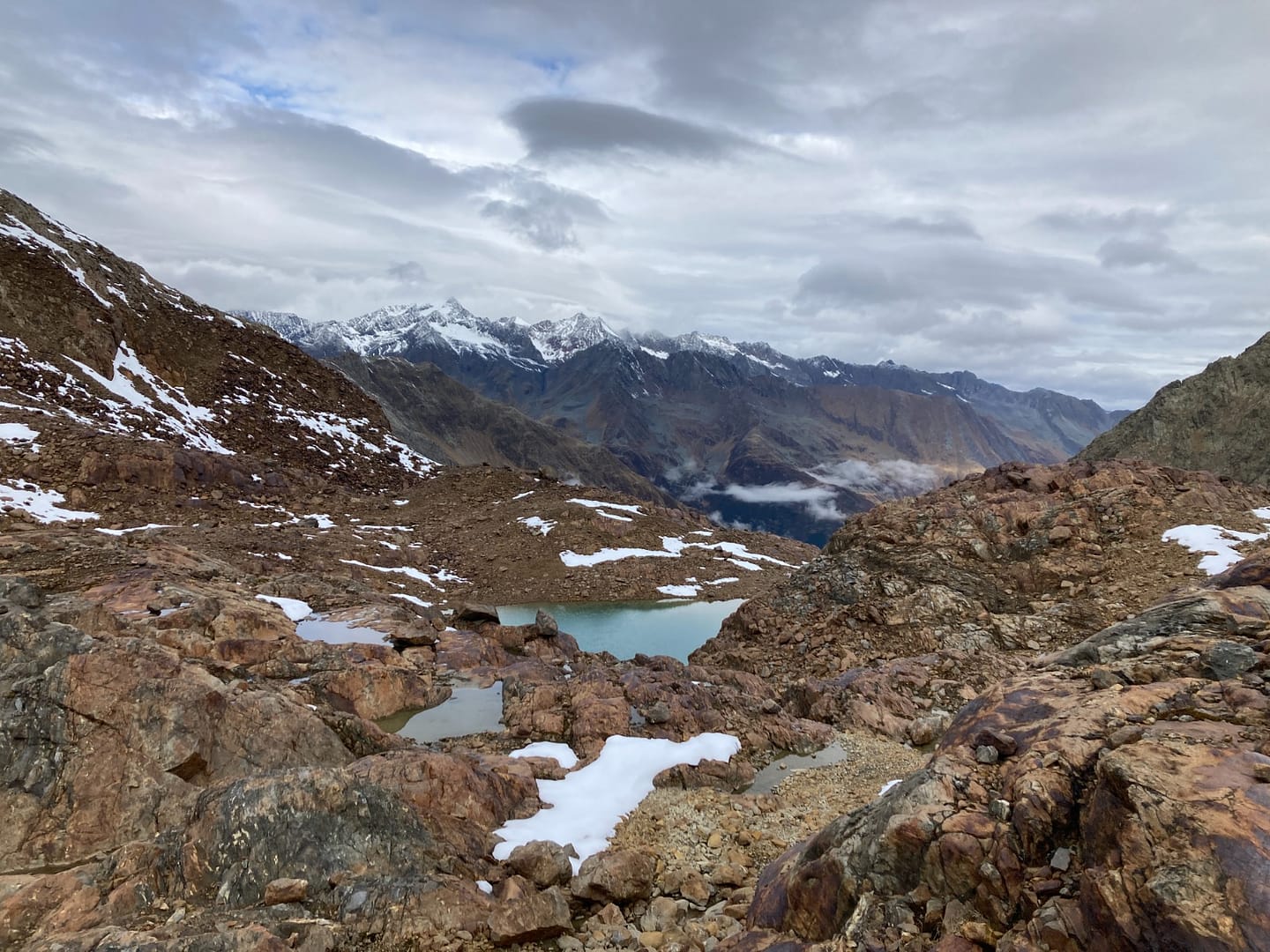 Von der Bremer Hütte folgen wir dem Stubaier Höhenweg zum Simmingjöchl auf 2.764 m. Die ersten 1,7 km haben nur eine leichte Steigung, bzw. verliert man kurz nach der Hütte einige Höhenmeter, weil die Felsrippe von der Inneren Wetterspitze so tief ragt, dass man diese umgehen muss. Am tiefsten Punkt des Weges führt ein Steig über den Grenzkamm zur Magdeburger Hütte in Südtirol ab. Bis auf ca. 2.600 ist es ein mäßig ansteigender Pfad, jetzt wird es steiler und führt teilweise seilversichert durch eine brüchige Rinne zur Zollhütte hinauf.