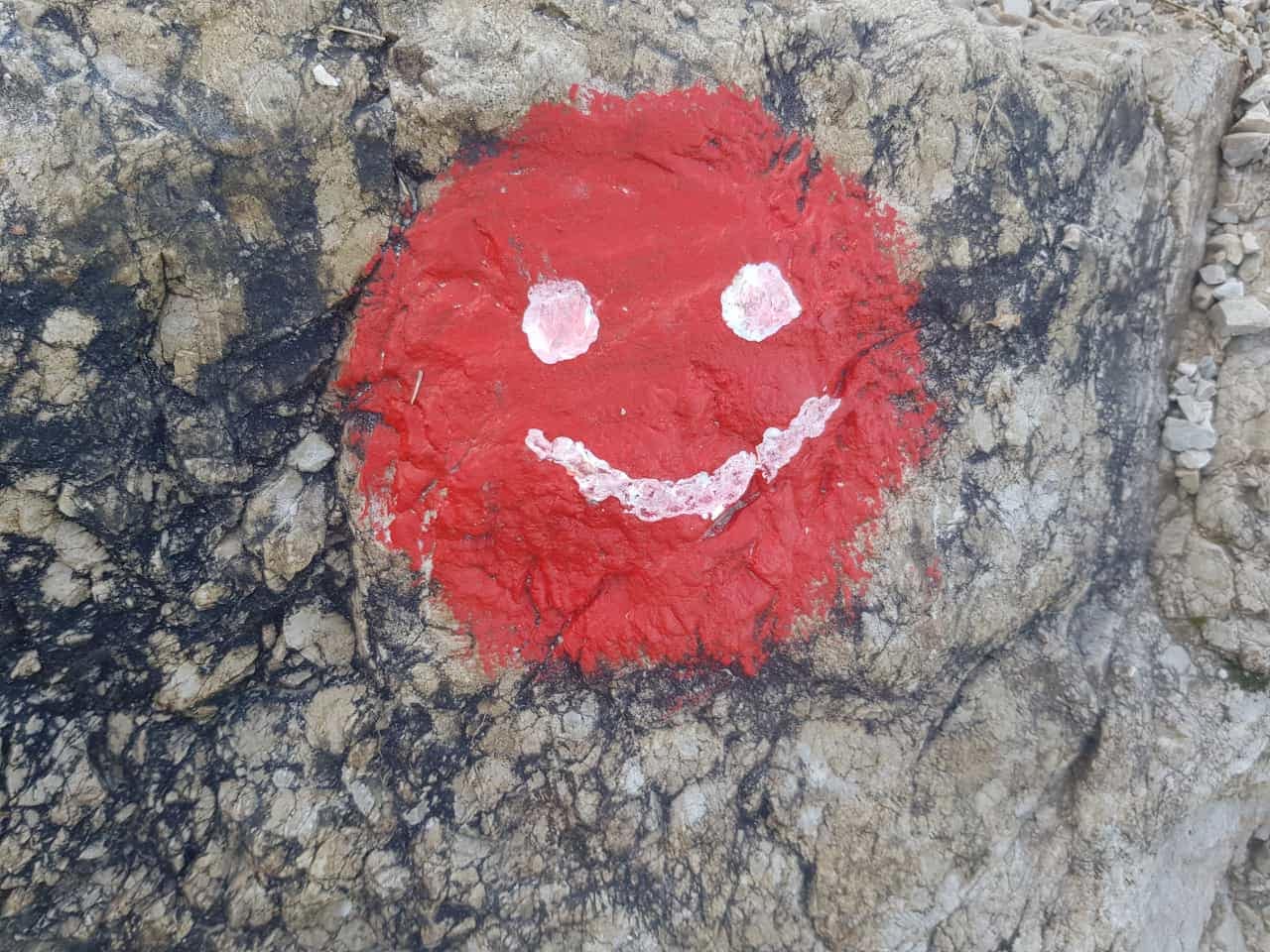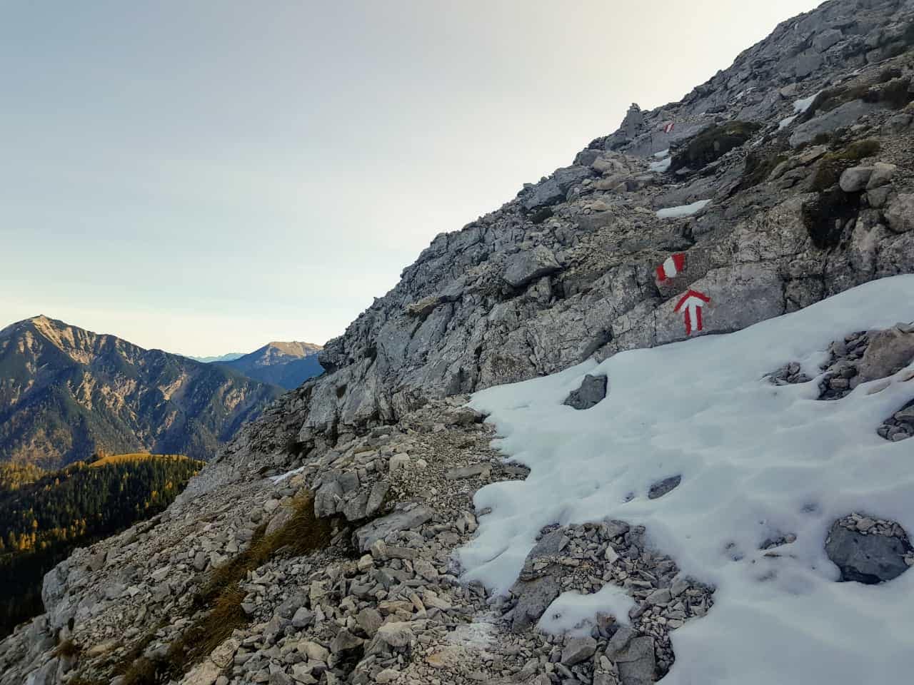 Vom Plumssattel halten wir uns links und gehen direkt auf den Nordhang des Gipfels zu (Wegweiser vorhanden), wo man erst durch ein paar Latschengassen läuft. Diese werden schnell rare und man steigt eine steilere Rinne und später im Verlauf ein Geröllfeld hoch. Der Weg ist nicht nur mit den üblichen Markierungen verziert, sondern ab und an (wenn man die Augen aufhält) findet man auch Smilies – hier hatte jemand Spaß bei seiner „Arbeit“. Trotz der minimalen Schneefelder haben wir es ohne Probleme zur Bettlerkarspitze Vorgipfel geschafft und eine kleine Rast eingelegt um die Aussicht zu genießen.