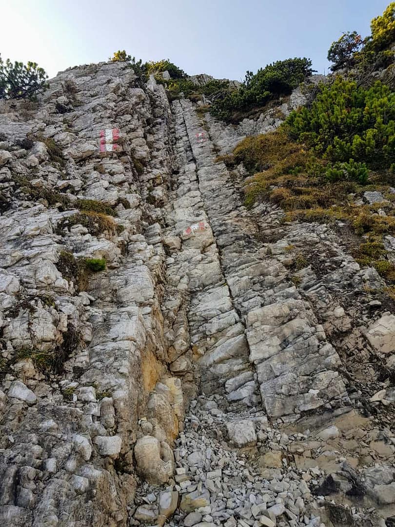 Von dem Vorgipfel führt der Grat mit einigen Kletterpassagen auf den anspruchsvolleren Hauptgipfel der Bettlerkarspitze. Die Markierungen sind nun gelb, ab und zu muss man etwas suchen, da diese bereits etwas ausgeblichen sind, aber im Grunde ist der Pfad doch recht gut zu erkennen. Die Schlüsselsteller von dieser Gratwanderung ist ein kleiner Überhang, welcher mit einem Fixseil gesichert ist. Persönlich bin ich links davon hoch geklettert und habe das Seil nicht benötigt und somit auch den Überhang ausgewichen.