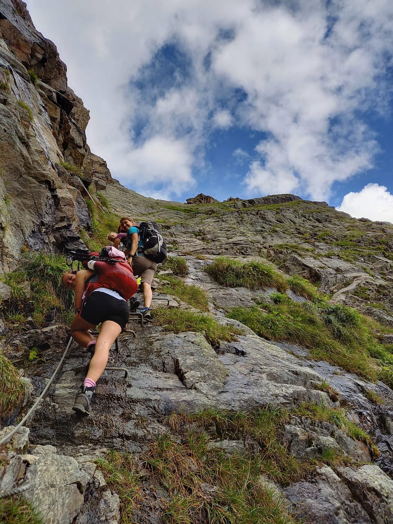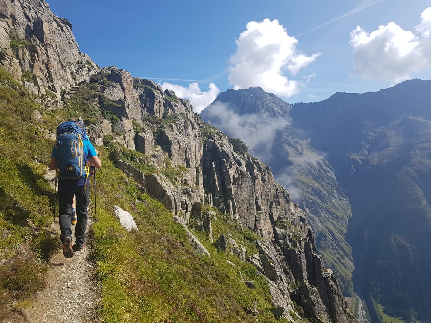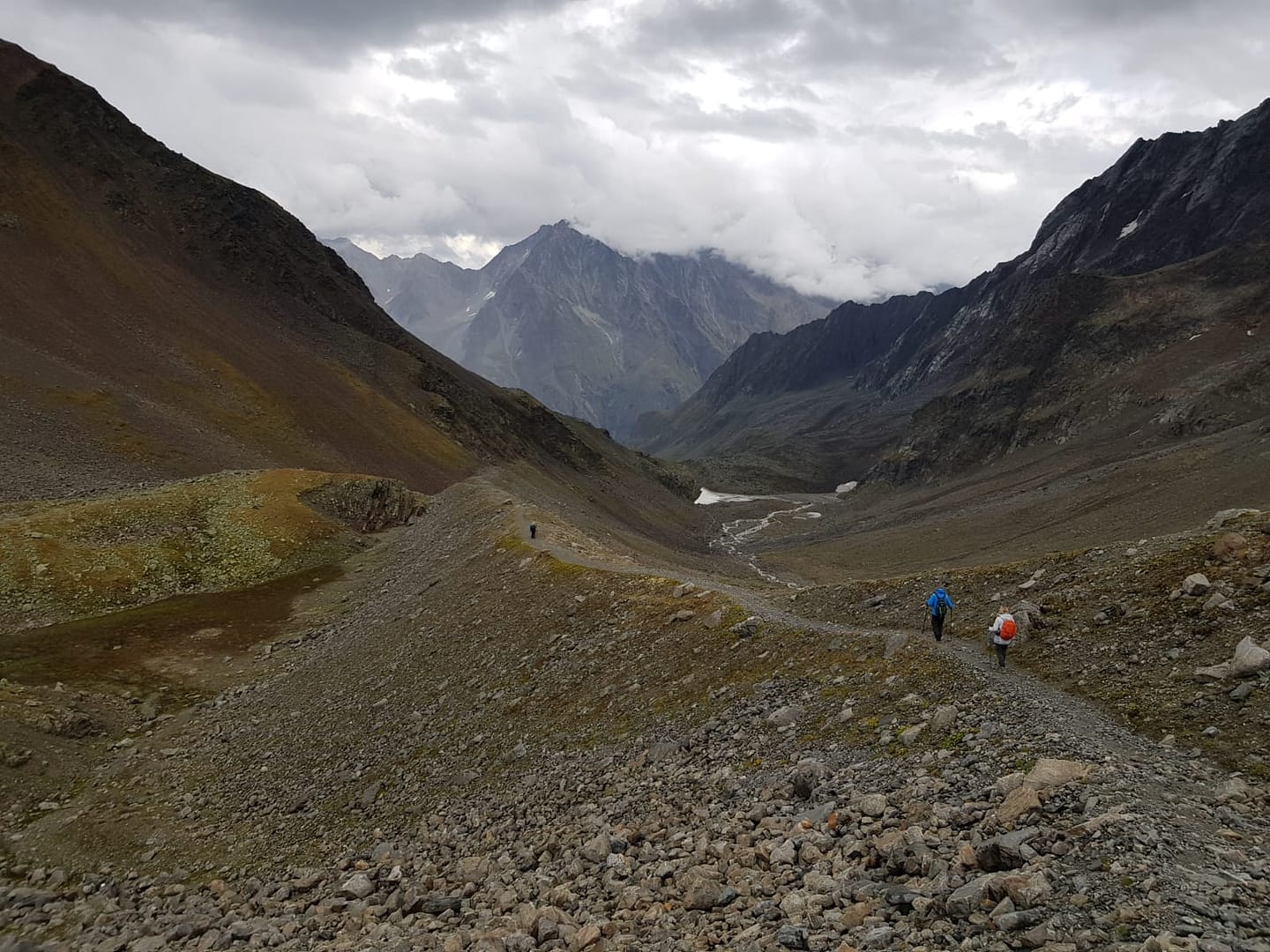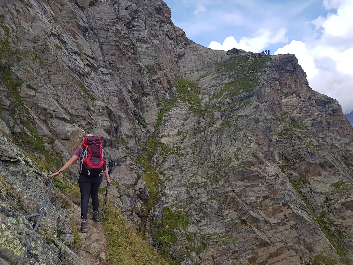 Vom Brandkogel klettert man den gleichen Weg wieder runter bis zur Abzweigung und folgt dem Höhenweg links weiter Richtung Kaunergrathütte. Ein auf und ab begleitet uns um den Berg herum, vor dem letzten Stück geht es nochmal ein gutes Stück runter bis es dann seilversichert auf der anderen Seite wieder hoch hört (1. Bild). Quert man dann die Kurve sieht man von Weitem bereits die Hütte (4. Bild). Links am Hang haltend führt der Pfad langsam und allmählich zur Hütte hoch.