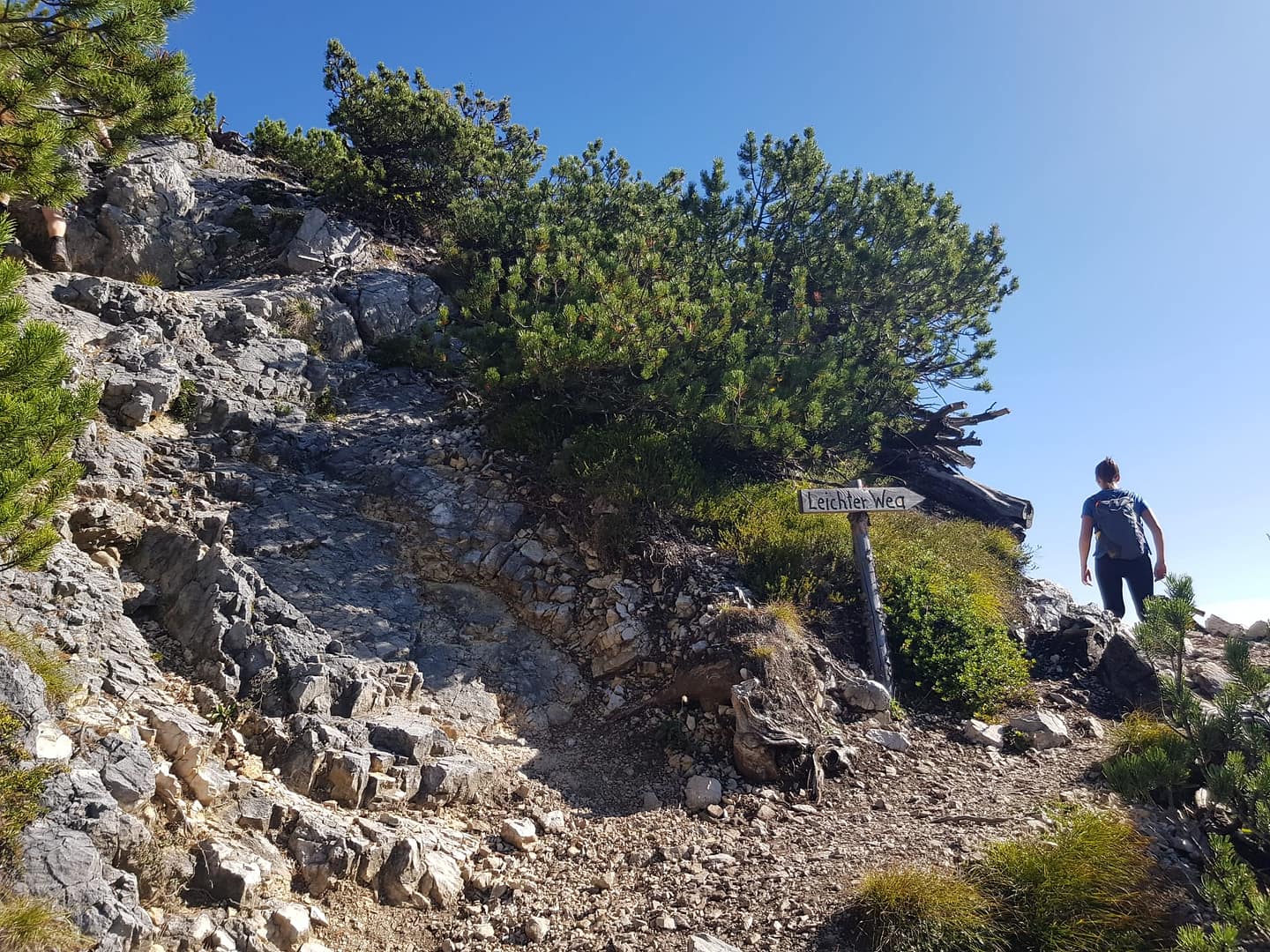 Vom Alpengasthof Astenau folgt man weiter den Wegweisern zum Reither Kogel. Der Pfad schlängelt sich durch die Latschen in vielen Schlängellinien den Berghinauf. Auf 1.545 m gibt es eine Abzweigung, rechts über den Felsen und links „leichter“ drum herum, nach 30 hm treffen die Pfade wieder aufeinander. Hoch haben wir den rechten gewählt, runter den linken, ob der nun wirklich leichter ist liegt im Auge des Betrachters.