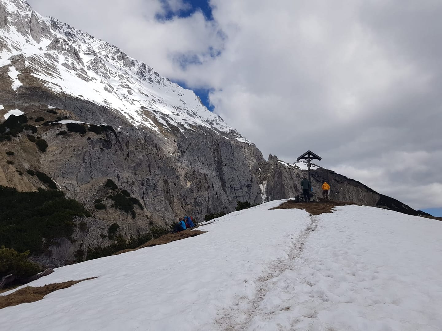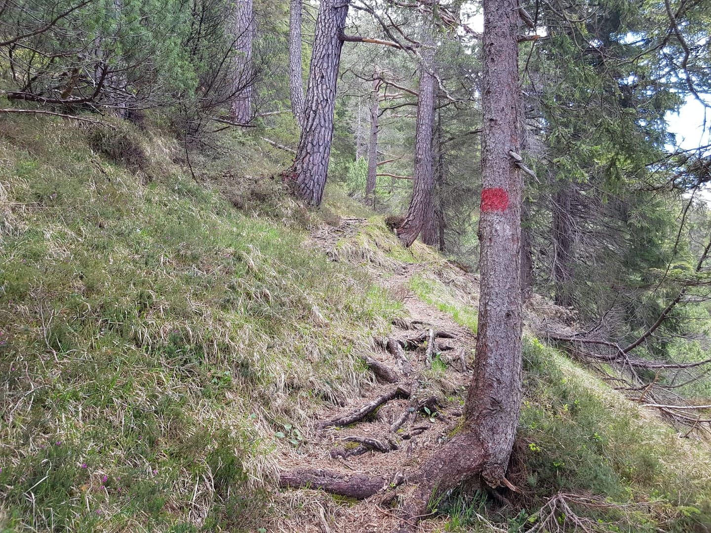 Ab hier folgen wir der Beschilderung auf den Steig, landen kurz in der sehr breiten Rinne, wo noch Schnee liegt und steigen dort über das Schneefeld so weit auf bis rechts eine weitere Beschilderung in den Wald zeigt. Leicht ansteigend geht es nun durch den Wald und auf den südöstlichen, breiten Rücken rauf bis zu einer Lichtung und von dort weiter auf den Südrüclen bis zum Gipfelplateau.