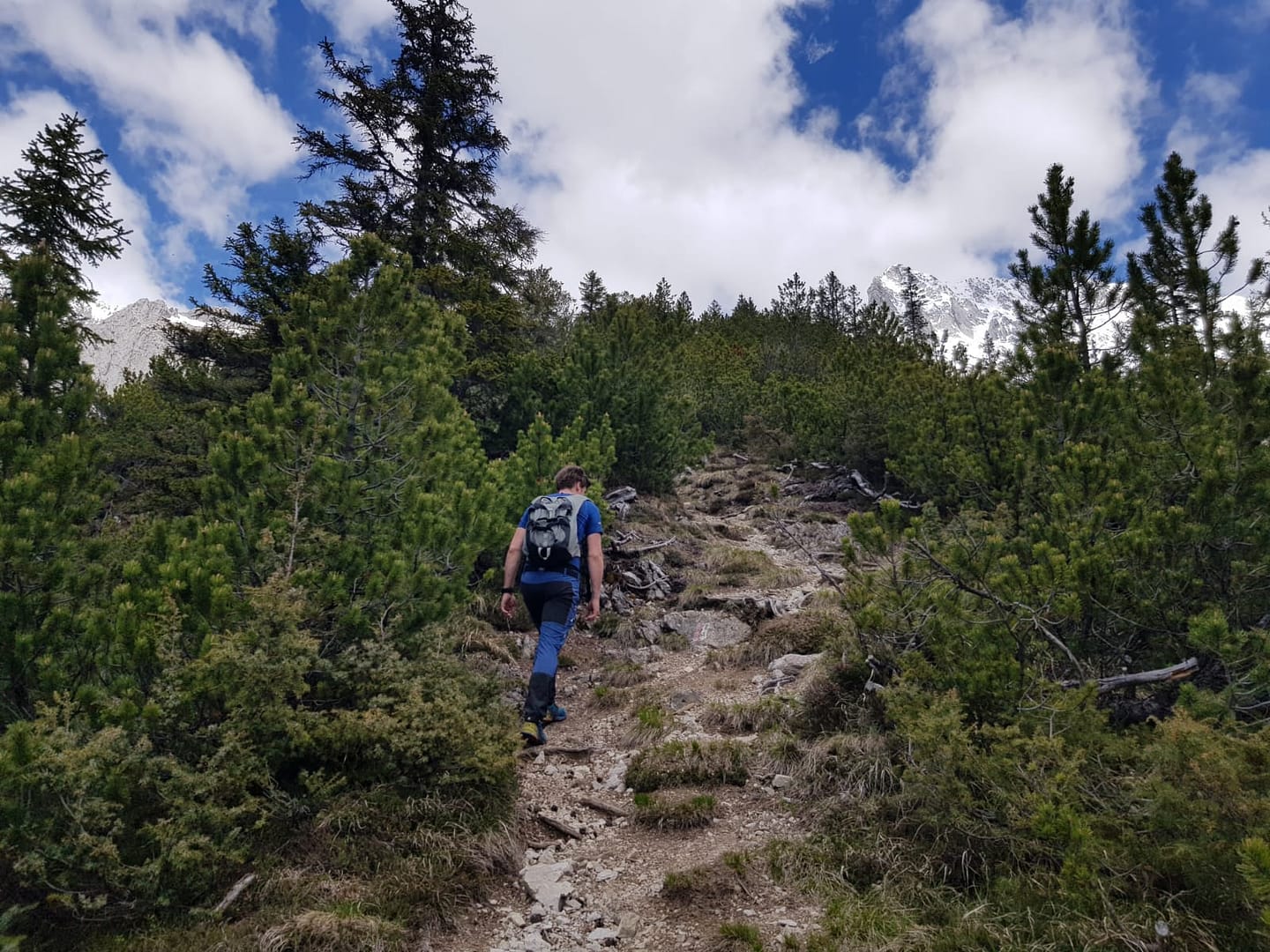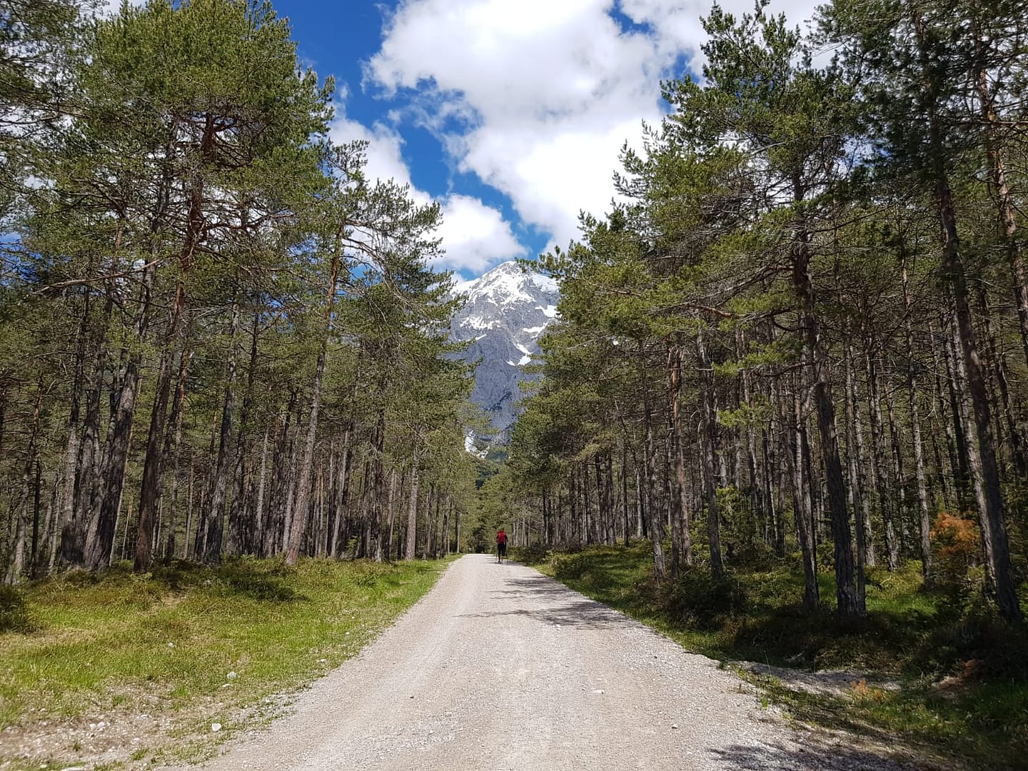 Bei der Abzweigung der Stöttalm geht es für uns nach links, wo der Gacher Blick bereits ausgeschildert ist. Der Forstweg ist recht flach und führt durch den lichten Wald, wo schon sehr viel weniger Menschen auf dem Weg sind, denn die meisten biegen rechts zur Alm ab. Bald wird der Forstweg steiler und führt in zahlreichen Serpentinen zum Bike-Parkplatz.