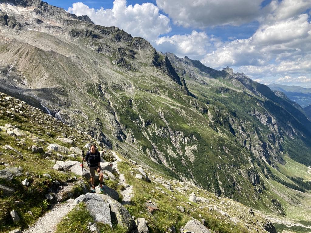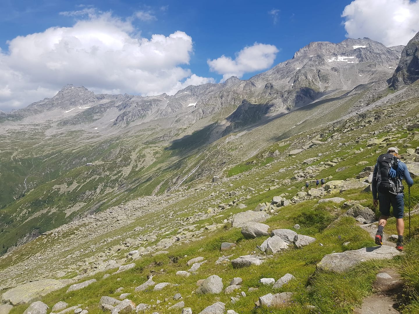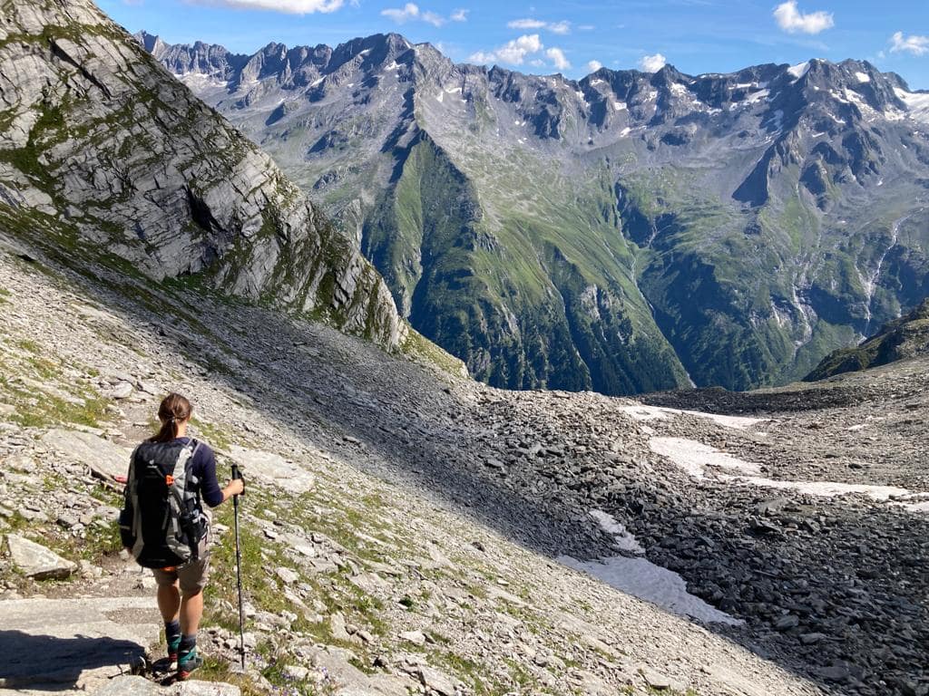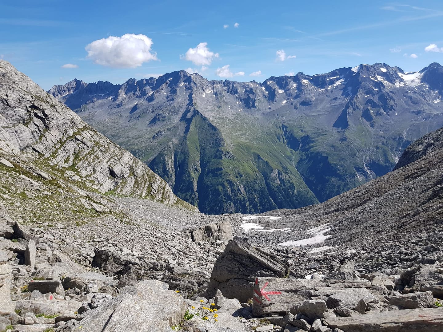 Zurück bei der Abzweigung und somit auf dem Berliner Höhenweg schnappen wir unsere Rucksäcke und machen uns auf den Weg zur Scharte, welche wir nach ca. 210 Höhenmeter erreichen. Uns eröffnet sich ein mega Panorama ins Stilluptal und in der Ferne sehen wir die Hütte, unser Ziel.
