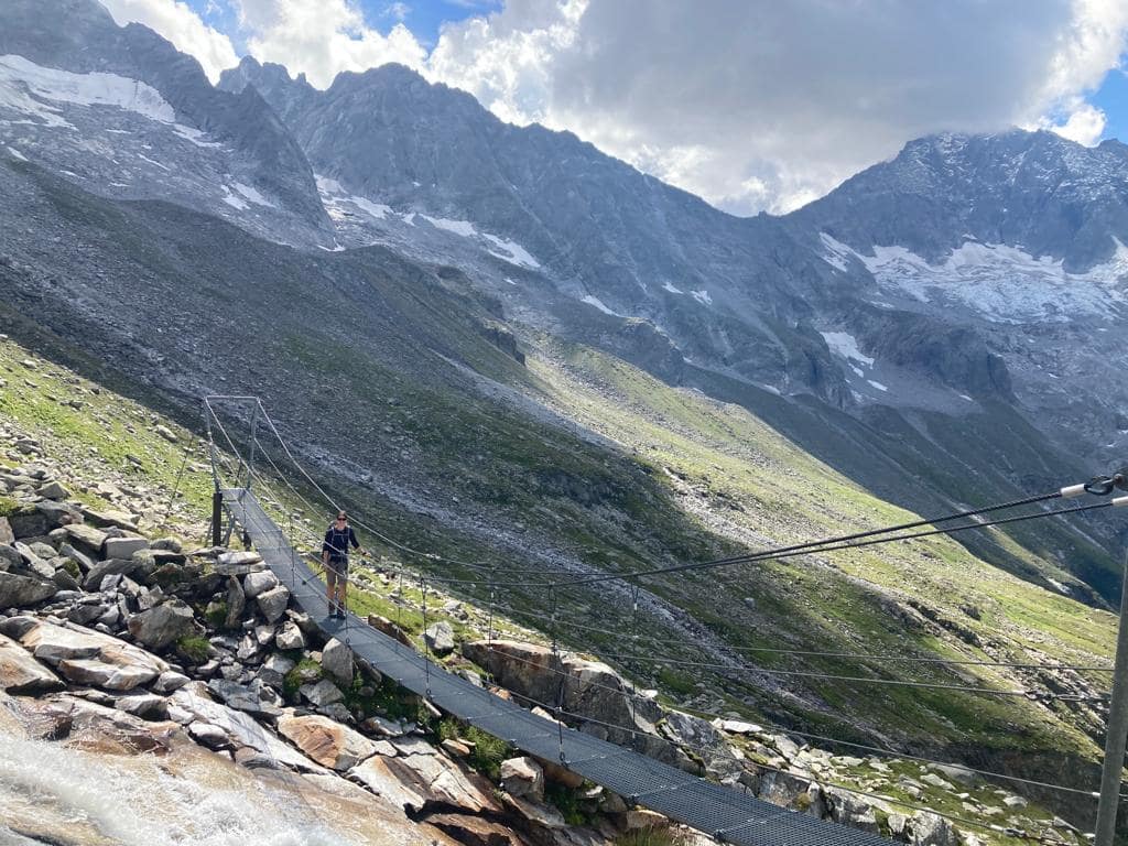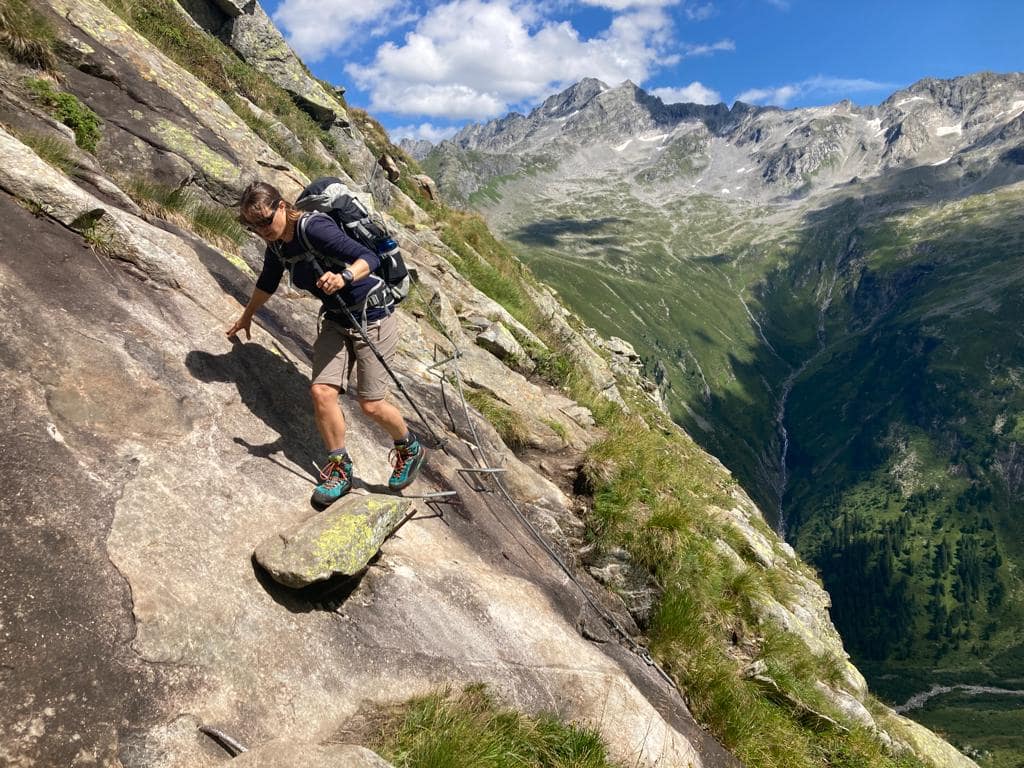 Zunächst führt der Wanderpfad im großen Rechtsbogen im leichten auf und ab um die Gipfel Lappenspitze und Greizer Spitze rum. Nachdem wir eine Holzbrücke überquert hatten, kamen noch weitere interessante „Hindernisse“ auf uns zu. Bei den besonders steilen und abschüssigen Wegstücken gab es ein Seil zur Unterstützung, ansonsten sollte man sehr Trittsicher und schwindelfrei sein. Die Naturgewalten haben auf diesem Weg aber auch seine Spuren hinterlassen, einige Stahlsicherungen sind nicht mehr begehbar/nutzbar, auch Wegstücke sind z.B. durch Muren Abgänge weggebrochen. Unter dem Löfflerkees geht es weiter im Linksbogen über grasige und schottrige Hänge zur Hütte. Kurz vorm Ende gibt es noch eine große Hängebrücke, die über den Stillupbach führt.