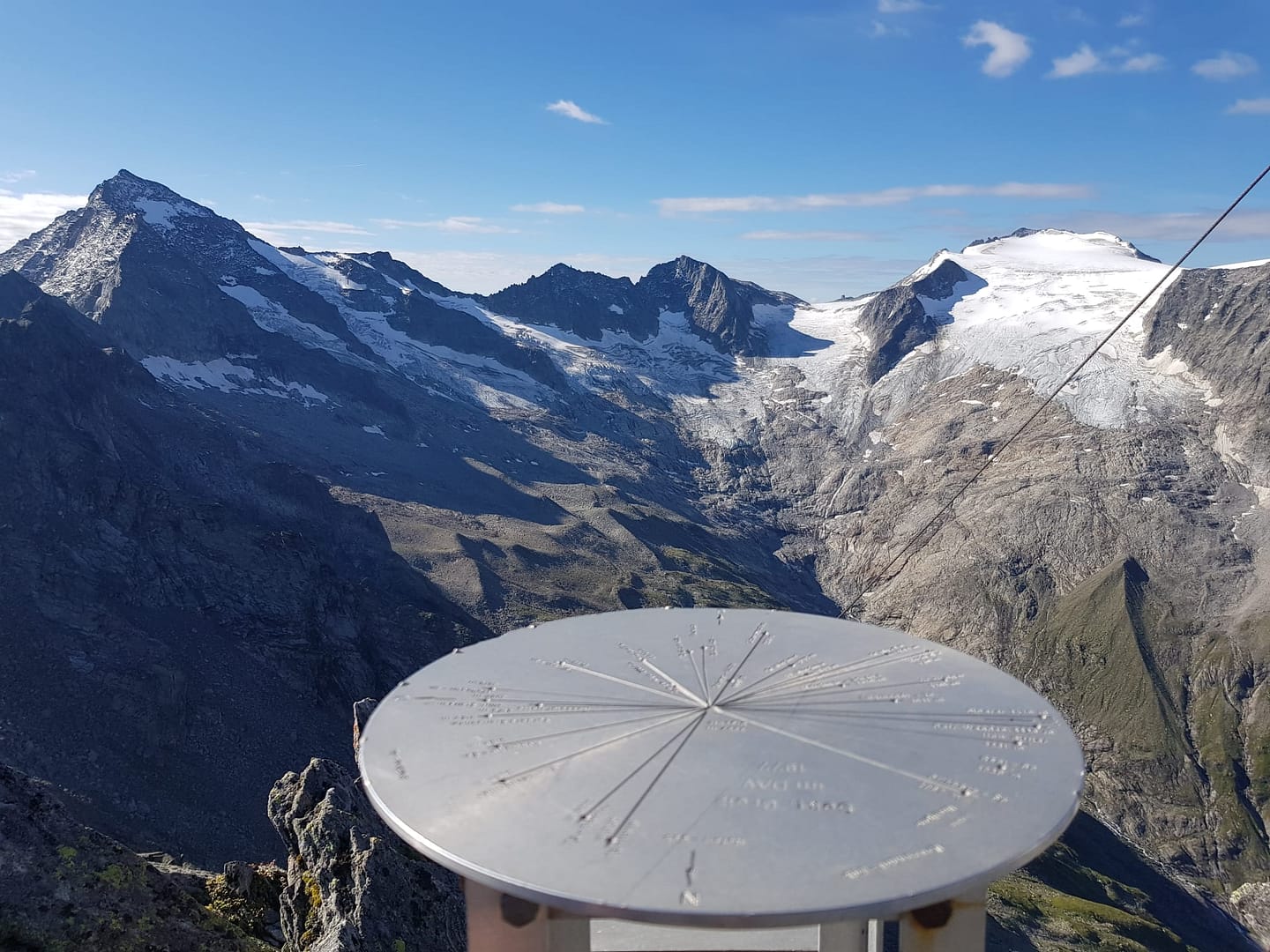 Der Pfad führt uns über ein Geröllfeld auf den Grat hinauf, nicht wundern, auf der anderen Seite geht es kurz abwärts. Aus dem Pfad wird schnell ein steiler Steig, der meist auf der linken (westlichen) Seite des Grates raufführt. Erdige Hänge und felsige Stellen (UIAA I) wechseln sich kontinuierlich ab, aber es macht Spaß und man hat tolle Ausblicke auf die Nachbargipfel und die Gletscher. Kurz unterhalb des Gipfels wird es nochmal ein kleinwenig schwieriger, eine Rinne führt schlussendlich auf den Gipfelgrat und man erreicht das Gipfelkreuz.