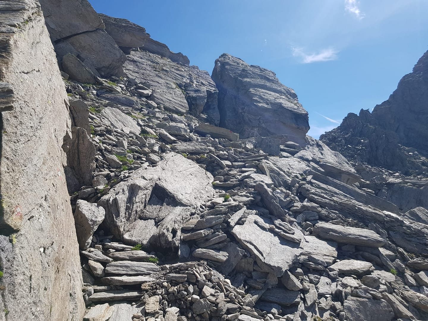 Angangs führt der Weg auf der linken Seite, entlang der Flanke des Gigalitz, über Geröll und Blockgelände abwärts. Auf 2.260 m erreichen wir eine weitere Weggabelung, wo wir uns rechts halten. Links geht es runter ins Tal, aber dieser Weg ist aufgrund von Steinschlag gesperrt.