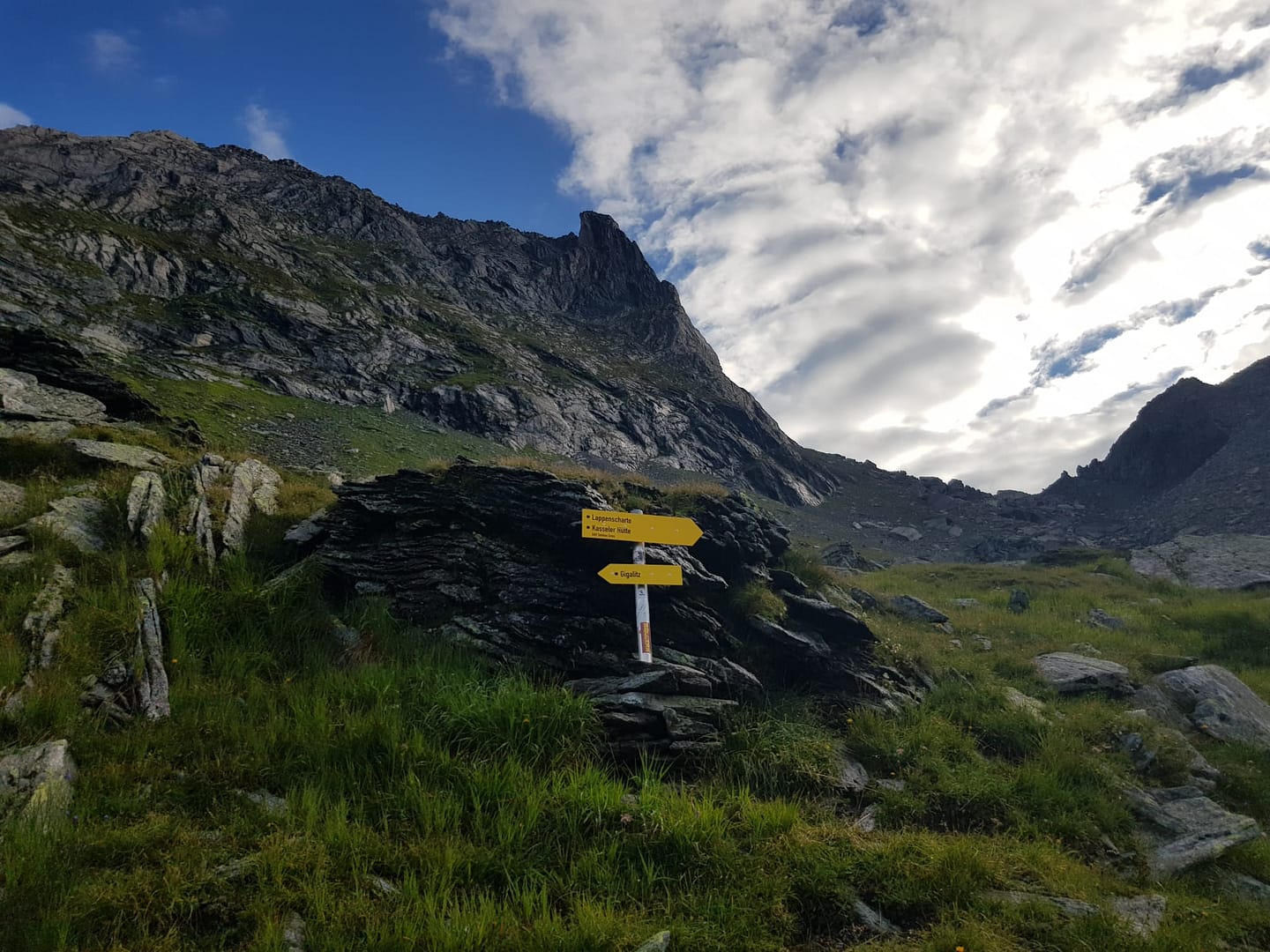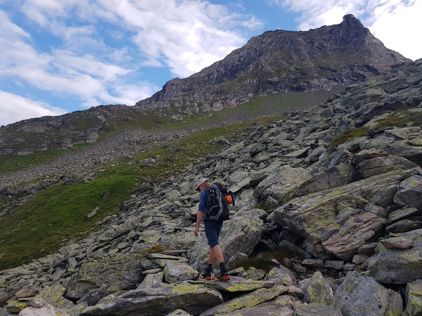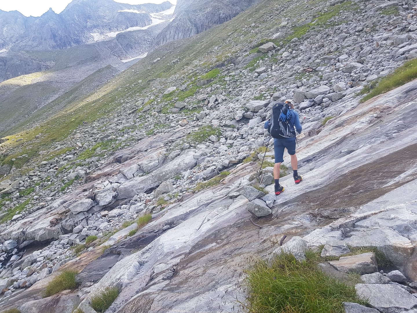 Der Wegweiser führt uns hinter der Hütte nach links Richtung Lapenscharte, der Pfad geht mäßig steil den Hang hinauf. Nach 1,5 km erreichen wir eine Abzweigung, wo wir uns wieder links halten. Kurz hinter dem Wegweiser hinter einem großen Felsen haben wir ein Rucksackdepot gemacht, da wir ja auch noch die komplette Gletscherausrüstung dabeihatten, die wir für diese Besteigung natürlich nicht benötigen, das Gewicht wollten wir uns für den Aufstieg ersparen.