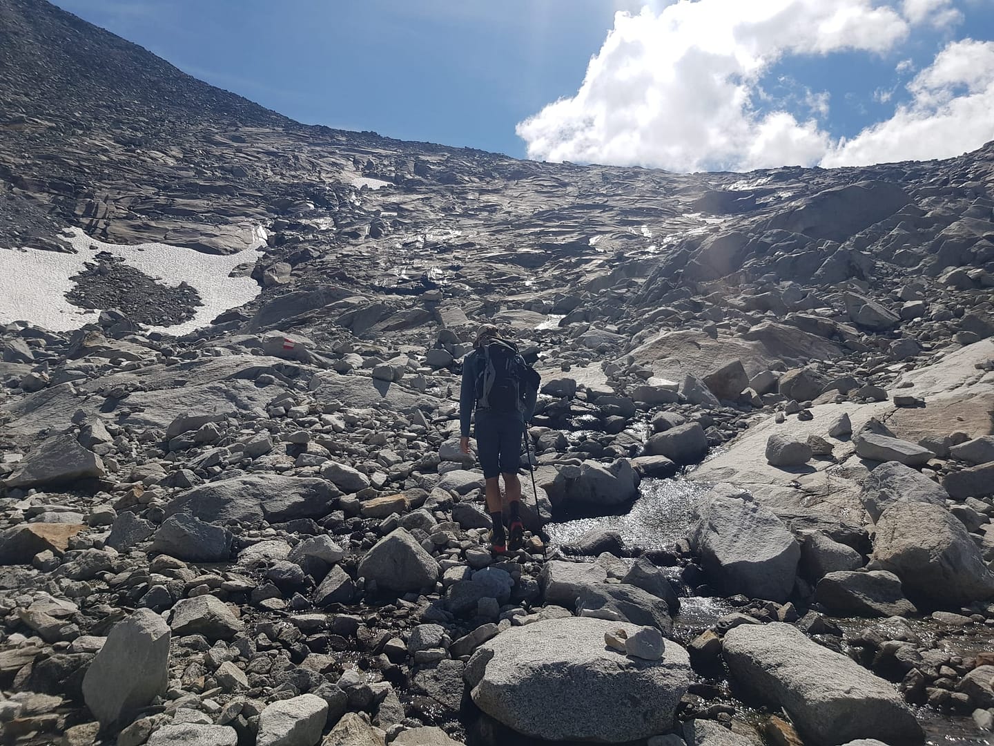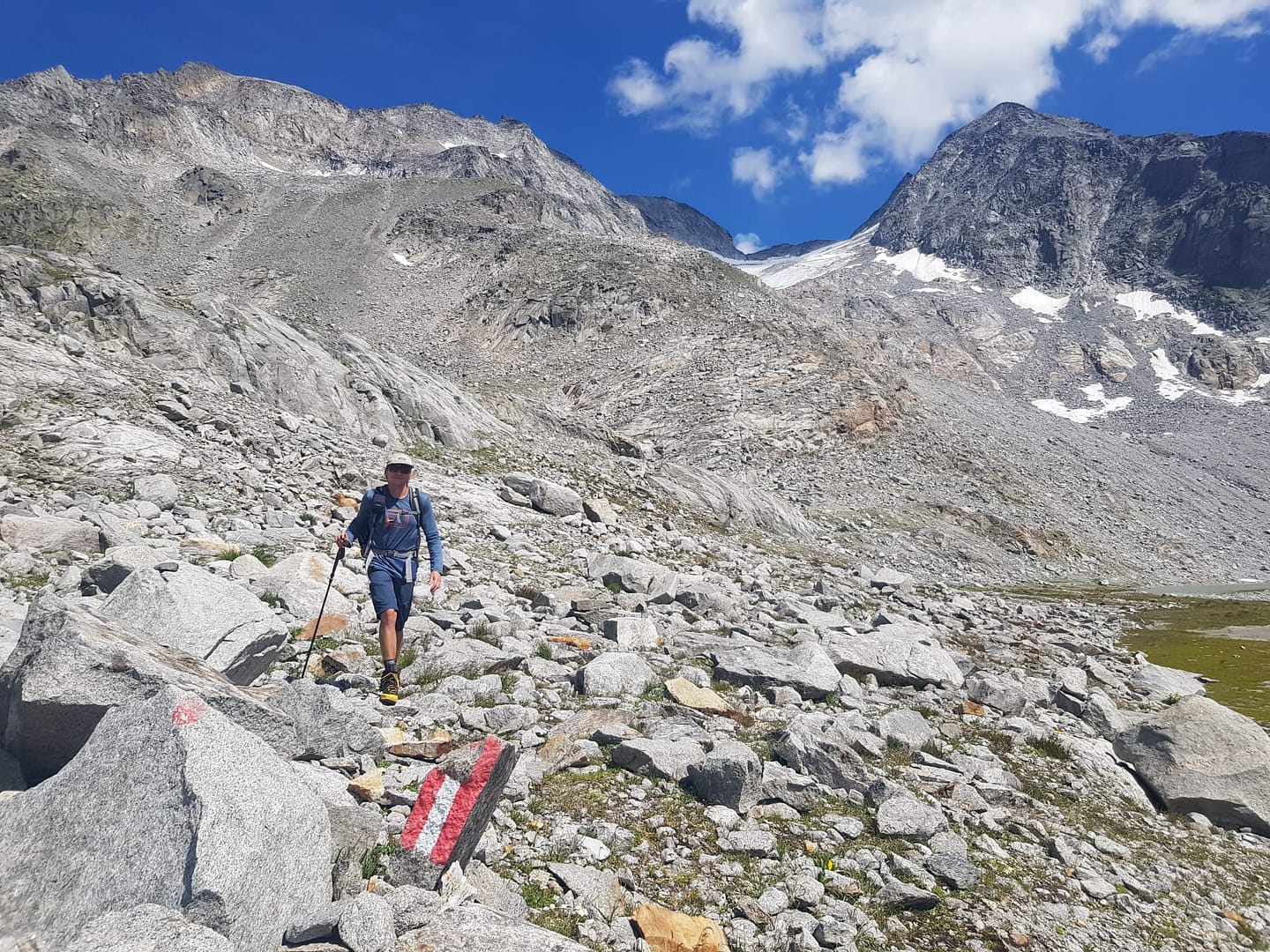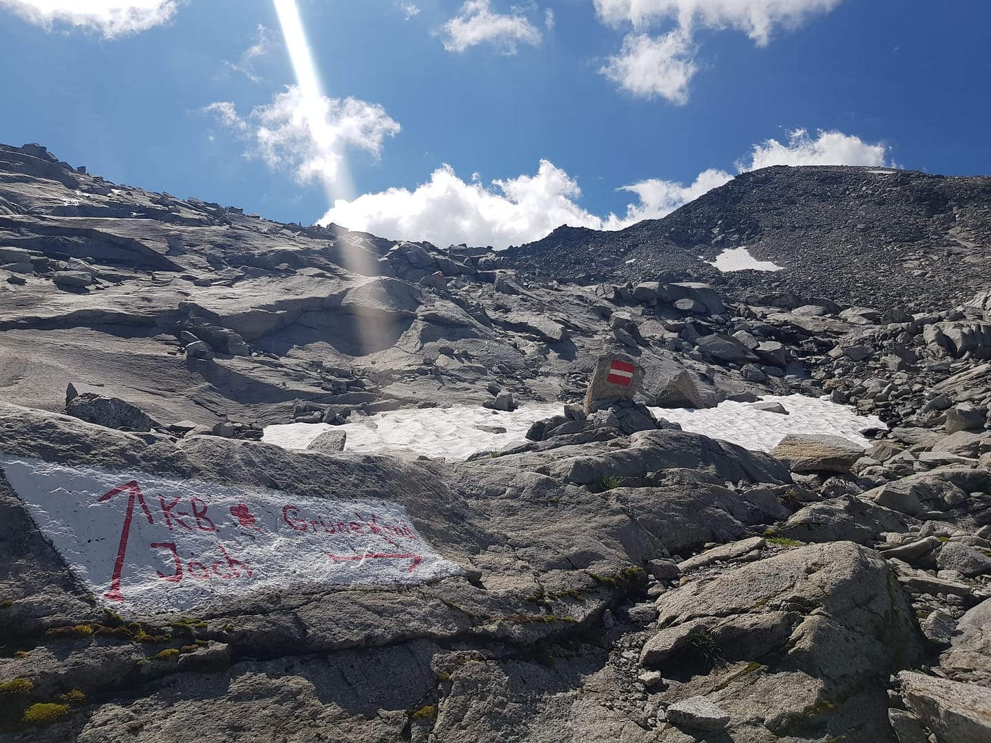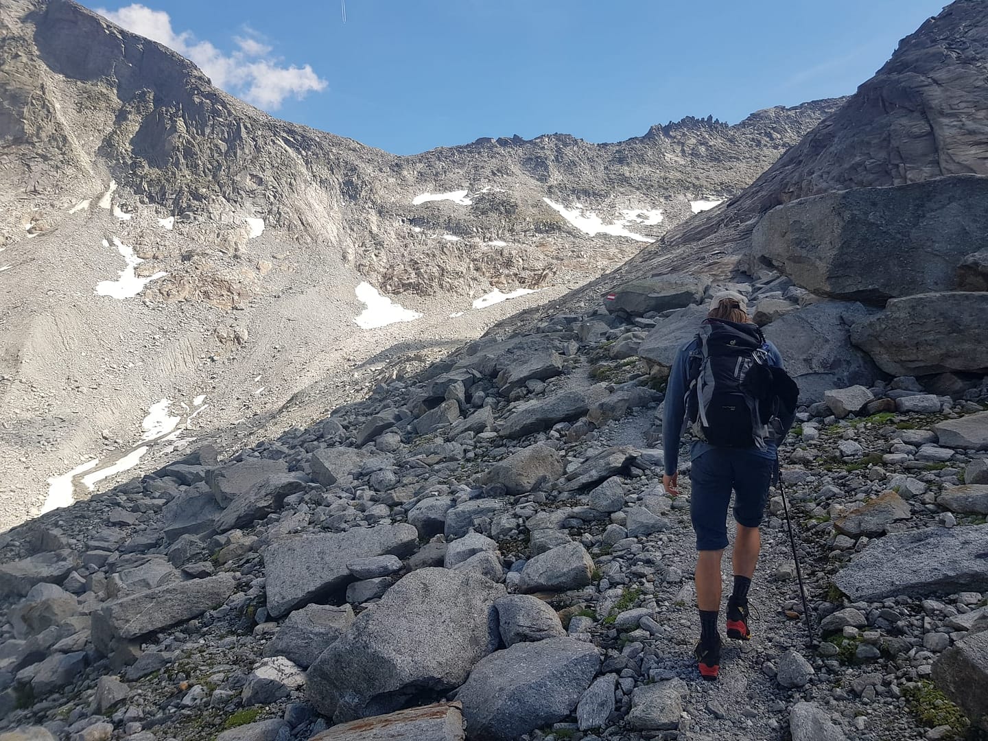 Von der Kasseler Hütte folgen wir dem Wegweiser ca. 500 Meter über den Berliner Höhenweg und zweigen dann nach links auf einen Pfad ab, der sich bergauf in das östliche Stilluppkees schlängelt. Karten weisen diesen Pfad auch mit dem Ahrntaler-Schmugglerpfad aus. Auf ca. 2.940 m erreichen wir das Kees, mit einem sehr „schlammigen“ Gletschersee. Den Stillupbach überquerend geht es weiter an der Bergflanke der Grünen-Wand-Spitze entlang Richtung Keilbachjoch. Geröll und Felsblöcke säumen das Gelände und hier und da gibt es noch ein paar Altschneefelder.