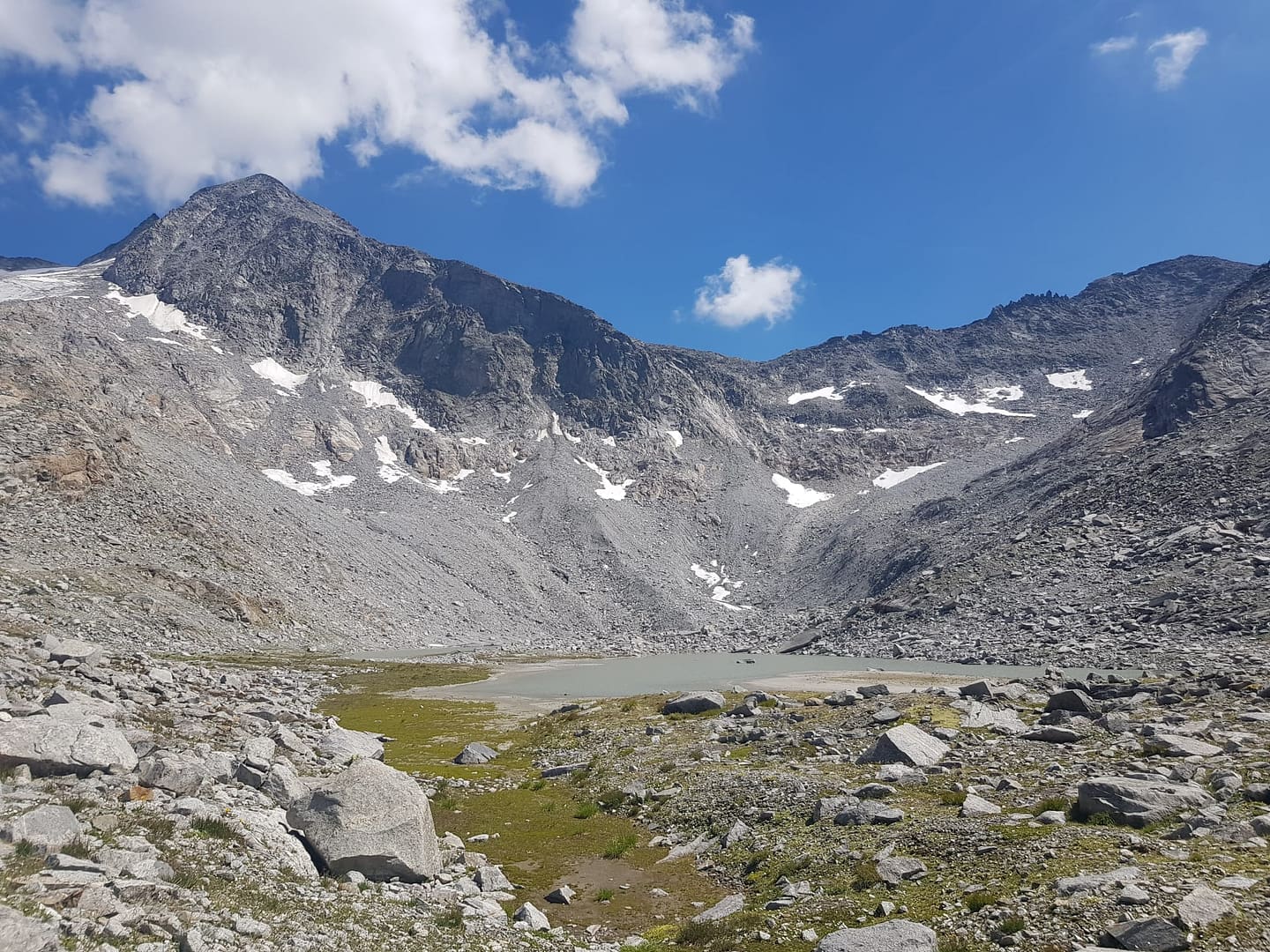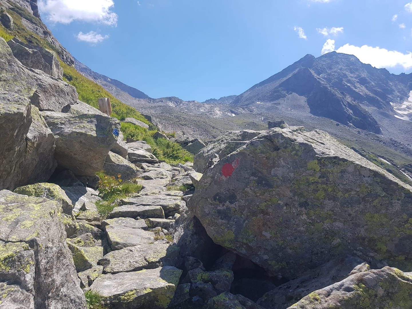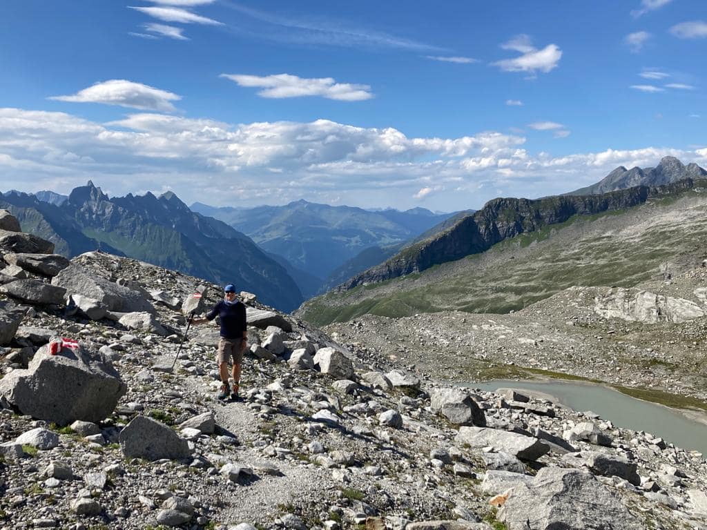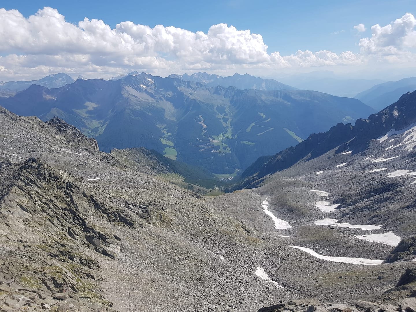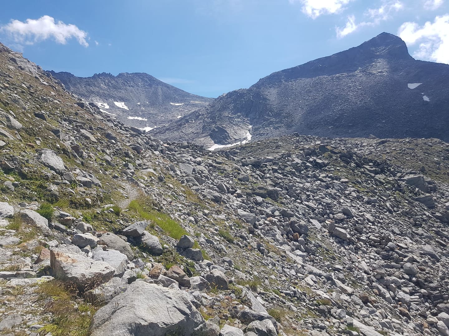 Von der Kasseler Hütte folgen wir dem Wegweiser ca. 500 Meter über den Berliner Höhenweg und zweigen dann nach links auf einen Pfad ab, der sich bergauf in das östliche Stilluppkees schlängelt. Karten weisen diesen Pfad auch mit dem Ahrntaler-Schmugglerpfad aus. Auf ca. 2.940 m erreichen wir das Kees, mit einem sehr „schlammigen“ Gletschersee. Den Stillupbach überquerend geht es weiter an der Bergflanke der Grünen-Wand-Spitze entlang Richtung Keilbachjoch. Geröll und Felsblöcke säumen das Gelände und hier und da gibt es noch ein paar Altschneefelder.