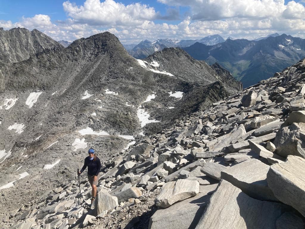ACHTUNG: Je nachdem welche Karte ihr habt, könnte es sein, dass der Weg bei euch schon früher abzweigt, als mein GPS Track. Der Weg und die Markeriungen sind alle neu gemacht, erst auf 2.710 m geht es rechts zum Gipfel rauf. Auch im weiteren Blockgelände sind die Markierungen alle gut sichtbar und führen einen leicht auf die Grüne-Wand-Spitze, von wo man einen tollen Ausblick auf die Nachbargipfel sowie ins Stilluptal wie bis nach Südtirol hat.