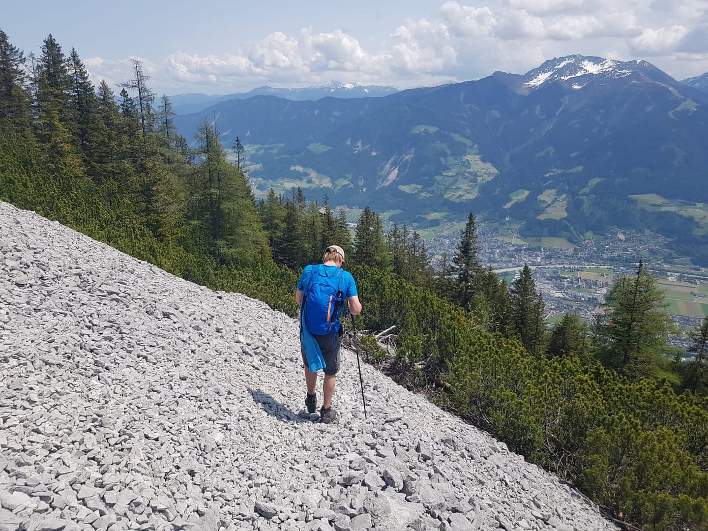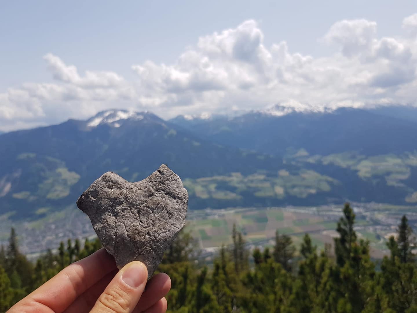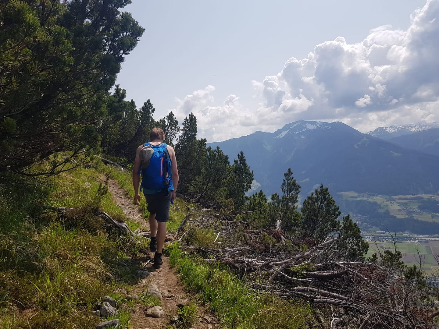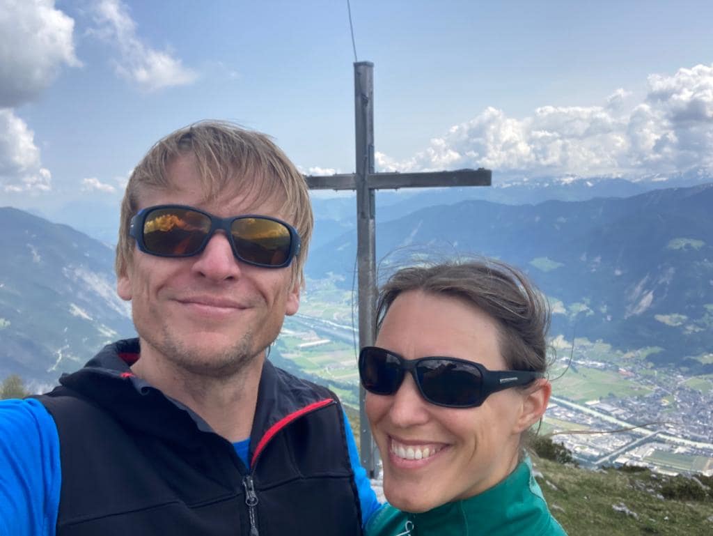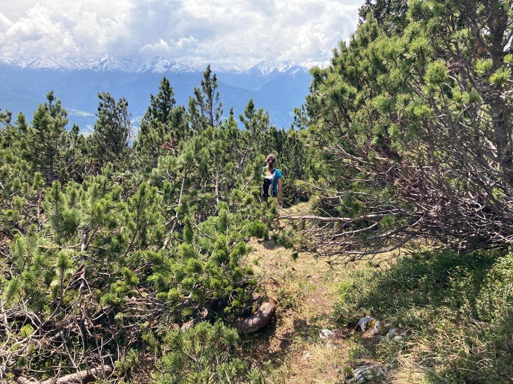Wir folgen weiter den Wegweisern: Von der Alm geht es oberhalb vom oberen Gebäude rechts am Waldrand vorbei. Im Wald haben uns, wie tags zuvor, die Ameisen wieder geärgert, die sind wohl noch nicht an Wanderer gewöhnt. Es geht wieder ein längeres Stück durch den Wald bis sich das Gelände wieder öffnet. Links über ein felsdurchsetztes Gelände und durch Latschen durch erreichen wir den Gipfel. Ein gigantischer Blick ins Inntal und auf die Berge des Karwendels laden zum Ausruhen und Staunen ein.