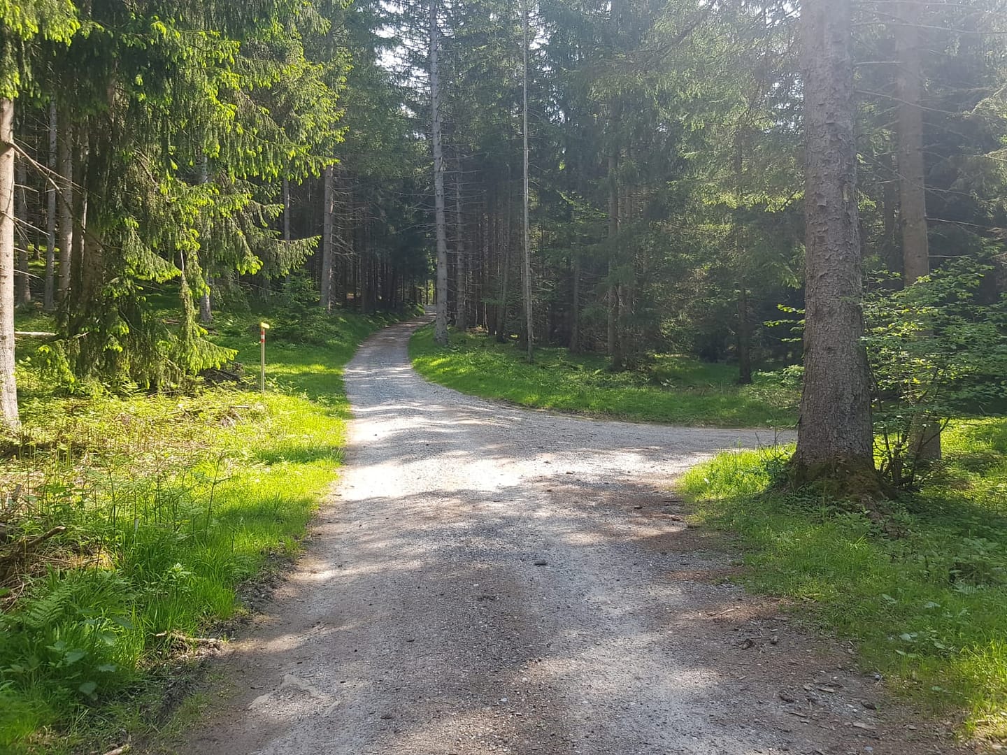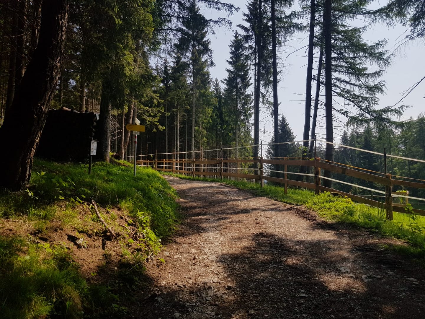 Vom Parkplatz (rechter Seitenstreifen) folgen wir der asphaltierten Straße bis zu einer Weggabelung, wo wir uns zuerst rechts halten und nach ein paar weiteren Metern links auf den Waldsteig abzweigen. Der Steig führt steil in einigen Kehren hinauf auf 1.020 m, wo wir eine Forststraße queren. Nach weiteren 30 Höhenmetern durch den Wald kommen wir wieder auf die Forststraße. Diese folgen wir bis zu einer eingezäunten Wiese (4. Bild), gegenüber weist ein Schild links in den Wald Richtung Waldhornbalm/Hirschkopf.