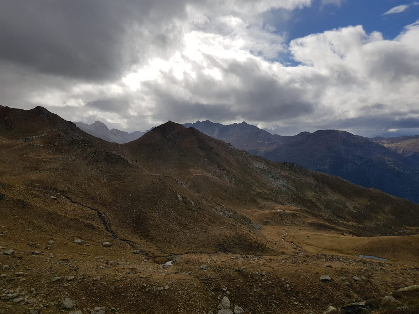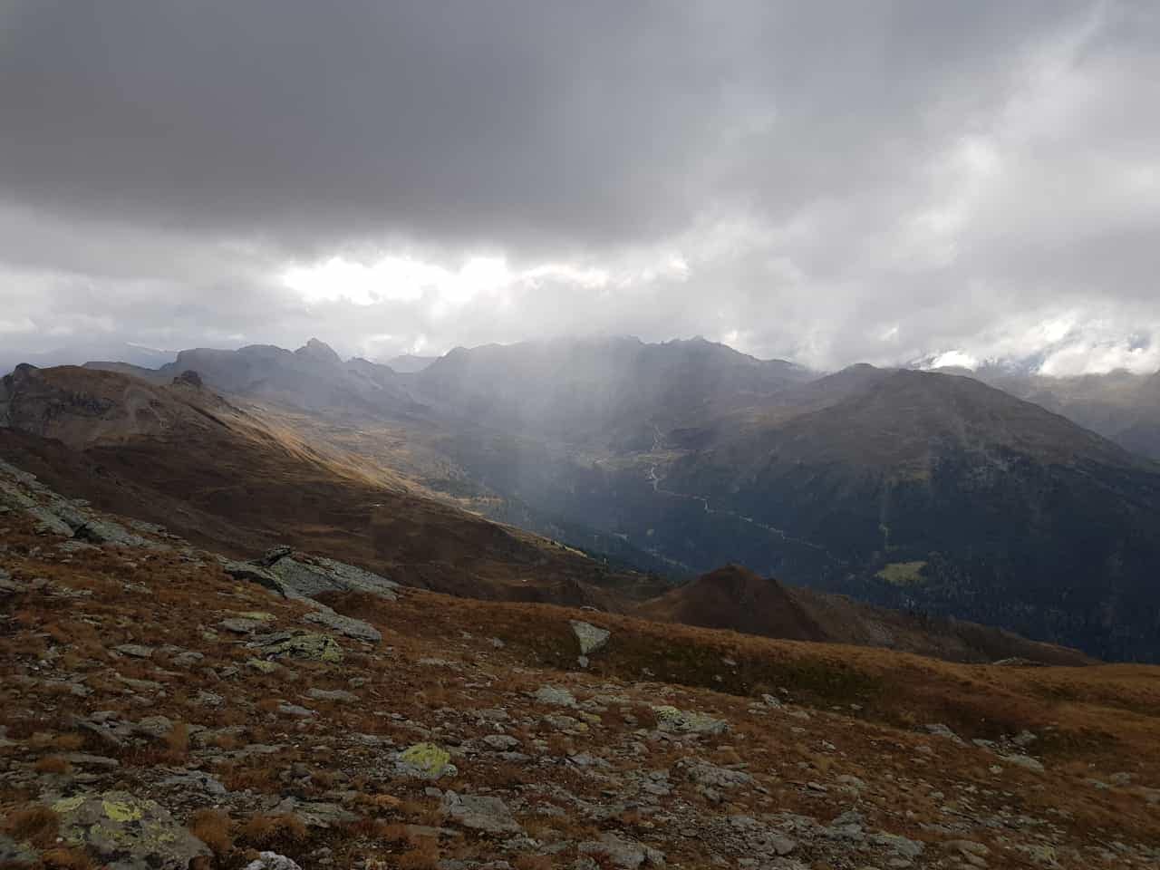 Vom Hochleger geht es weiter über einen Karrenweg auf einen breiten Geländerücken, von wo man einen tollen Ausblick hat. In südöstliche Richtung führt der Pfad zu einem wasserreichen Gebiet und links am Bach entlang aufwärts, wenig später kreuzen wir den schmalen Bach und es geht weiter hinauf zur Senke. Hier zweigt der Weg zum Lanner Kreuz nach rechts ab, zum Hirzer geht es allerdings in einem großen Linksbogen in nördliche Richtung weiter. Kurz über einen steilen Hang und dann über den Grasrücken weiter rauf. Man erreicht ein sperrenden Felsriegel, welcher rechts am Felssteiglein umgangen wird und am felsigen Nordwestrücken weiter aufwärts. Kurz vor dem Gipfel in eine Senke und zuletzt durch eine breite Felsrinne auf den Hirzer. Uns wirbelten die ersten Schneeflocken bereits um die Nasen, deswegen haben wir den atemberaubenden Ausblick nicht so lang genossen.