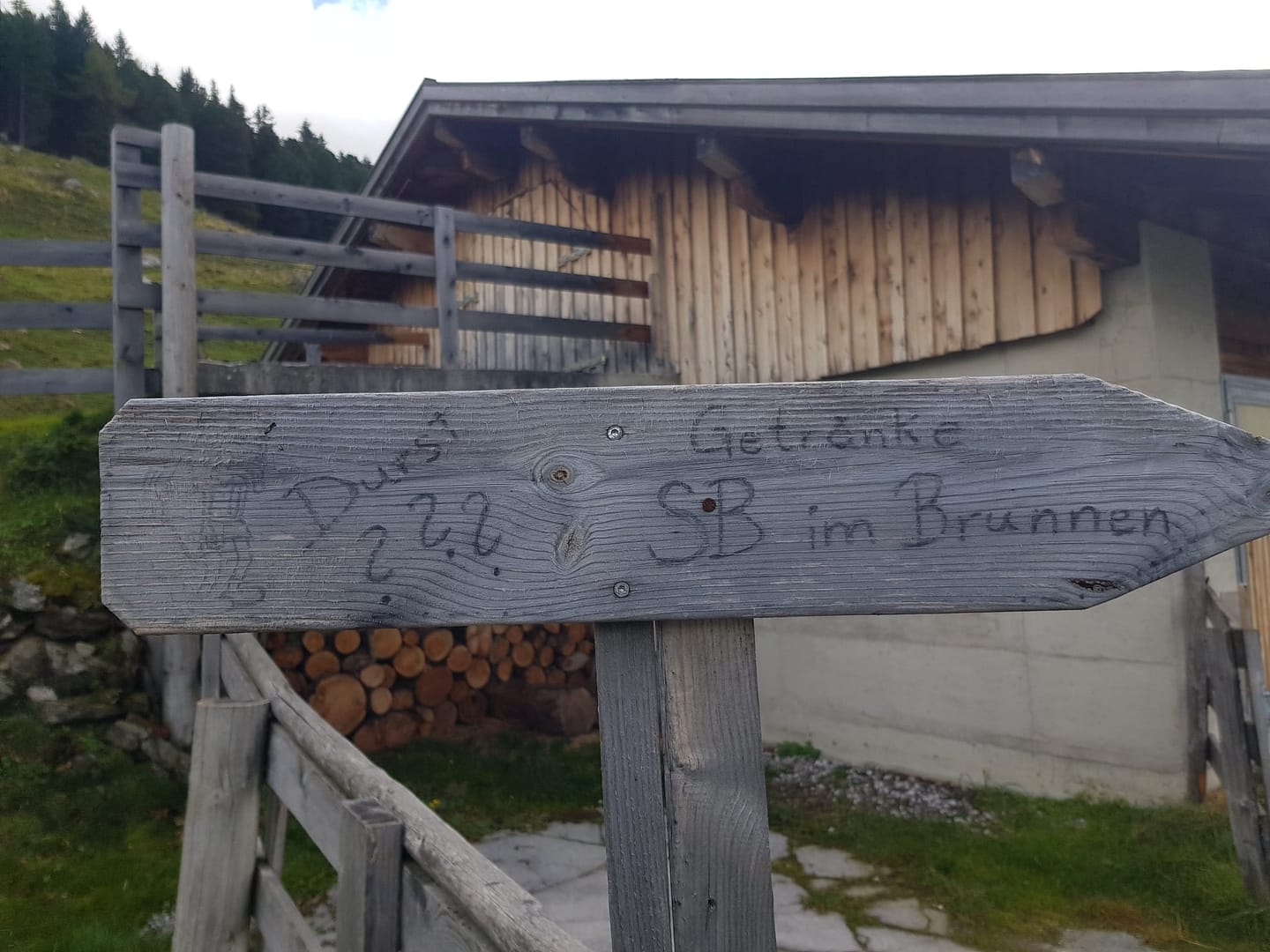 Im Almdorf gibt es ein erfreuliches Schild „Getränke SB im Brunnen“, die Erfrischungsgetränke scheint es aber nur in der Sommerzeit zu geben, denn für uns lag da nichts mehr drin. 😉