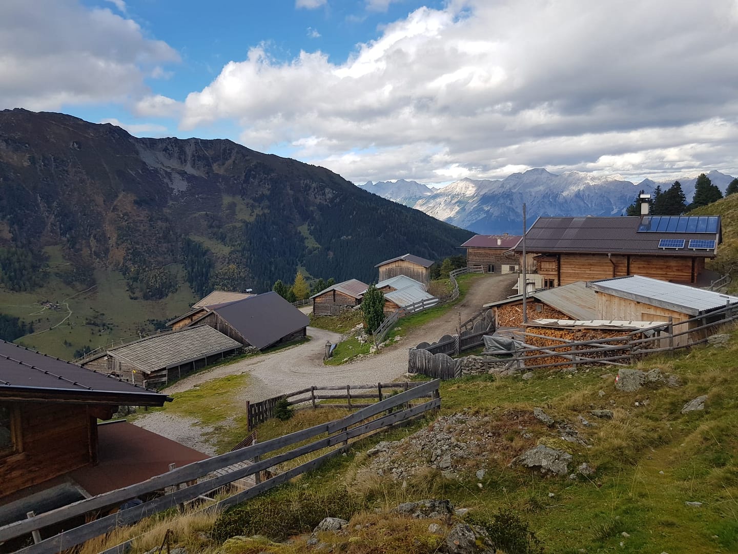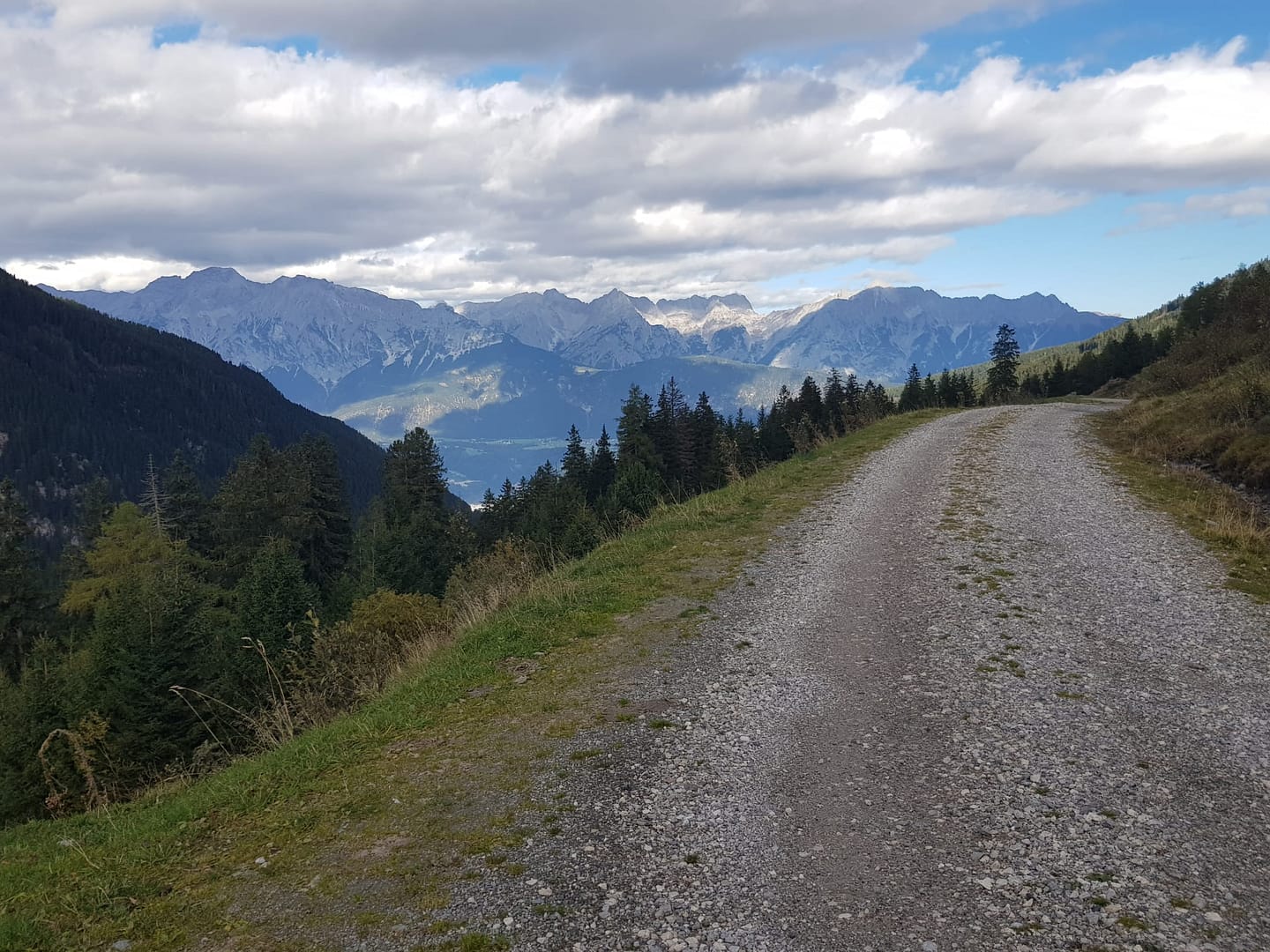 Vom Parkplatz folgt man der Beschilderung „Hirzer“ Richtung Süden, dort wo auch die Skitourenroute beginnt. Über die Forststraße geht es erst einmal relativ langweilig die langgezogene Straße hoch bis zu den ersten Almwiesen. Mit Ski zweigt man hier auf die Wiesen ab, wir allerdings folgen der Strßa noch ein kurzes Stück relativ flach talauswärts, man hat einen tollen Ausblick Richtung Inntal. Bei dem Schild „Forststrasse“ (siehe Bilder) zweigt der Wanderweg bzw. ein Trampelpfad  zum kleinen Almdorf Pofers ab, welches auf 1.863 m liegt. Es liegt nahe dieses Stück mit dem Rad zu fahren.