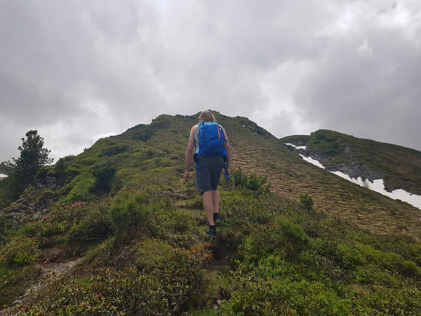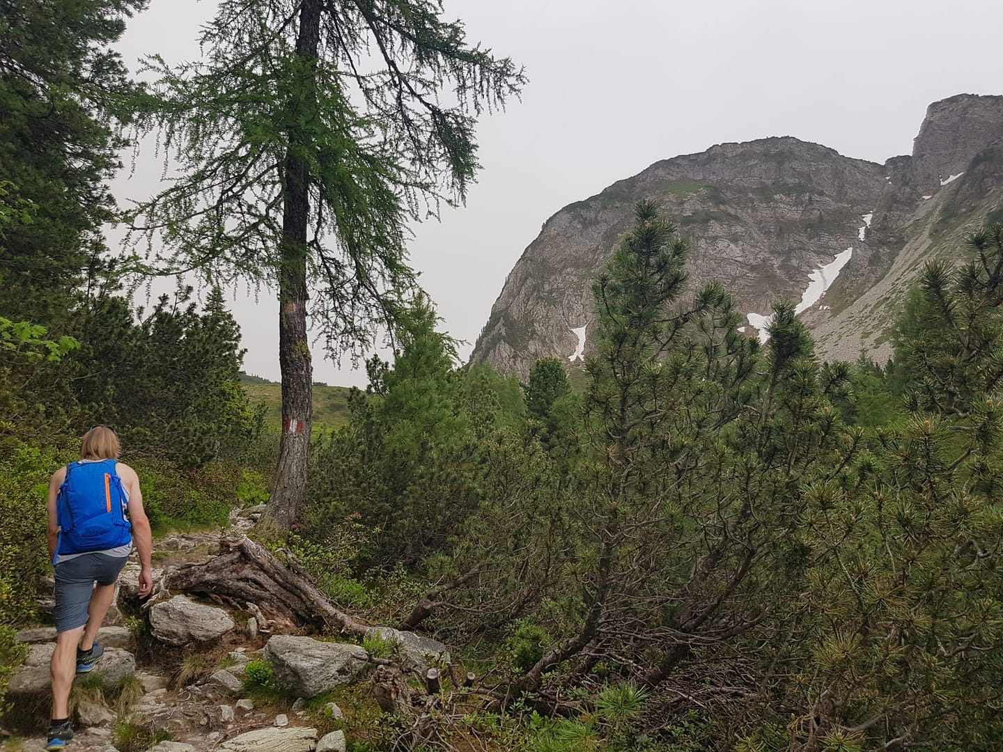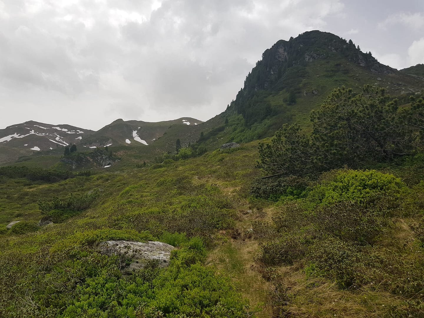 Ab hier wird das Gelände unwegsamer. Wir hatten die Tour zuhause über Outdooractive geplant, waren jedoch nicht darauf vorbereitet, dass der Weg nicht mehr gewartet wird und beim Joch auch nicht ausgeschildert ist. Anfangs ist noch ein leichter Trampelpfad zu erkennen, doch dieser wächst zunehmend zu, sodass die Wegfindung mehr auf „gut Glück“ basiert.