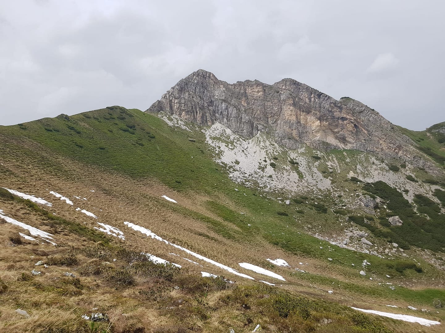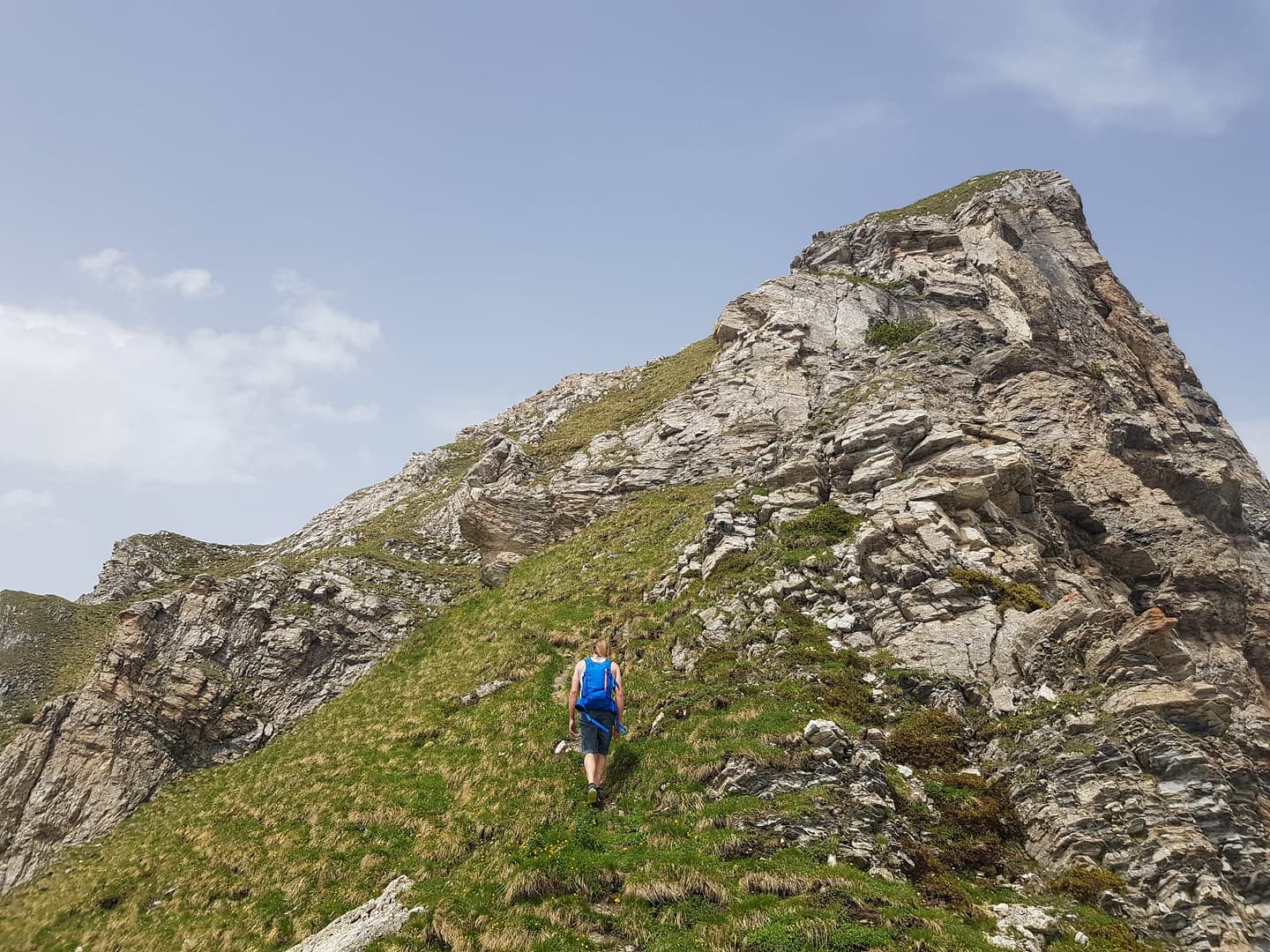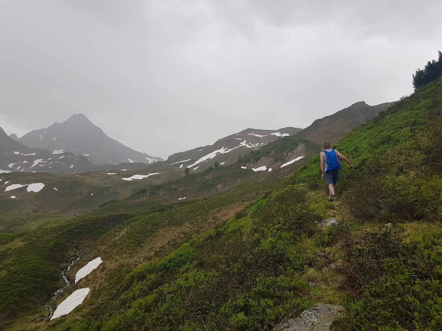 Ab hier wird das Gelände unwegsamer. Wir hatten die Tour zuhause über Outdooractive geplant, waren jedoch nicht darauf vorbereitet, dass der Weg nicht mehr gewartet wird und beim Joch auch nicht ausgeschildert ist. Anfangs ist noch ein leichter Trampelpfad zu erkennen, doch dieser wächst zunehmend zu, sodass die Wegfindung mehr auf „gut Glück“ basiert.