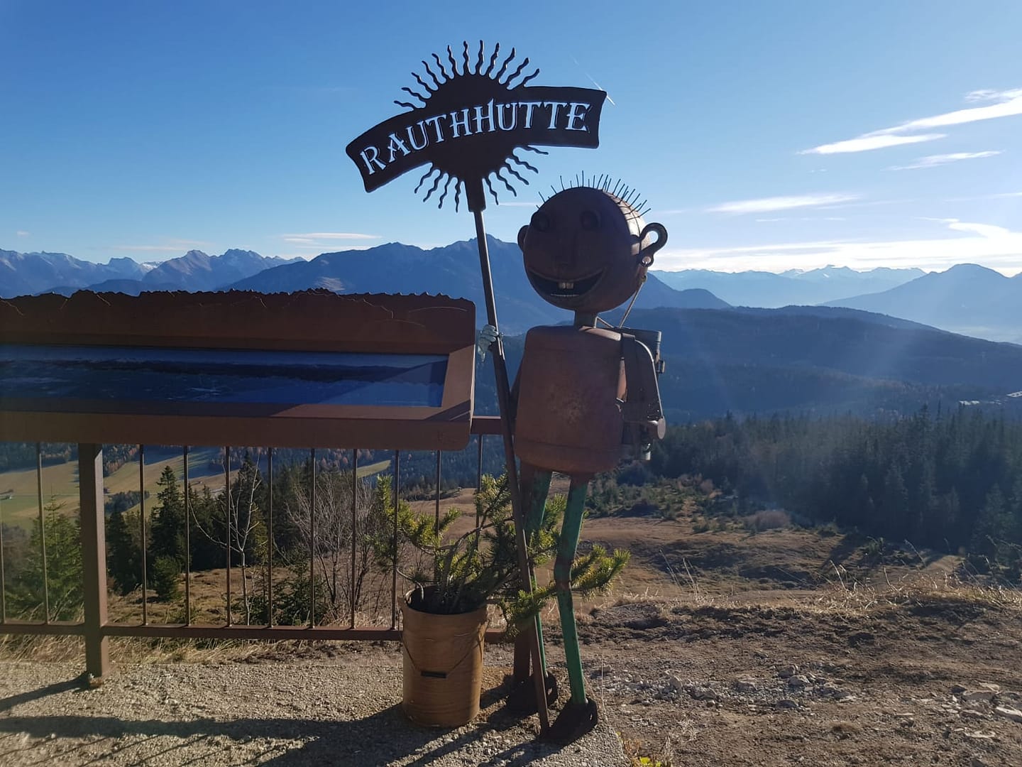 Vom Parkplatz folgt man den gefühlt hunderten Wegweisern, die man nicht übersehen kann durch den Wald und über Stock und Stein. Ich fand den Weg echt toll und zwischendurch hat man auch bereits das Tagesziel die Hohe Munde (Östgipfel) zwischen den Baumgipfeln gesehen (3. Bild). Wir folgen dem Weg bis zur Rauthhütte rauf, wo der Wald etwas lichter wird. Neben der Hütte steht bereits ein Gipfelkreuz, aber noch nicht unser Ziel, besonders toll fand ich das Männchen (5. Bild), was sehr lustig aussah.