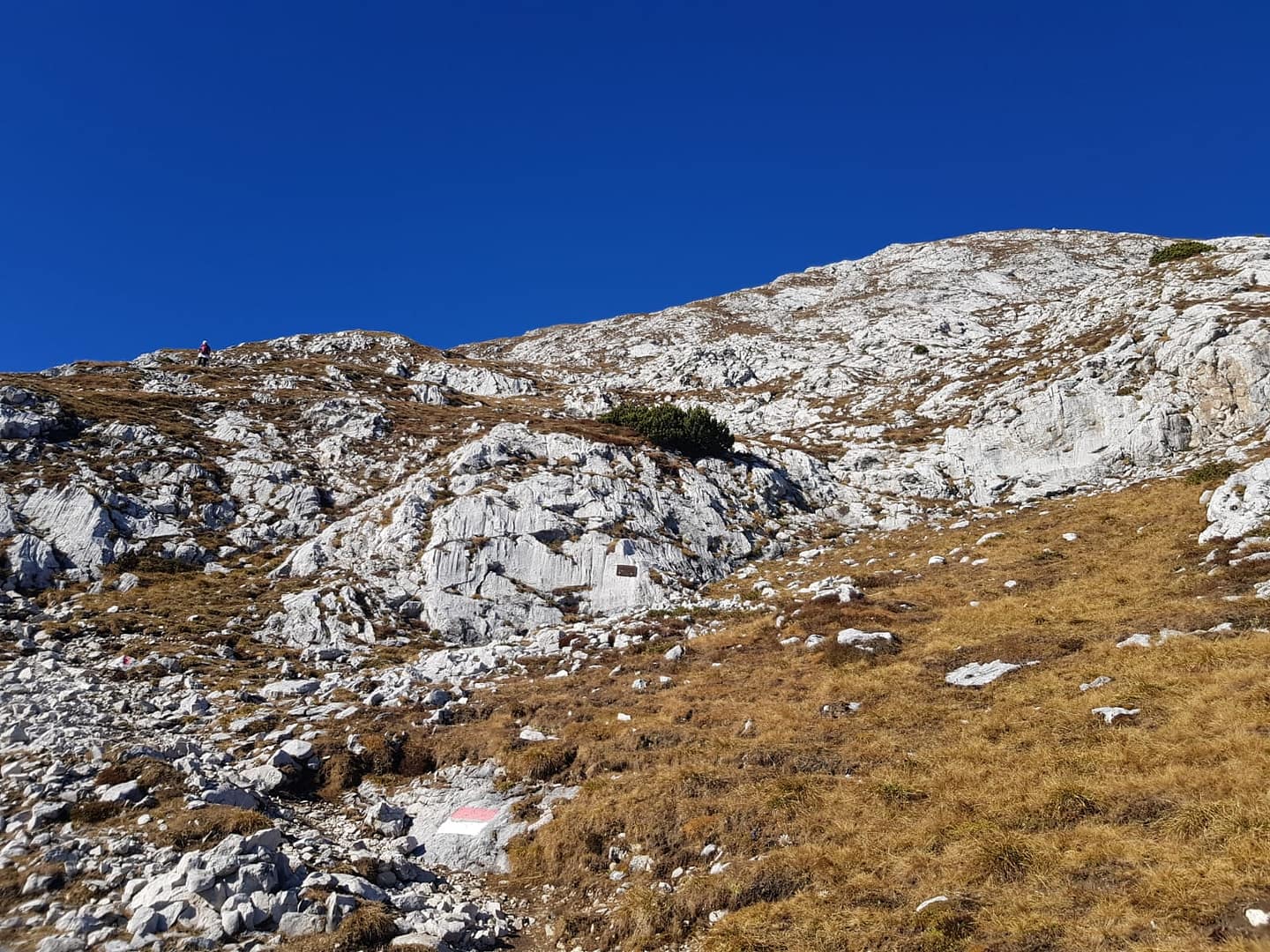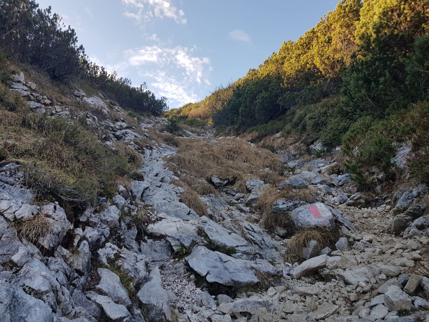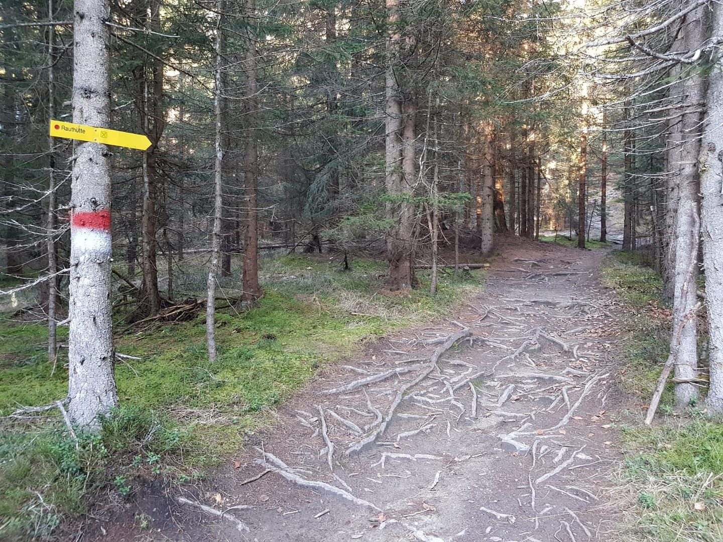 Bereits von der Rauthhütte hat man einen schönen Ausblick auf die umliegenden Berge. Der Weg wird felsiger und teilweise liegt Geröll auf dem Pfad, aber Markierungen weisen einem ohne Probleme den Weg.