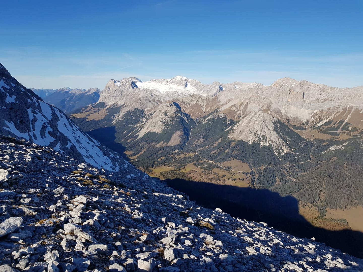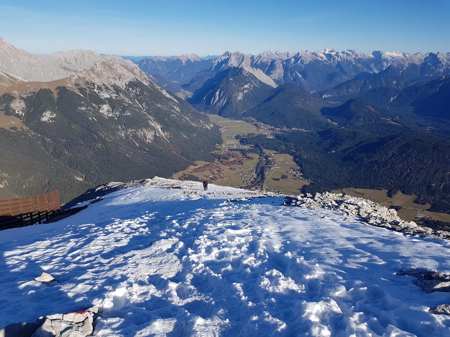 Oben auf dem Platteau der Hohe Munde (Ostgipfel) angekommen, sieht man auch den zweiten westlichen Gipfel, welcher ein paar Meter höher liegt. Aufgrund der Schneelage haben wir uns aber dagegen entschieden noch zu diesem rauf zu steigen stattdessen haben wir den Ausblick ausgiebig bei einer tollen Brotzeit genossen.