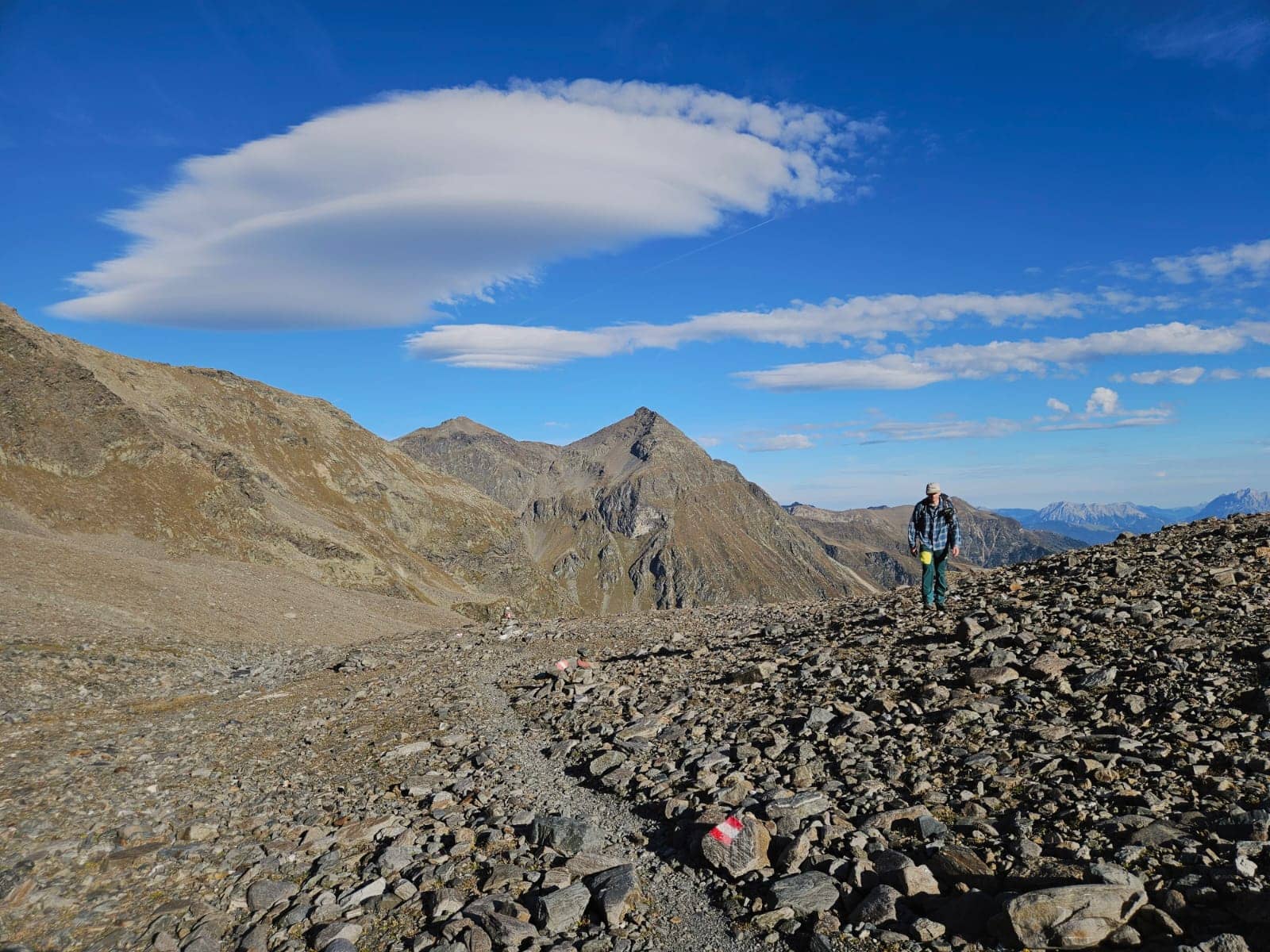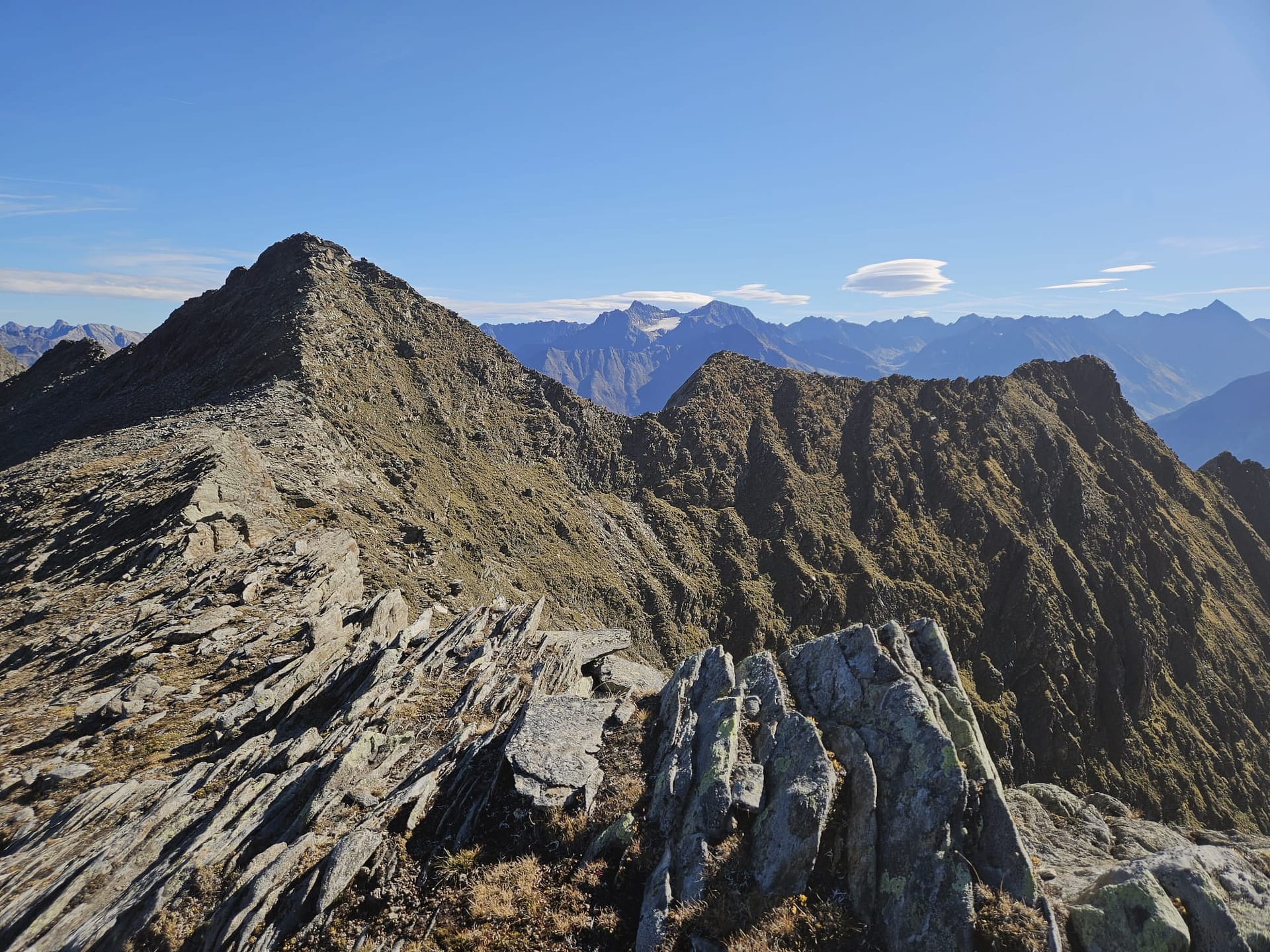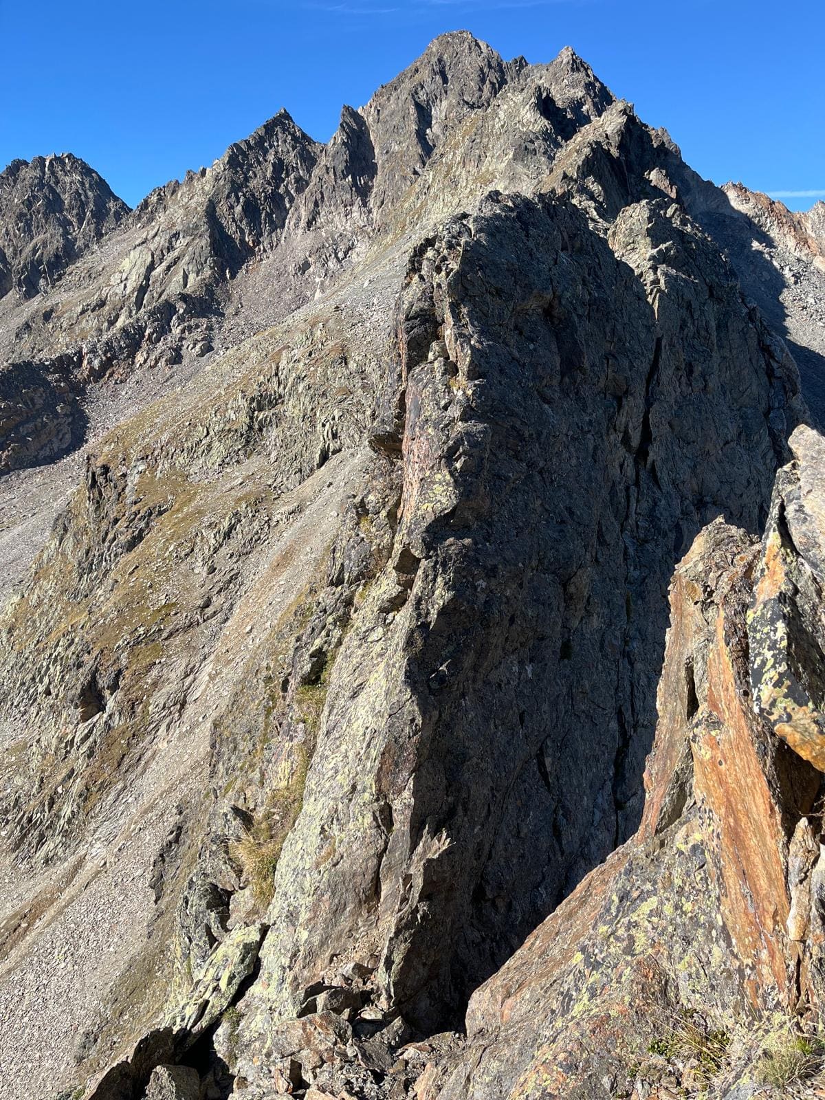 Nach einer Stufe erreichen wir das Fernerkar – ein Steinmeer, soweit das Auge reicht. Auf der Scharte Felderjöchl auf 2.801 m angekommen legen wir eine kurze Pause ein und blicken bereits etwas skeptisch auf den Grat zum Plattigkogel. Laut Beschreibung sollte er unschwer in leichter Kletterei (Stellen I–II) zu bewältigen sein. Nach rund 500 m brechen wir die Tour jedoch ab: Der Fels ist extrem brüchig, ständig hat man lockere Brocken in der Hand.