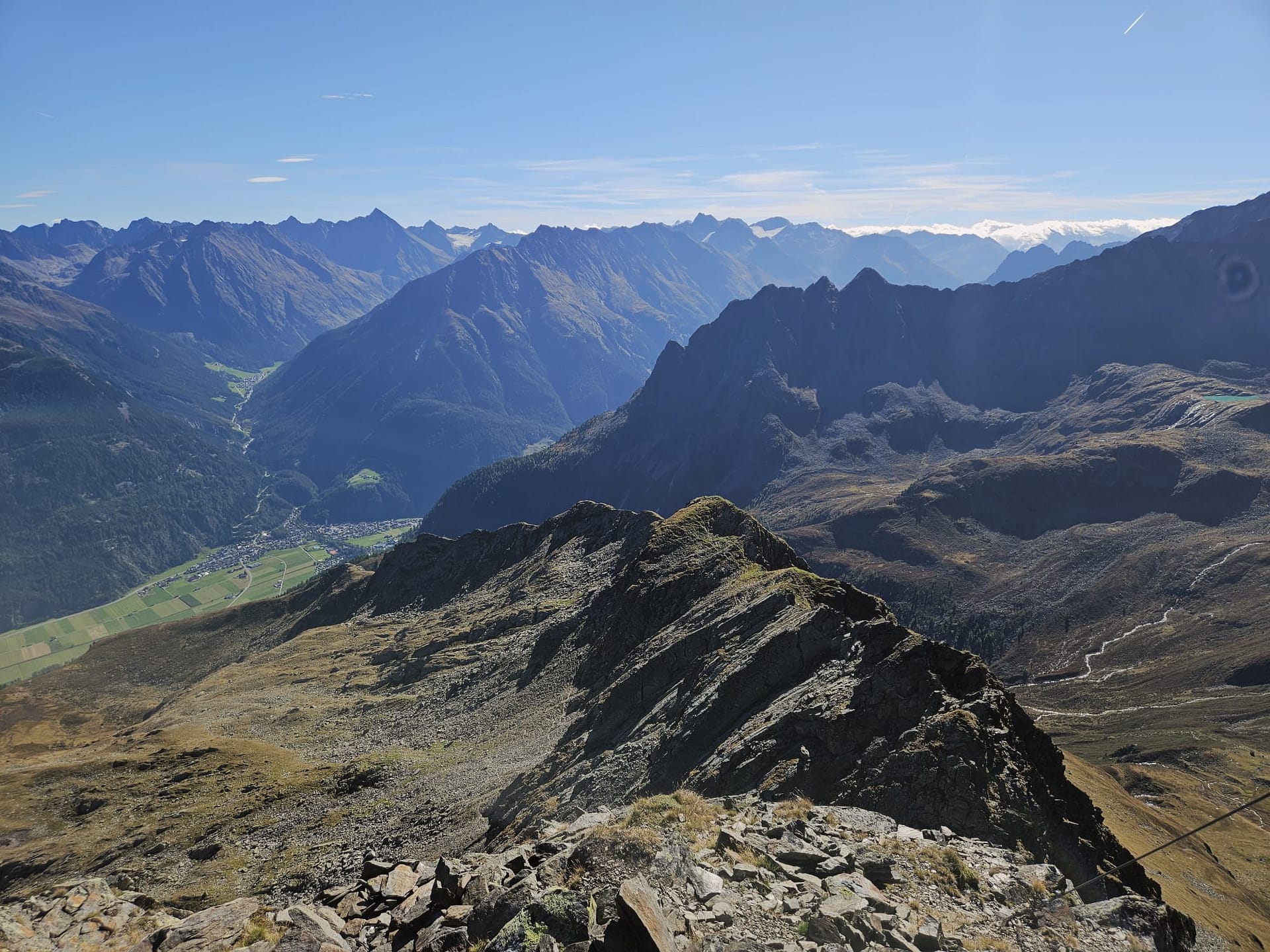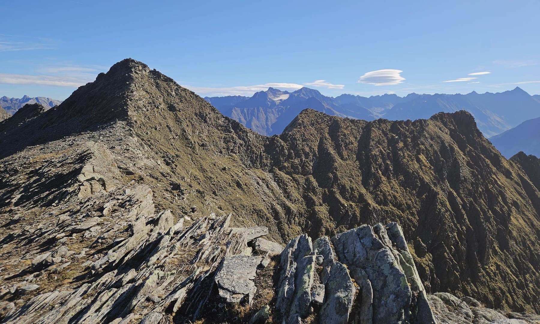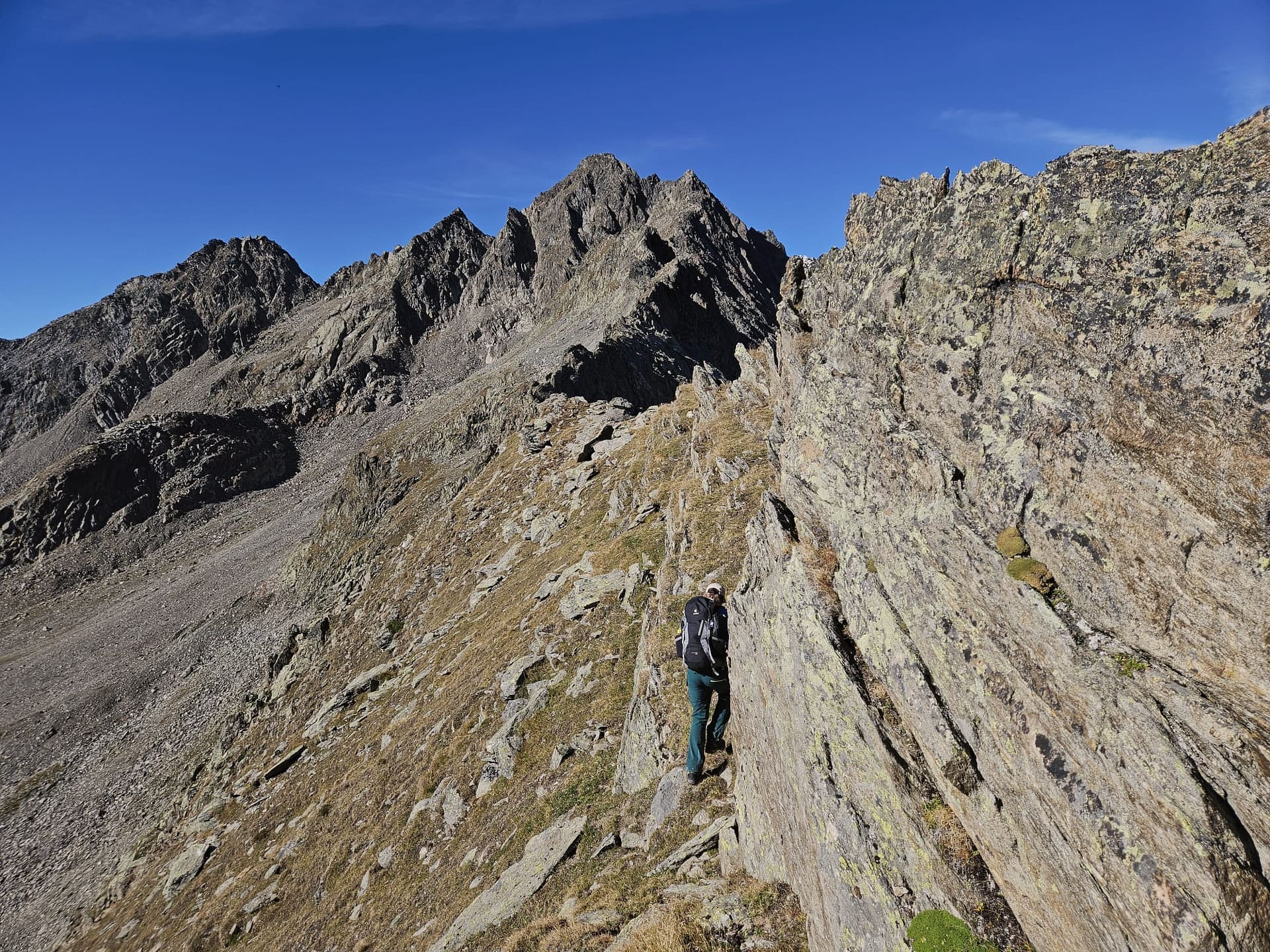 Nach einer Stufe erreichen wir das Fernerkar – ein Steinmeer, soweit das Auge reicht. Auf der Scharte Felderjöchl auf 2.801 m angekommen legen wir eine kurze Pause ein und blicken bereits etwas skeptisch auf den Grat zum Plattigkogel. Laut Beschreibung sollte er unschwer in leichter Kletterei (Stellen I–II) zu bewältigen sein. Nach rund 500 m brechen wir die Tour jedoch ab: Der Fels ist extrem brüchig, ständig hat man lockere Brocken in der Hand.