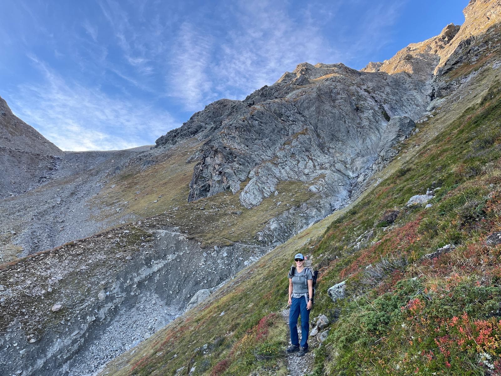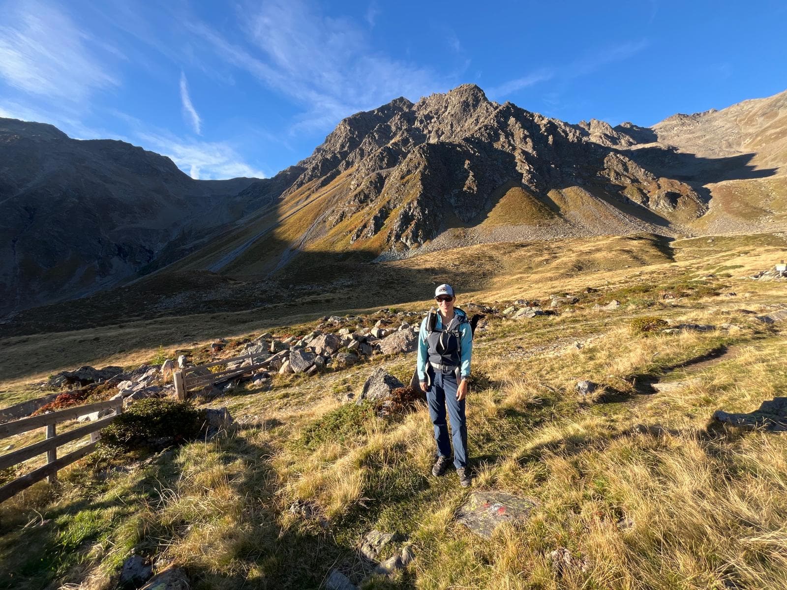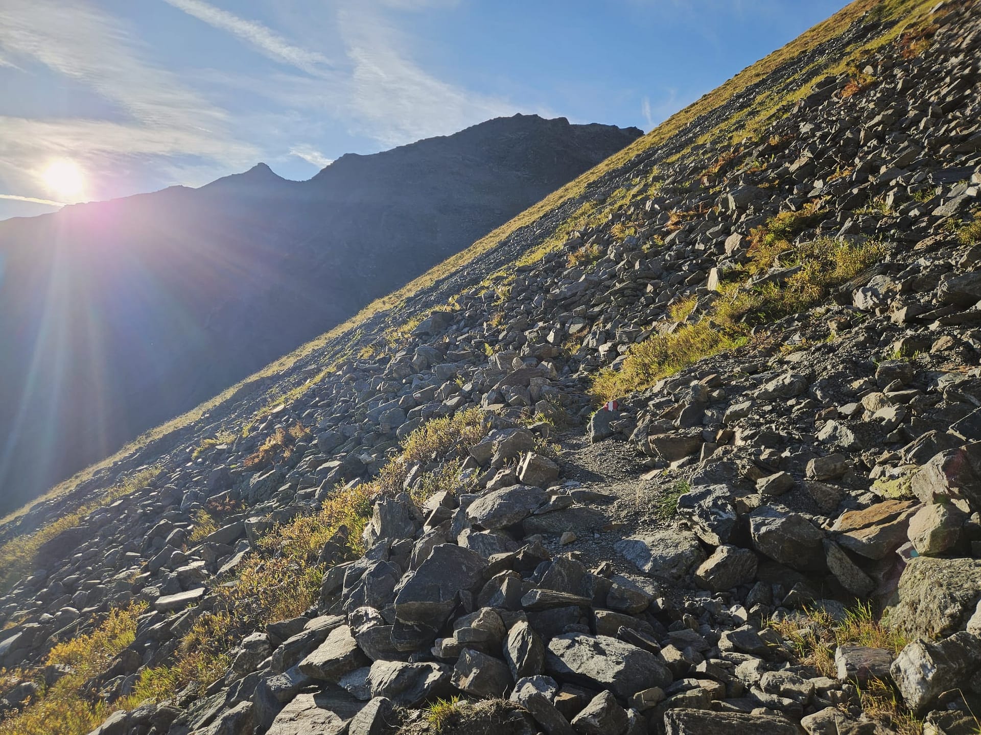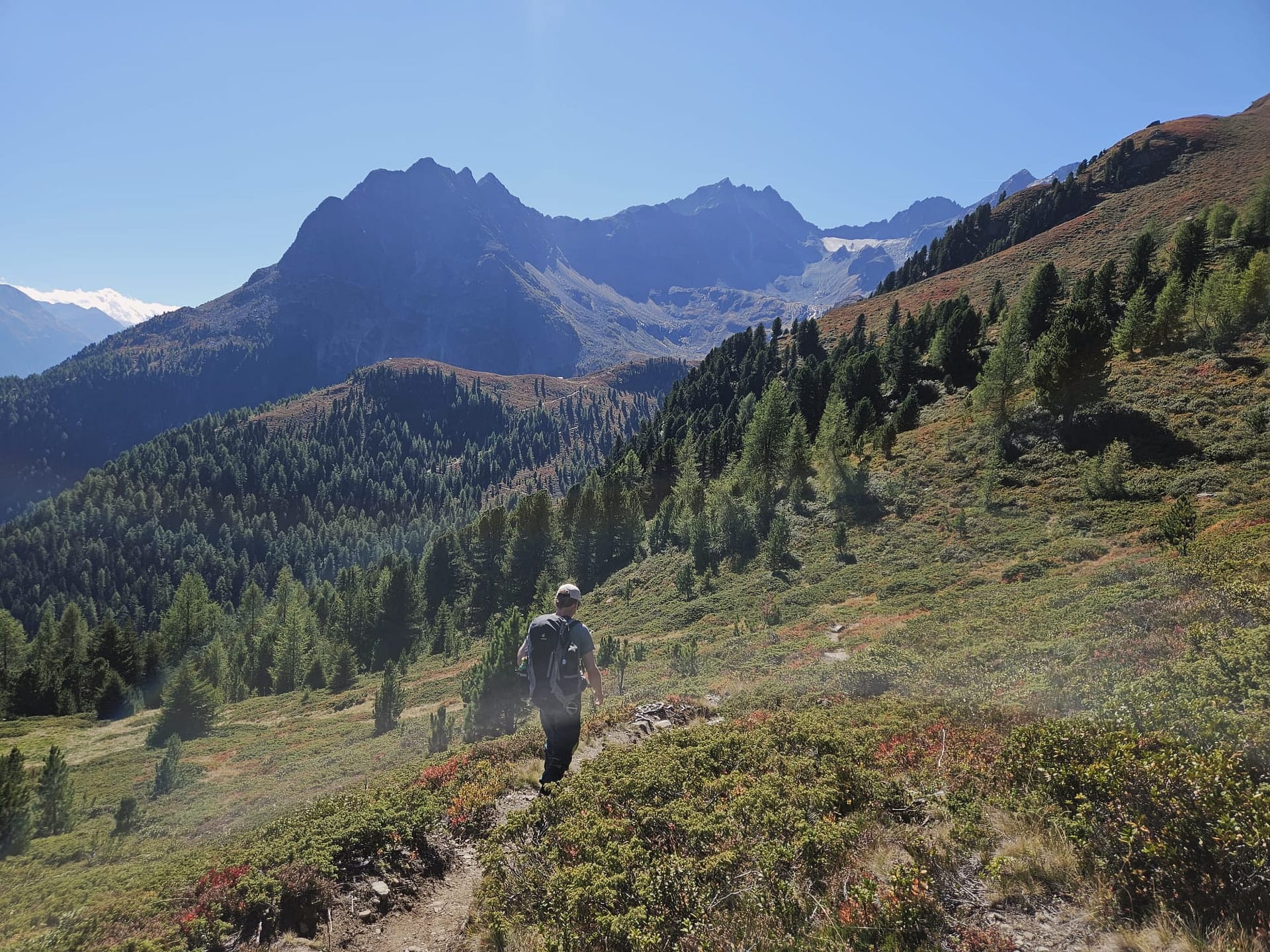 Von der Frischmannhütte wandern wir in südliche Richtung. Kurz nach der Hütte zweigt der Fundus-Waal-Weg ab, der jedoch aufgrund von Steinschlag gesperrt ist. Wir lassen ihn links liegen und folgen dem rechten Pfad, der sich in stetiger Steigung an der Bergflanke des Blockkogels emporzieht.