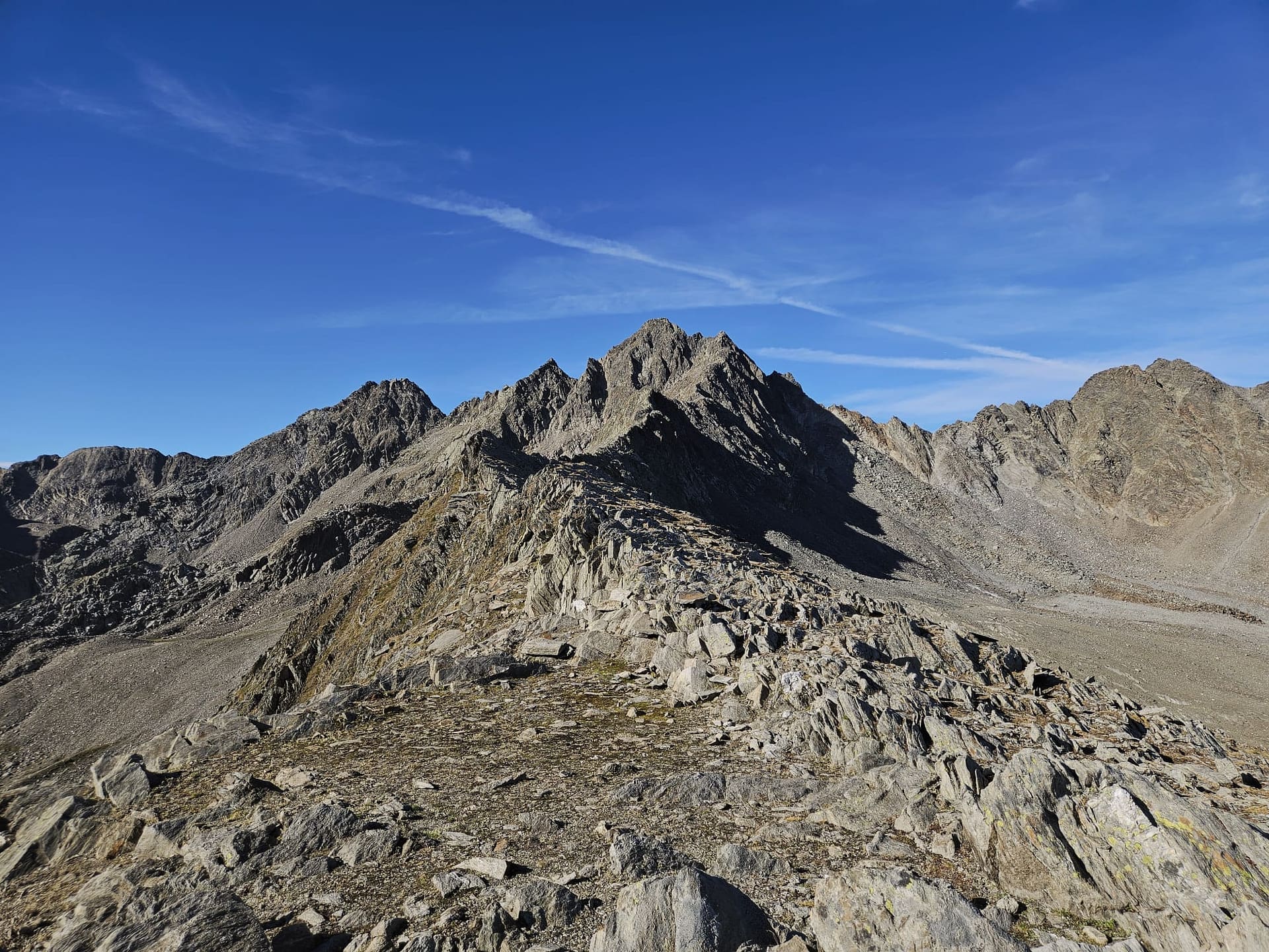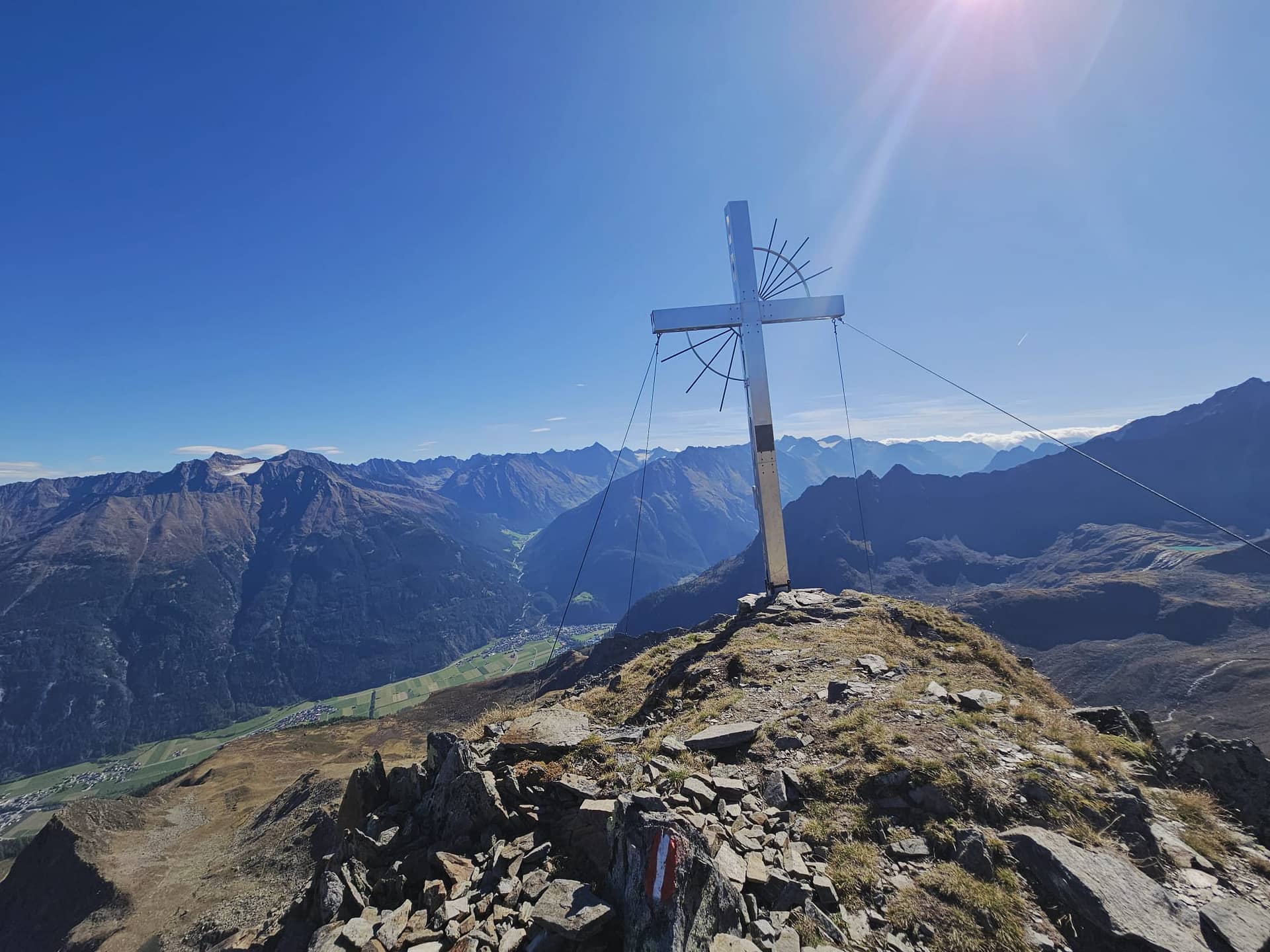 Stattdessen steigen wir zurück zur Scharte und gelangen von dort in wenigen Minuten weglos auf den Innerberger Felderkogel. Vom Gipfel genießen wir den Ausblick und überlegen die nächsten Schritte. Nicht weit entfernt sehen wir das Gipfelkreuz des Felderkogels. Anstatt um den Berg herumzugehen, steigen wir unschwer und weglos über die schuttige Flanke ab und erreichen auf 2.720 m wieder den markierten Wanderweg. Nach etwa 200 m erreichen wir die Abzweigung und steigen rechts zum Gipfelkreuz des Felderkogels hinauf.