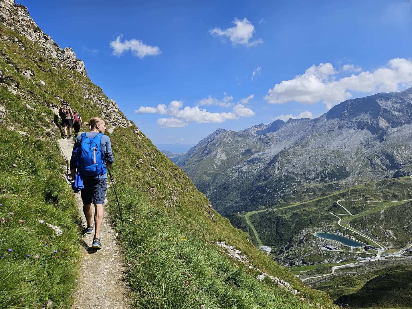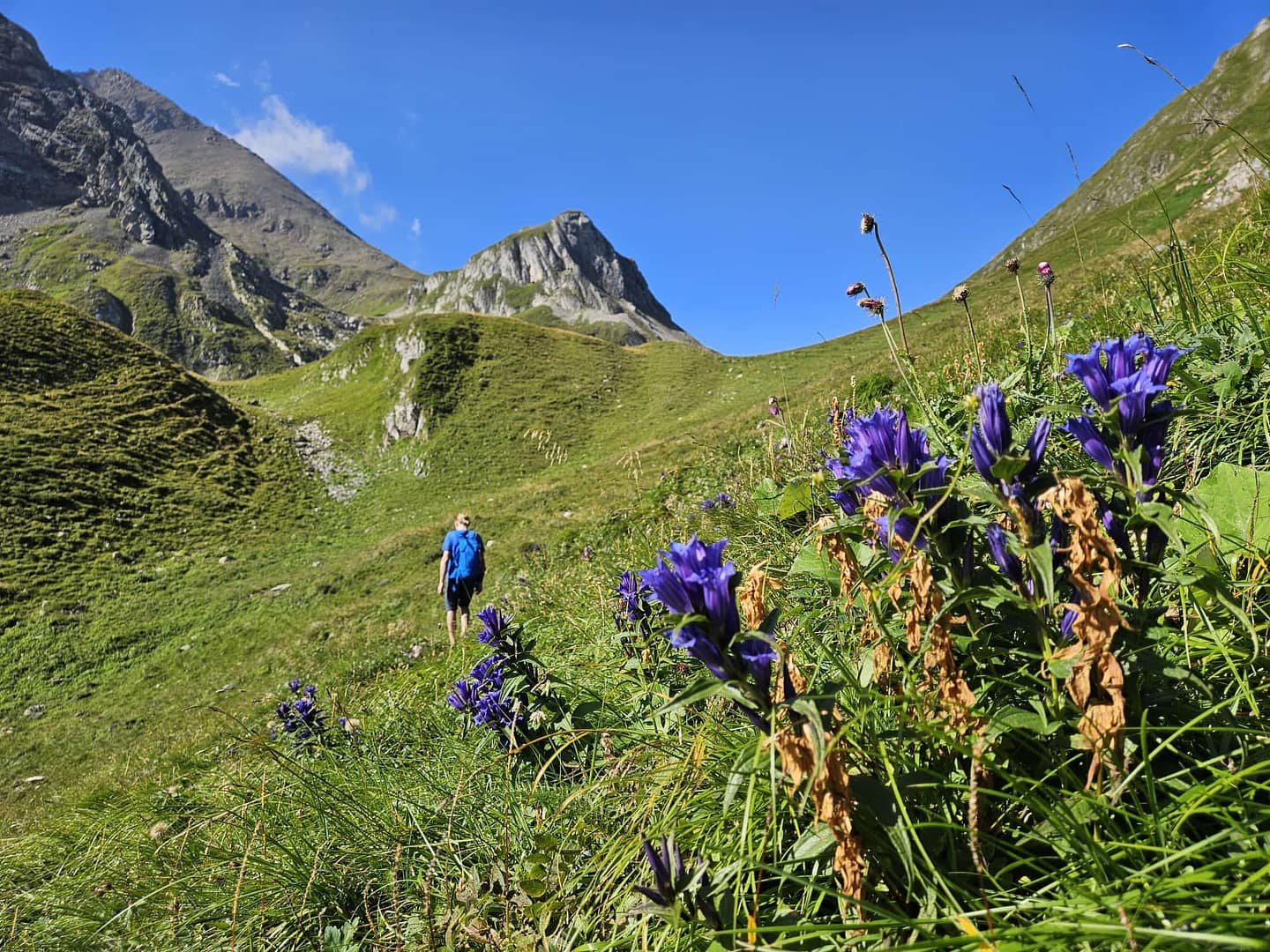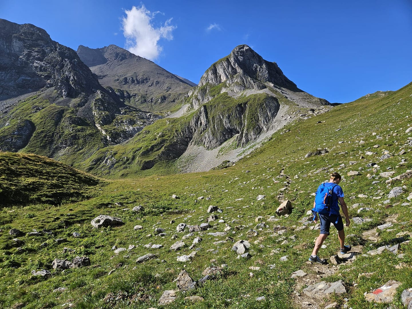 Nach einer kurzen Snackpause stiegen wir bis auf 2.445 m entlang des Aufstiegswegs ab. Hier beschlossen wir, unsere Tour über die Frauenwand zu vollenden. Noch einmal galt es, etwa 100 Höhenmeter bergauf zu überwinden, während wir entlang der Bergflanke wanderten. Auf der einen Seite erstreckte sich eine steile Wiese, auf der anderen Seite fiel das Gelände schroff ab. Ein kurzer Abschnitt des Weges war mit einem Stahlseil gesichert. Den kleinen Umweg zum Gipfel der Frauenwand sparten wir uns, da wir bereits an diesem Tag höhere Lagen erreicht hatten und uns der zusätzliche Ausblick keinen großen Mehrwert bot.