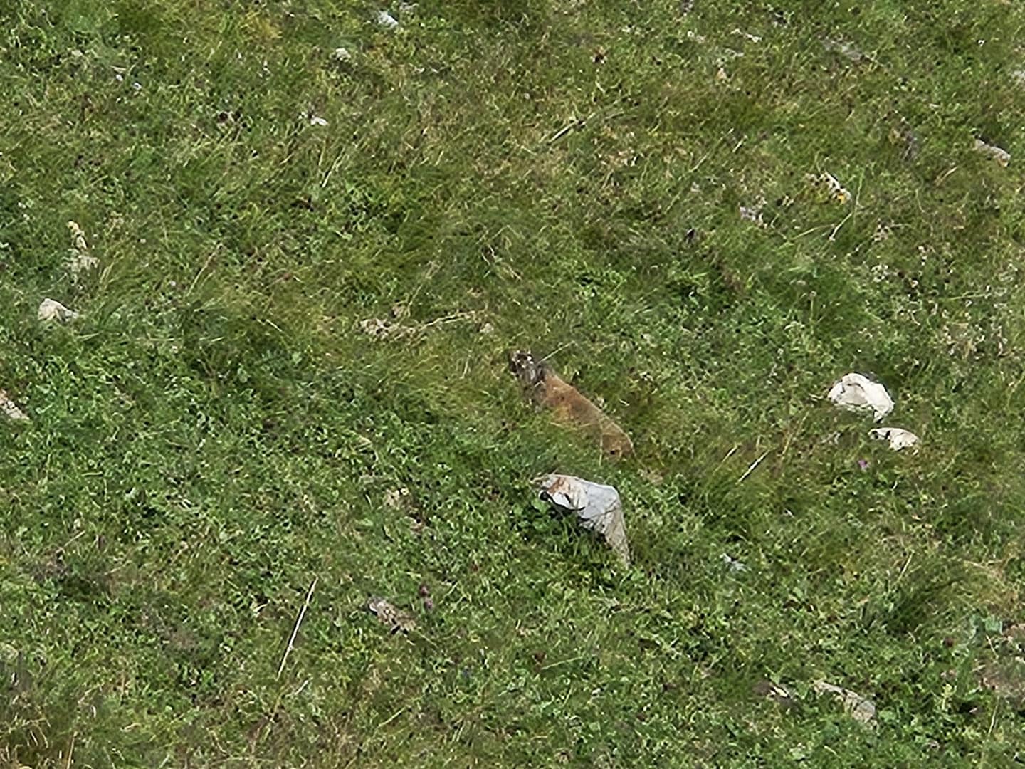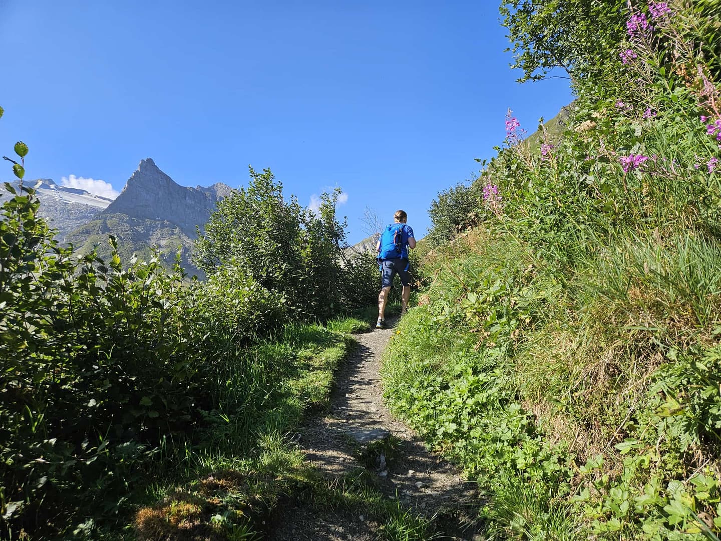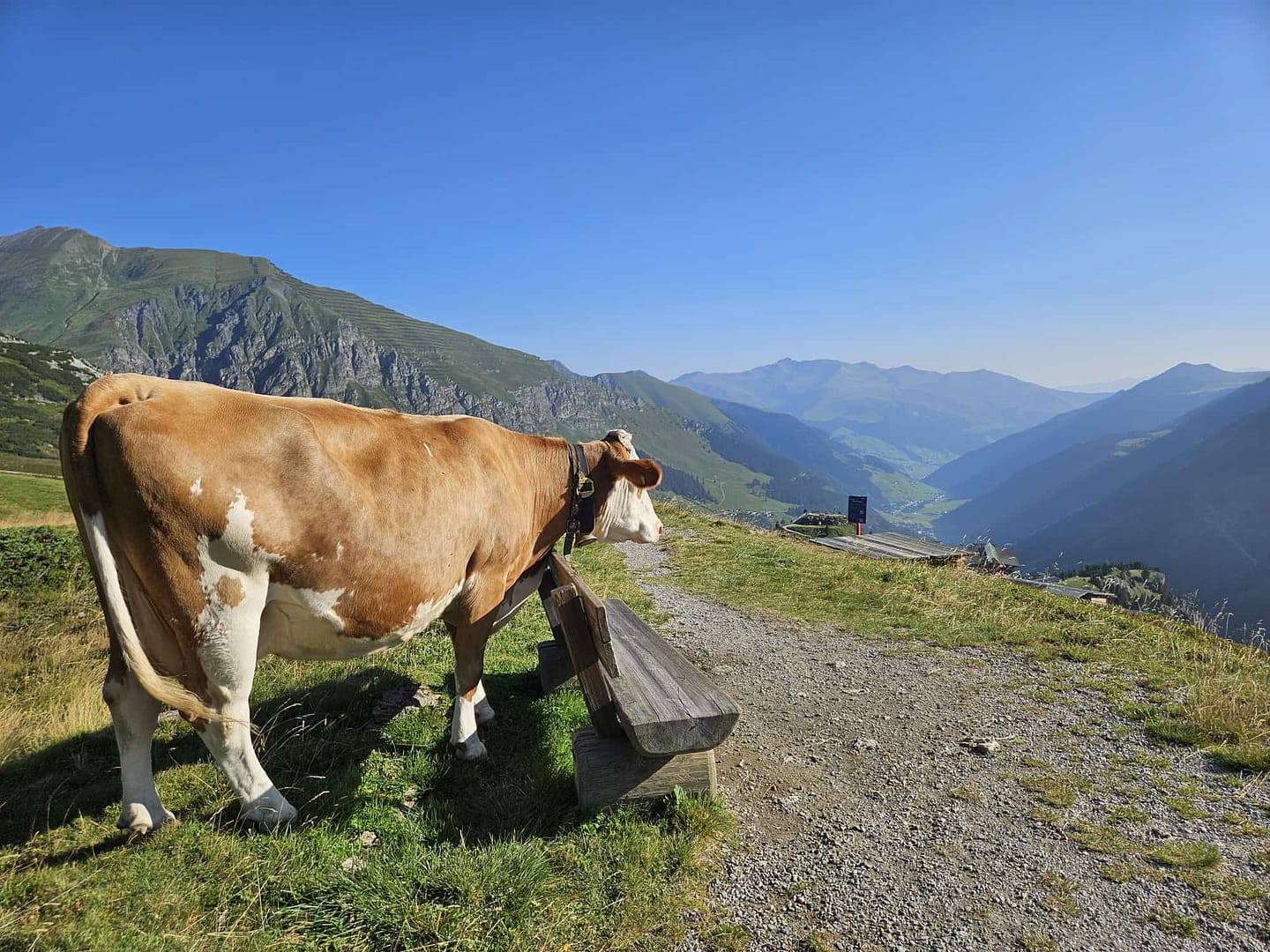 Nach einer kurzen Snackpause stiegen wir bis auf 2.445 m entlang des Aufstiegswegs ab. Hier beschlossen wir, unsere Tour über die Frauenwand zu vollenden. Noch einmal galt es, etwa 100 Höhenmeter bergauf zu überwinden, während wir entlang der Bergflanke wanderten. Auf der einen Seite erstreckte sich eine steile Wiese, auf der anderen Seite fiel das Gelände schroff ab. Ein kurzer Abschnitt des Weges war mit einem Stahlseil gesichert. Den kleinen Umweg zum Gipfel der Frauenwand sparten wir uns, da wir bereits an diesem Tag höhere Lagen erreicht hatten und uns der zusätzliche Ausblick keinen großen Mehrwert bot.