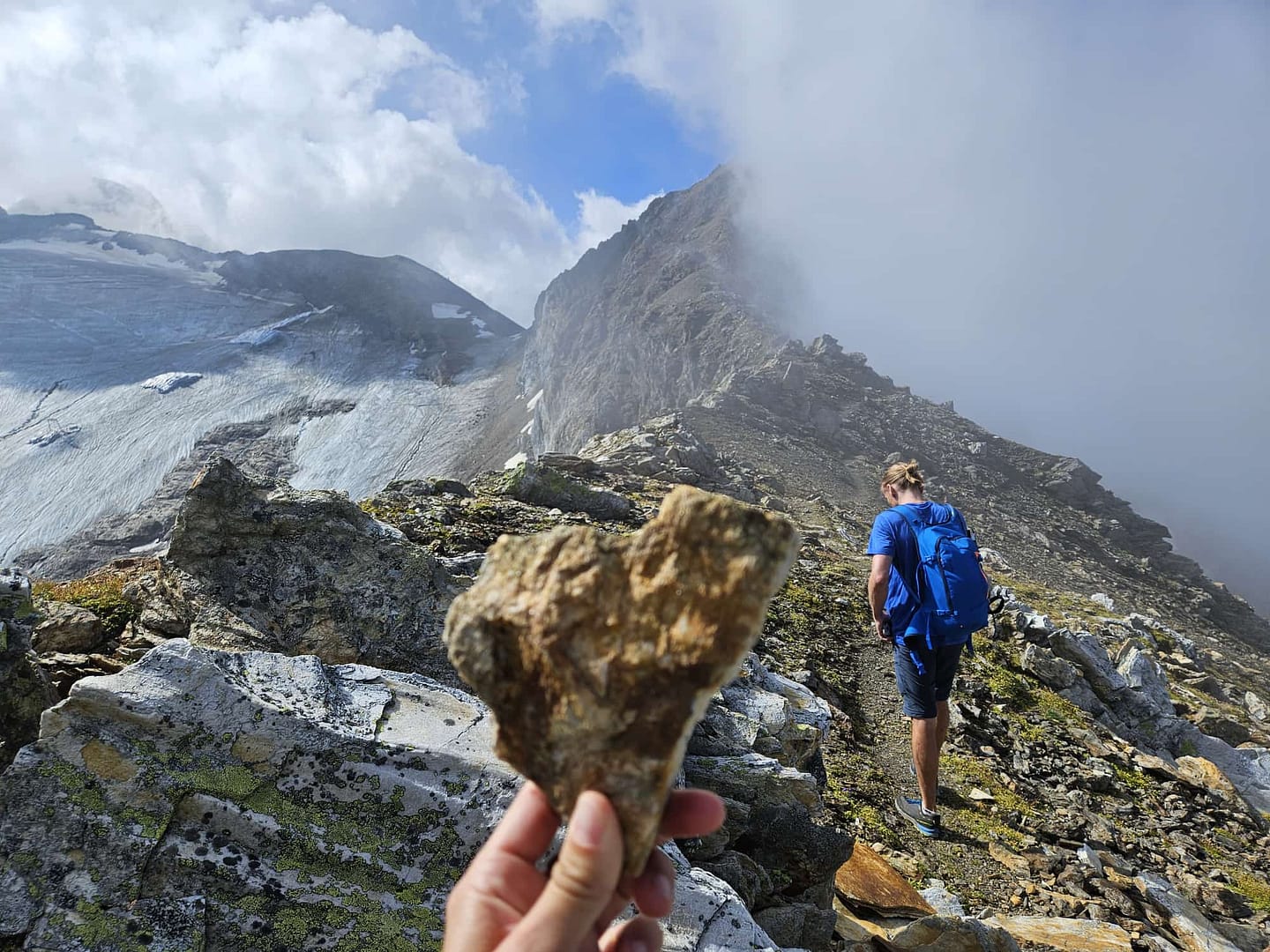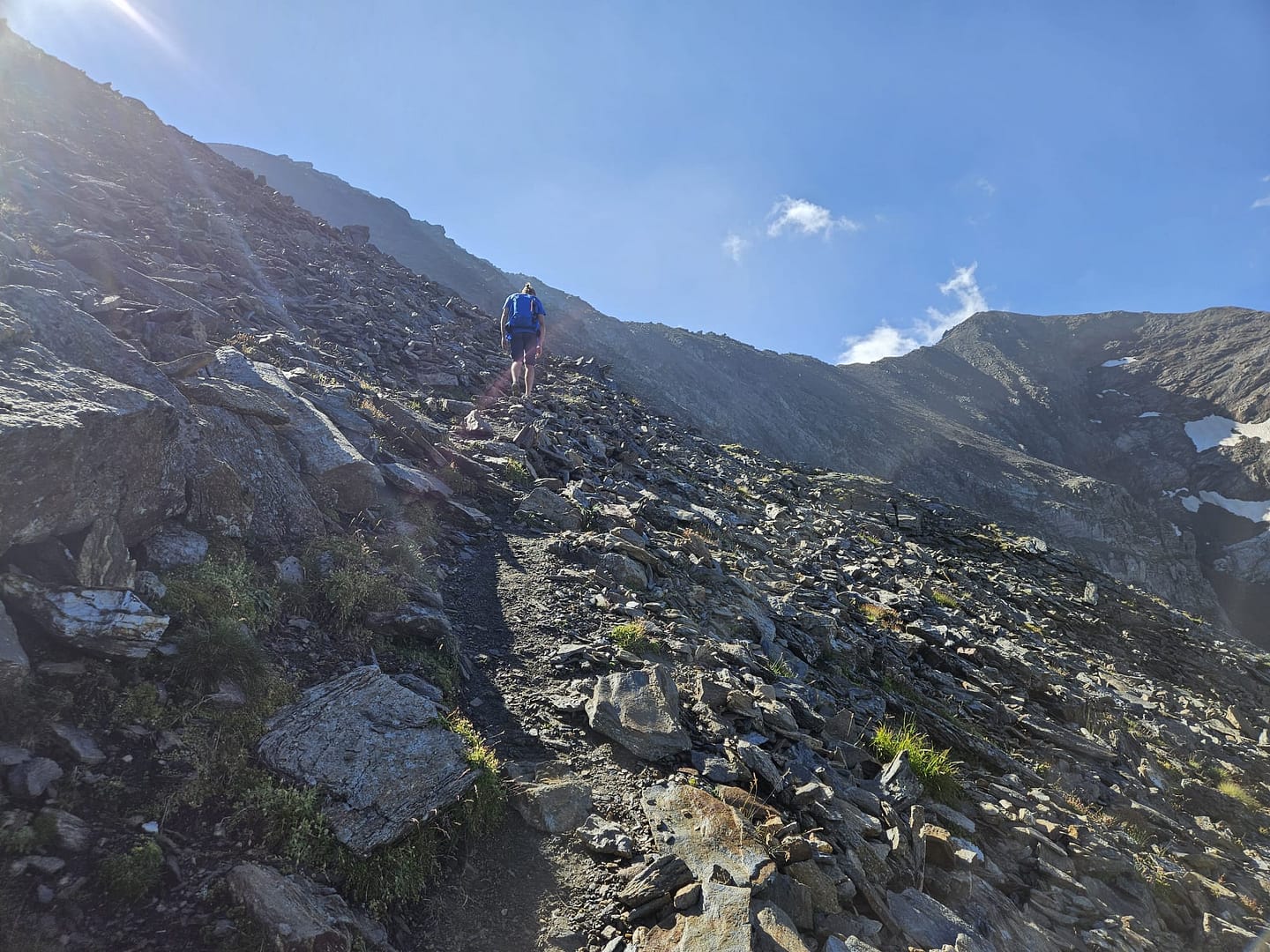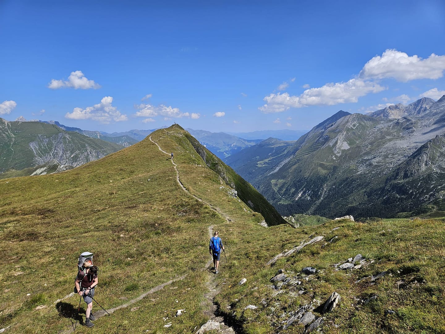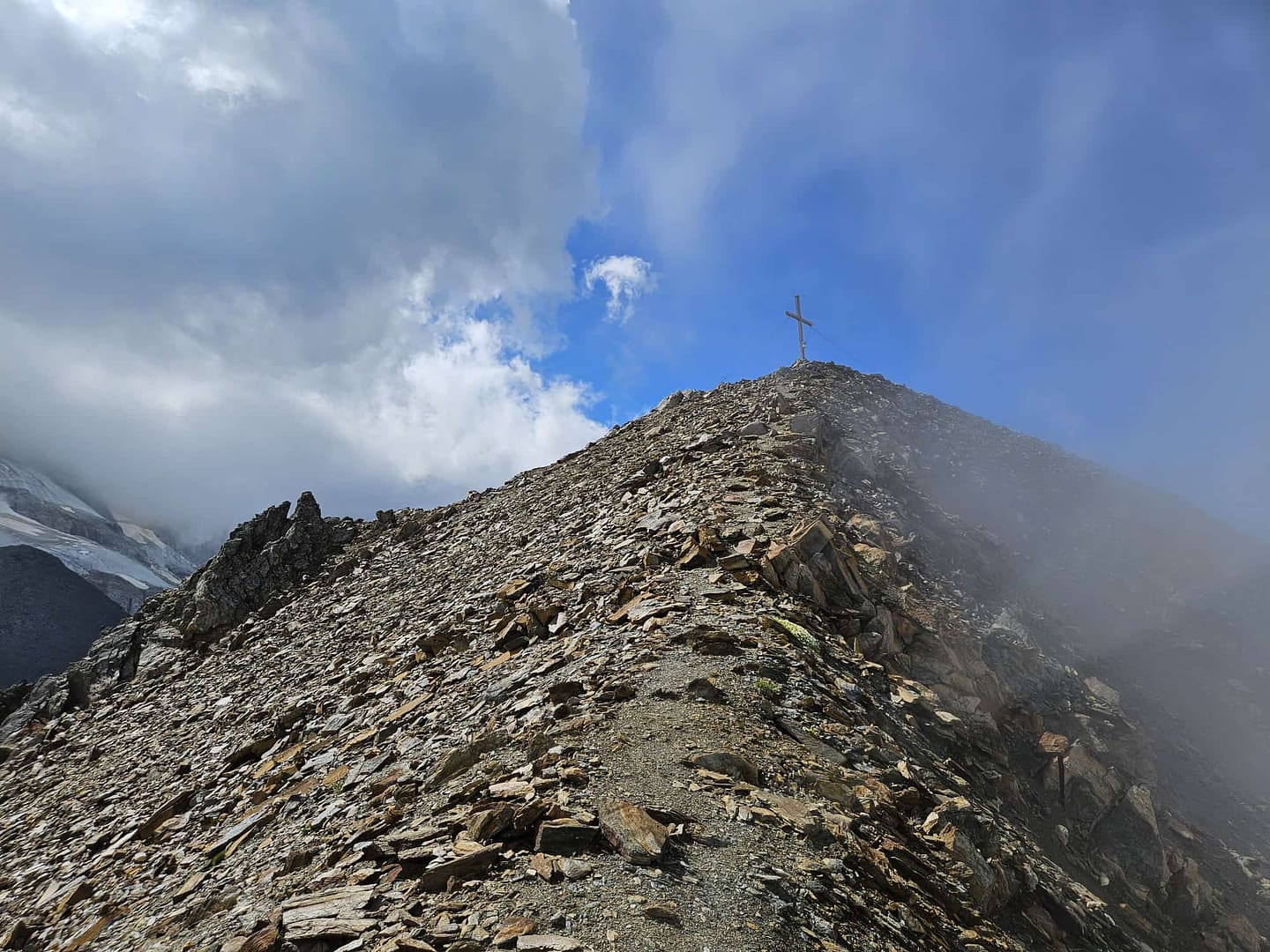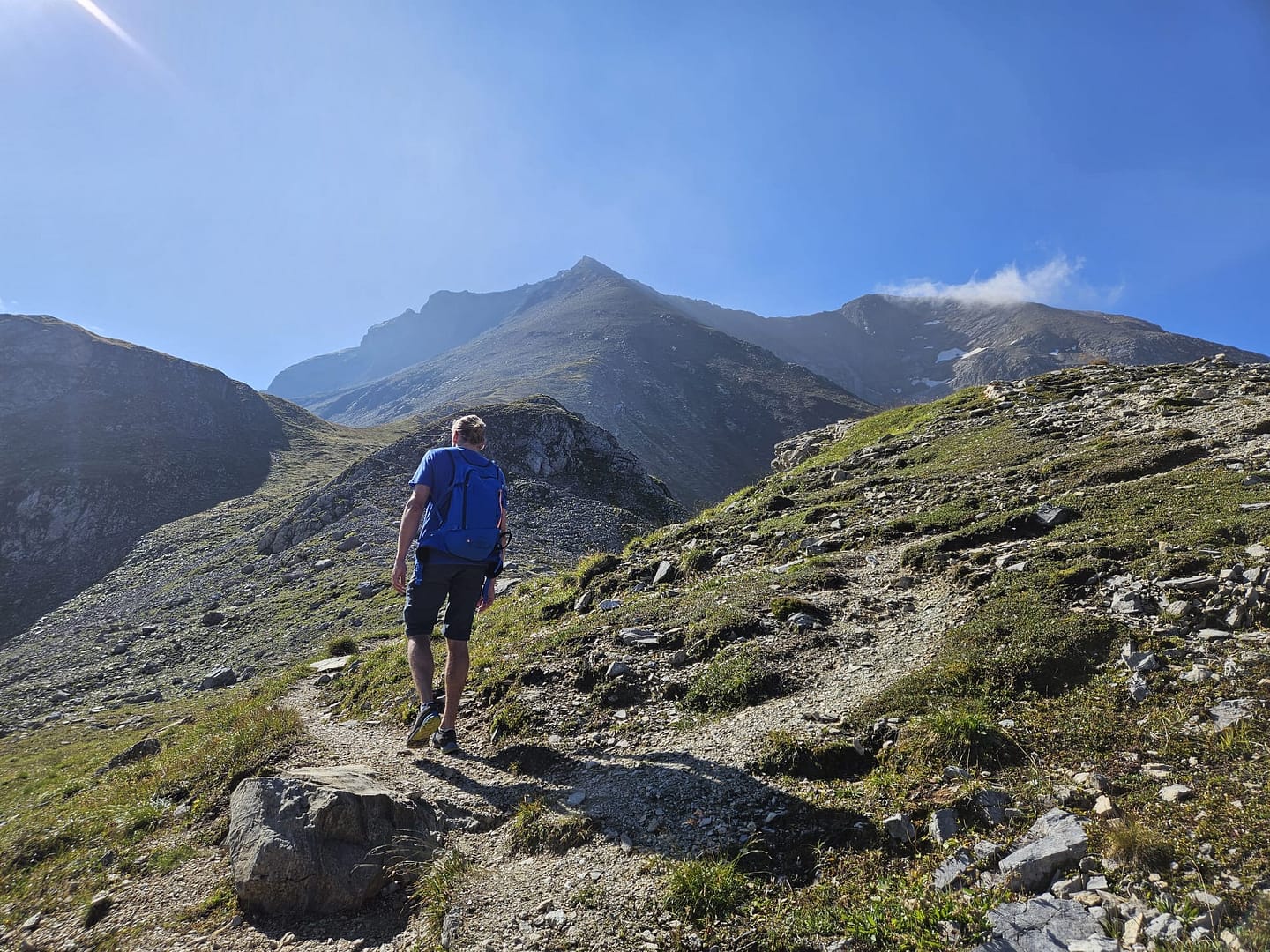 Der Weg wird nun steiniger und karger, Geröll und Schutt säumen den Weg. Zunächst geht es in süd-südöstlicher Richtung steil den Bergrücken hinauf. Ab 2.870 m Höhe wandern wir entlang des Grates weiter in süd-südwestlicher Richtung zum Gipfel. Zwar verlieren wir hier ein paar Höhenmeter, aber das ist kaum der Rede wert. Vom Gipfel aus bietet sich normalerweise ein fantastischer Ausblick. Leider zogen bei uns Wolken auf, sodass uns sogar die Sicht auf den Olperer verwehrt blieb.
