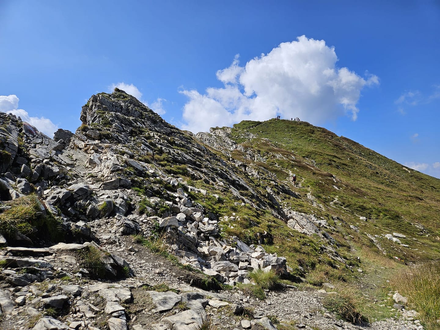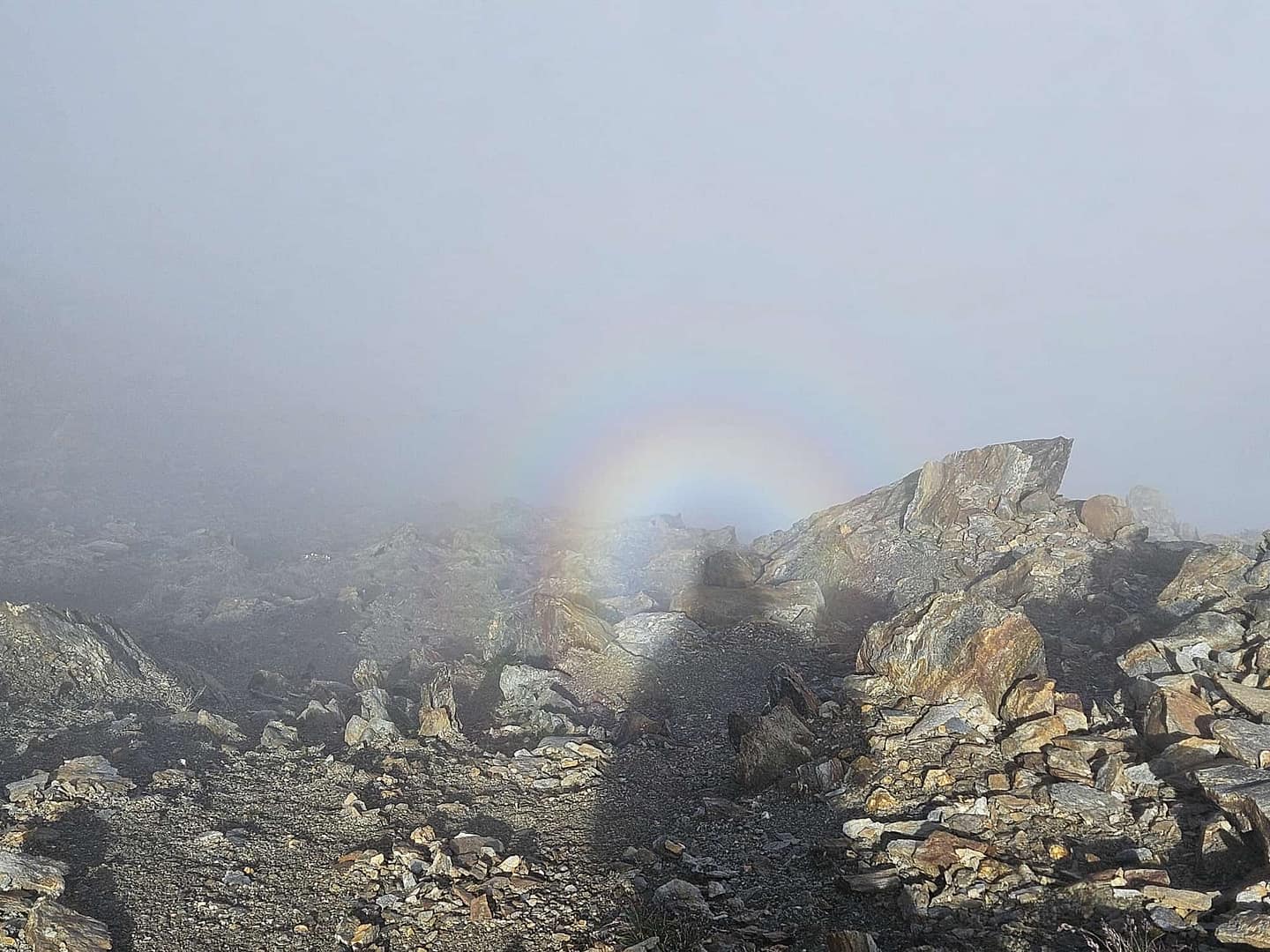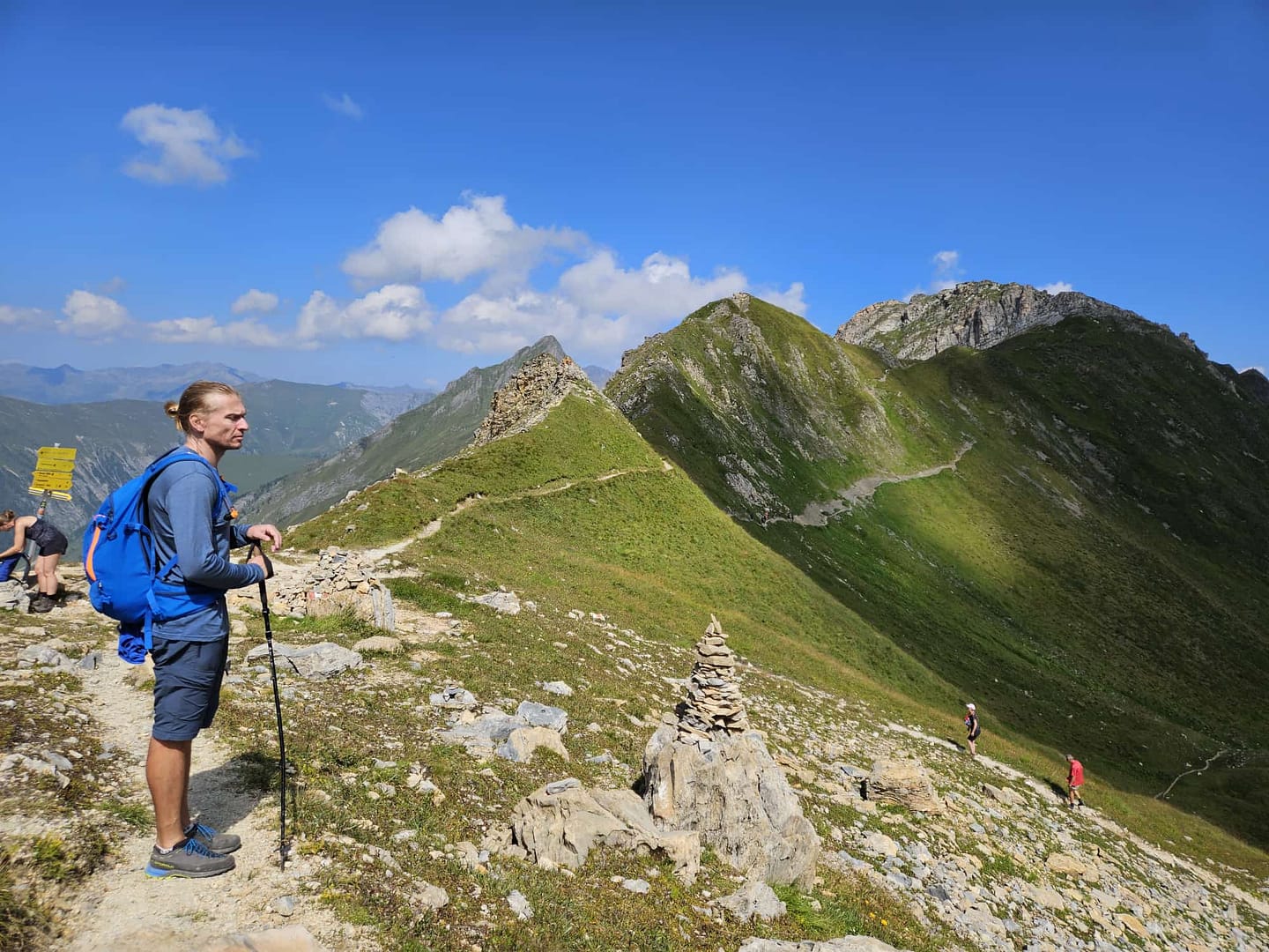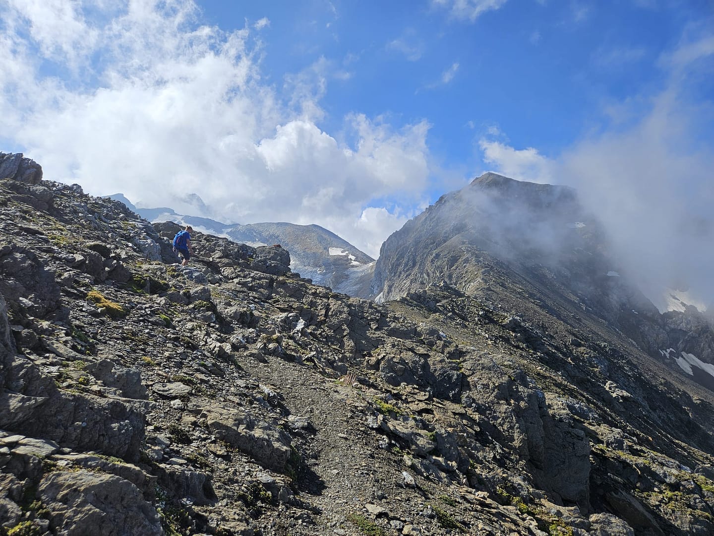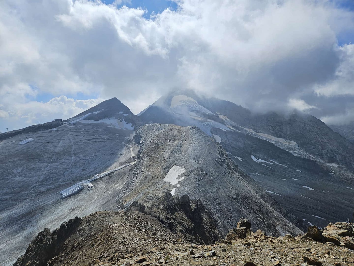 Der Weg wird nun steiniger und karger, Geröll und Schutt säumen den Weg. Zunächst geht es in süd-südöstlicher Richtung steil den Bergrücken hinauf. Ab 2.870 m Höhe wandern wir entlang des Grates weiter in süd-südwestlicher Richtung zum Gipfel. Zwar verlieren wir hier ein paar Höhenmeter, aber das ist kaum der Rede wert. Vom Gipfel aus bietet sich normalerweise ein fantastischer Ausblick. Leider zogen bei uns Wolken auf, sodass uns sogar die Sicht auf den Olperer verwehrt blieb.