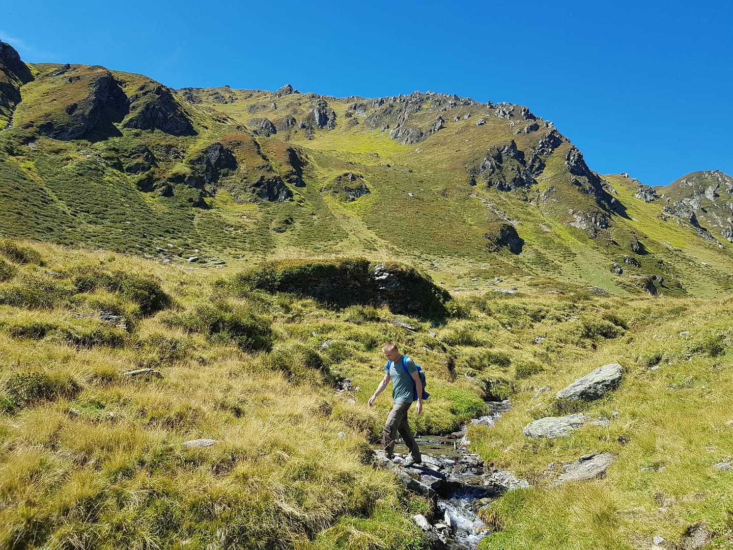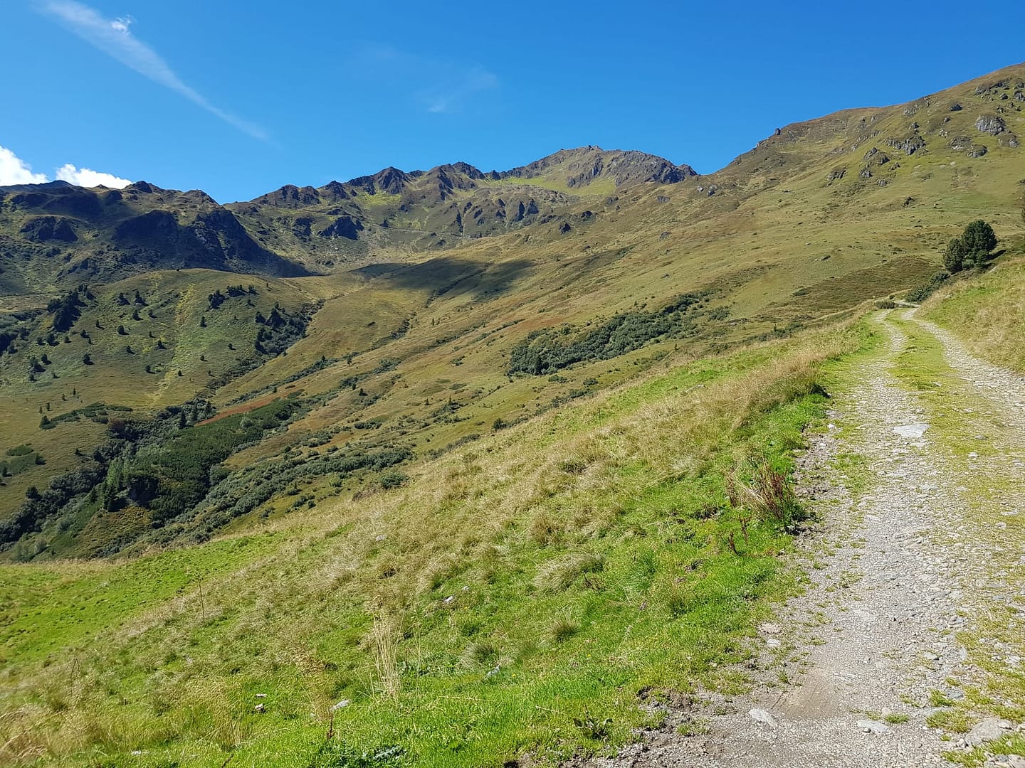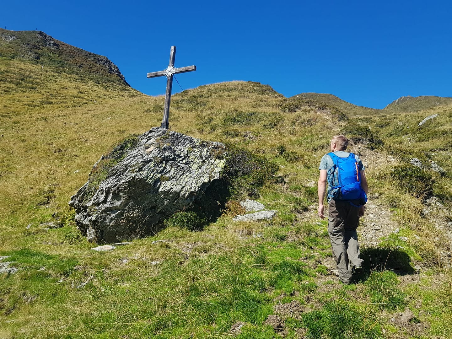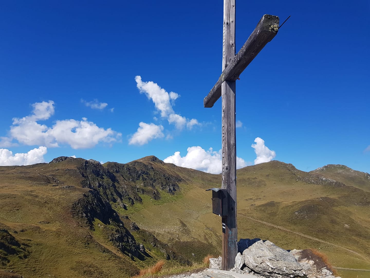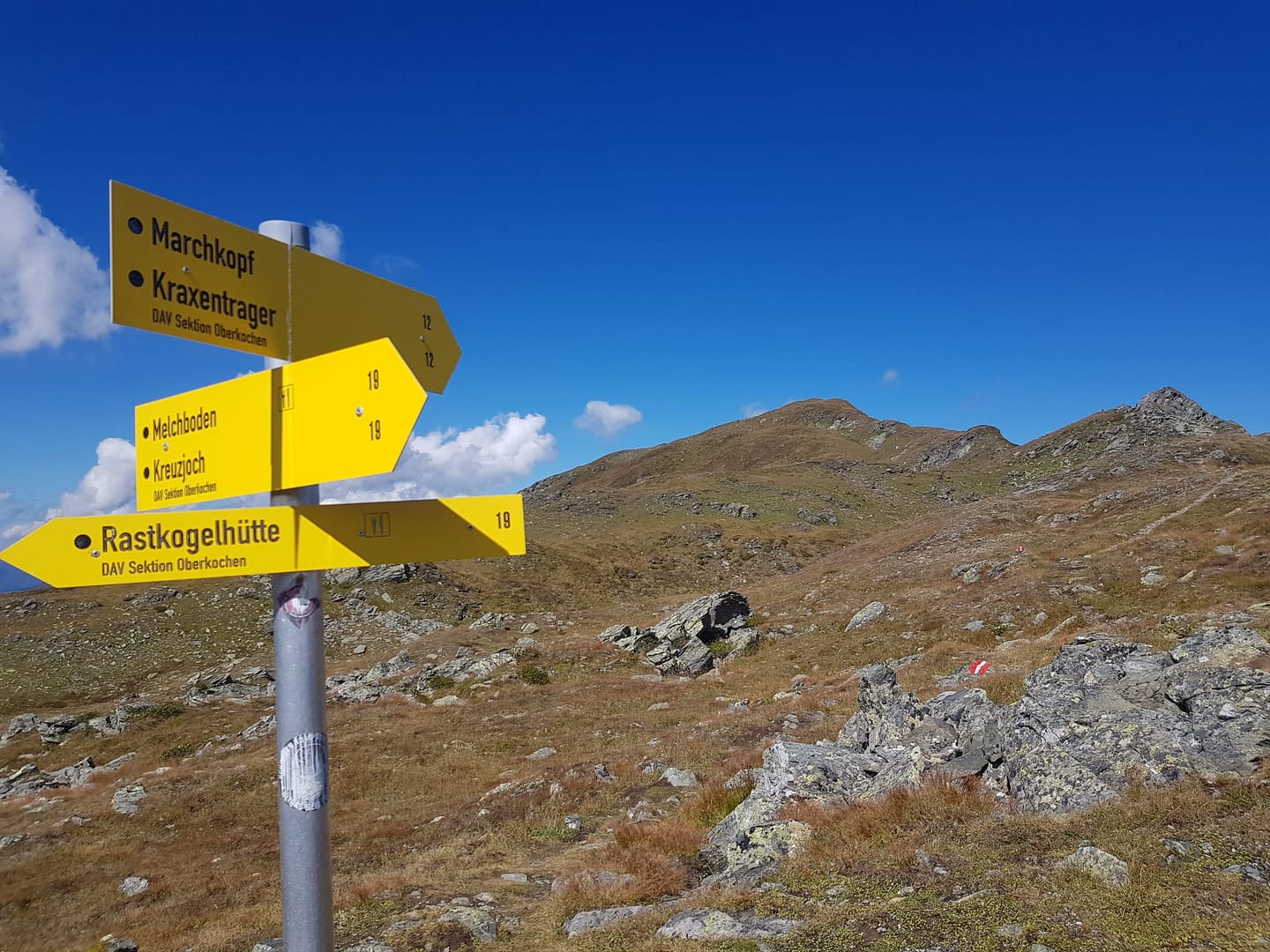 An dem Pigneidalm Hochleger treffen wir wieder auf eine Forststraße, aber unser Weg führt uns am Kreuz im Stein vorbei weiter durch die unbegangenen Grashänge. Kurz am Pigneidbach vorbei geht der Pfad in einer großen Linkskurve auf das Joch zwischen Kreuzjoch und Kraxentrager. Von hier kommt man auch zur Rastkogelhütte. Vom Joch sind es noch ca. 30 Höhemeter zum Gipfel, wo wir einen Rundumblick genießen und einen Ausblick vom „Grat“ bis zum Marchkopf haben.