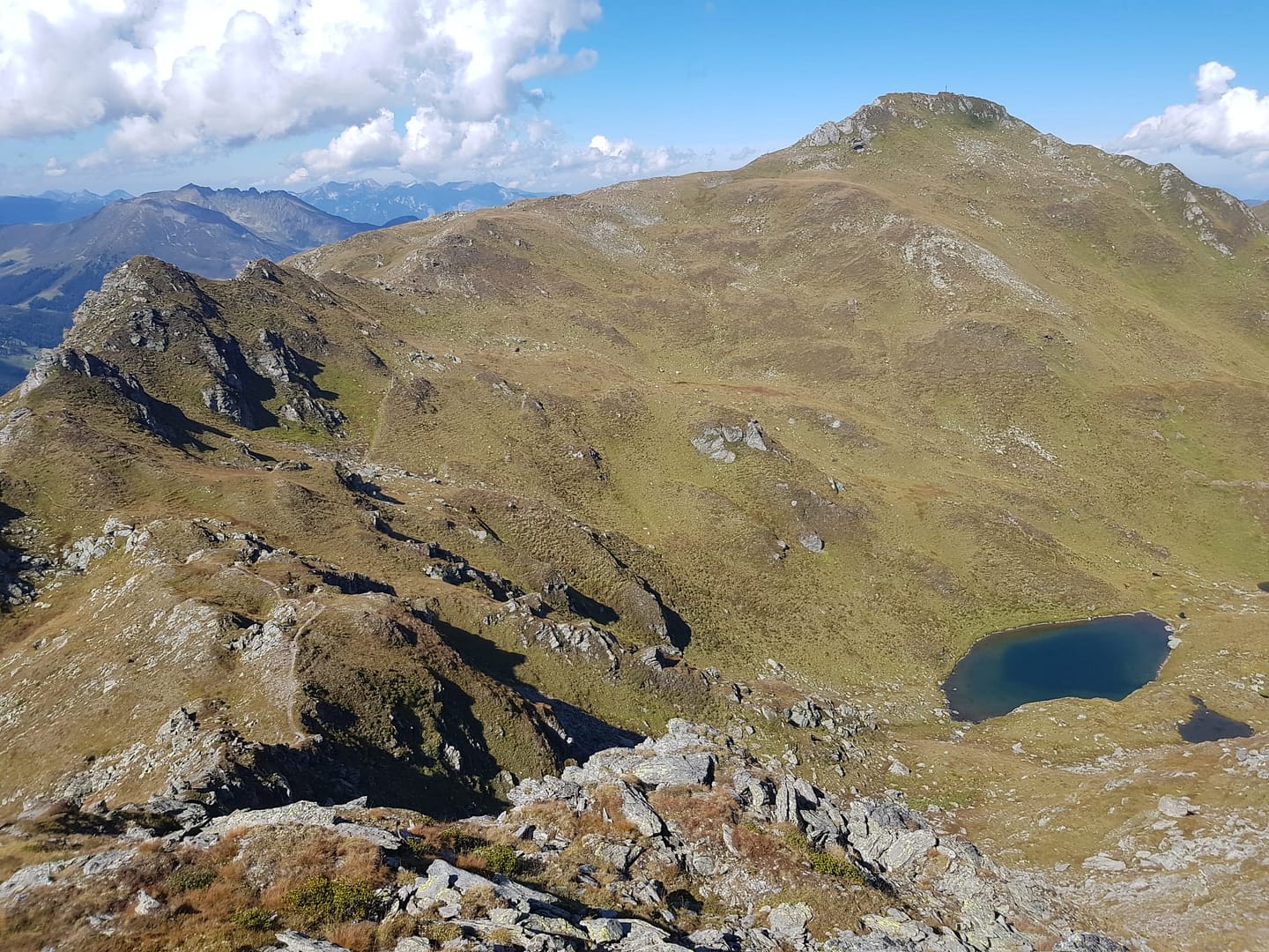 Weiter geht es über den Grat und schlussendlich durch leicht durchsetzen Fels auf den Rücken vom Marchkopf hoch. Zurückblickend sieht man nochmal den ganzen Weg, den man bisher zurück gelegt hat.