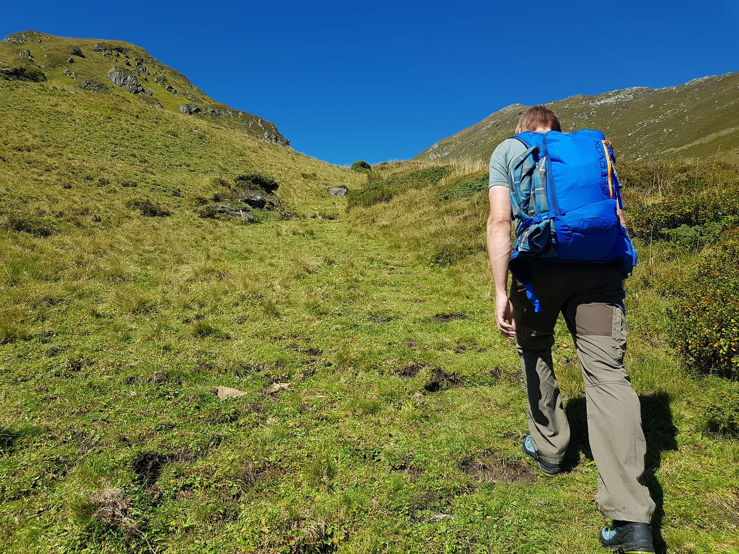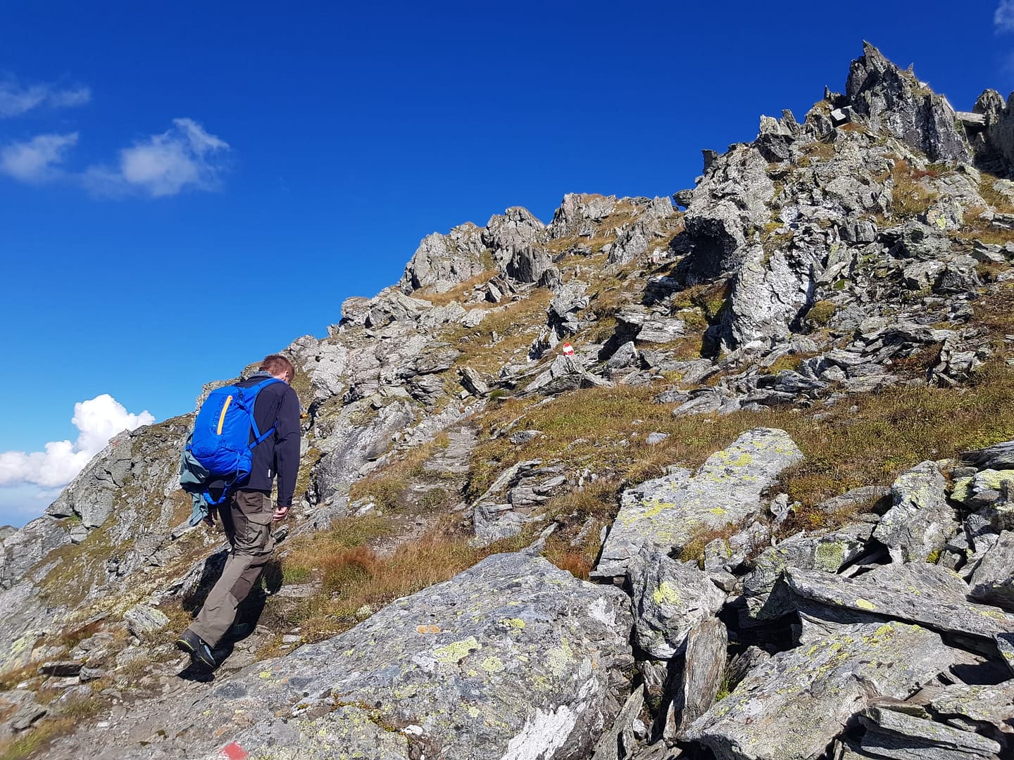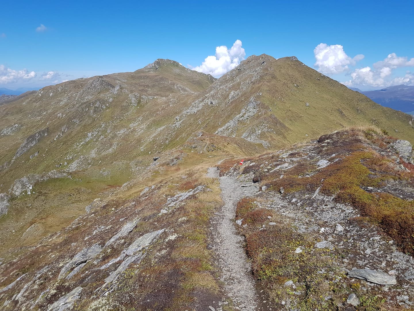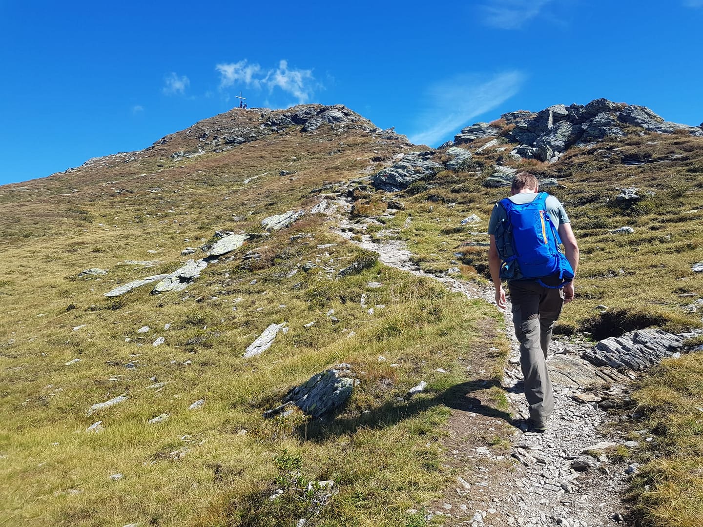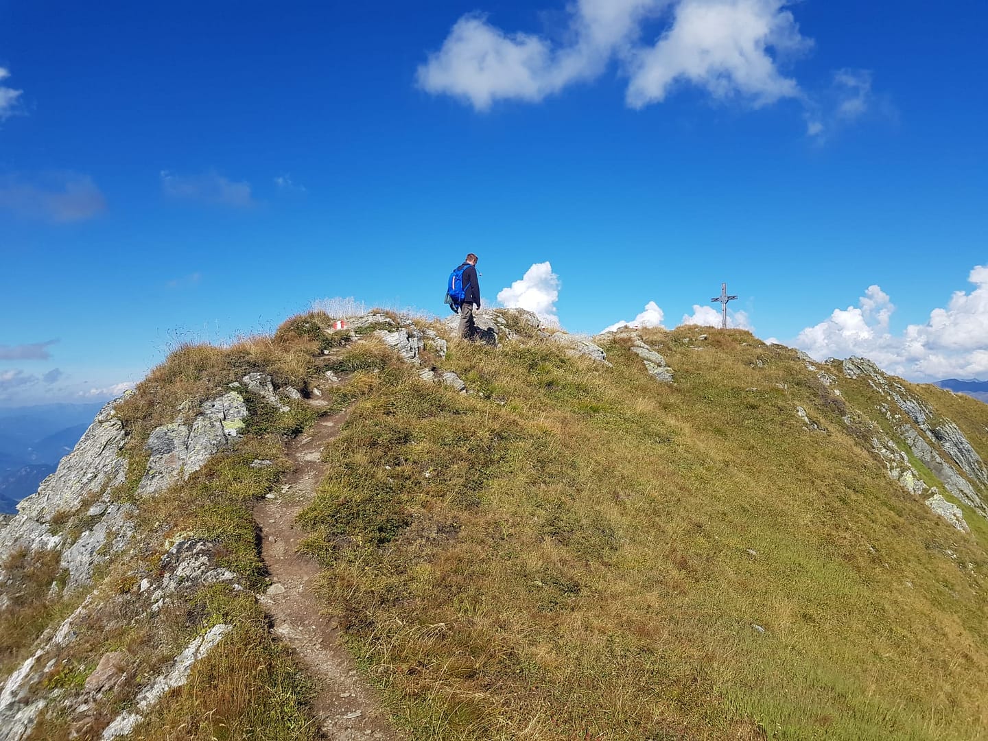 Mit dem Kreuzjoch im Rücken geht es über den „Grat“ zum Kraxenträger, welcher kein Gipfelkreuz besitzt. Auf einem schmalen Pfad geht es leicht aufsteigend rauf zum höchsten Punkt.
