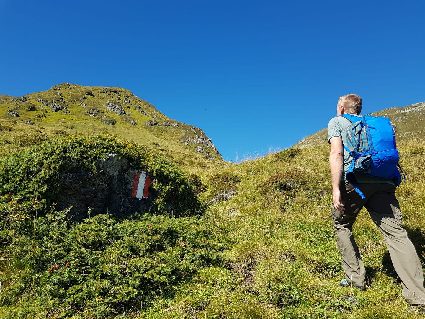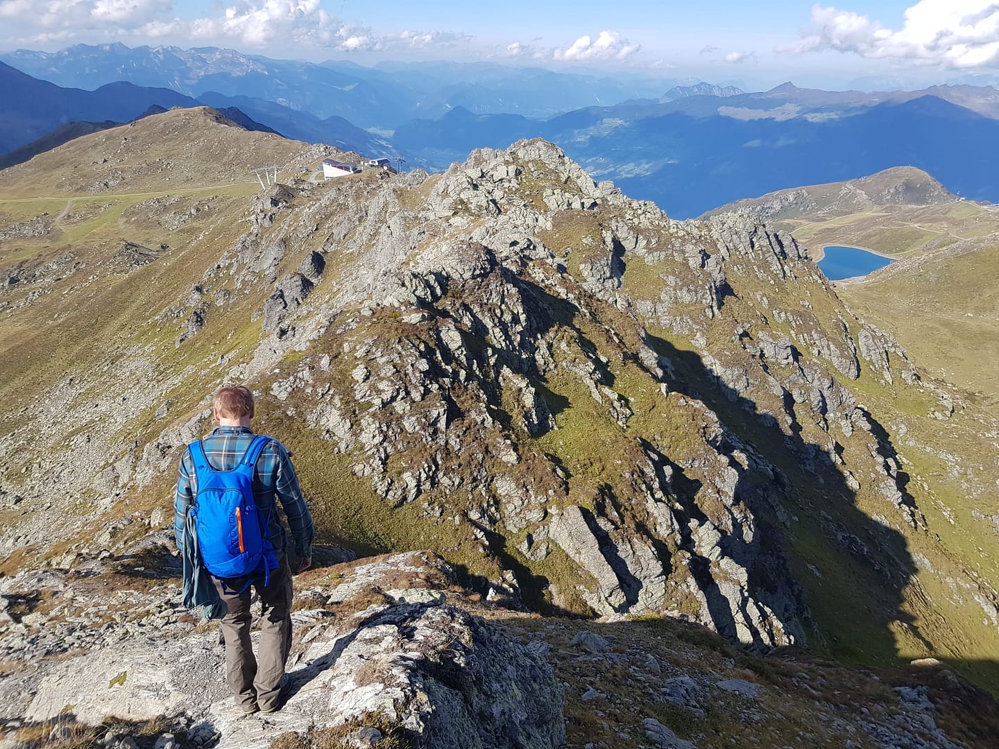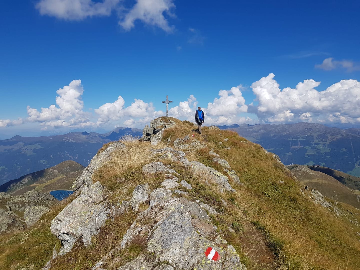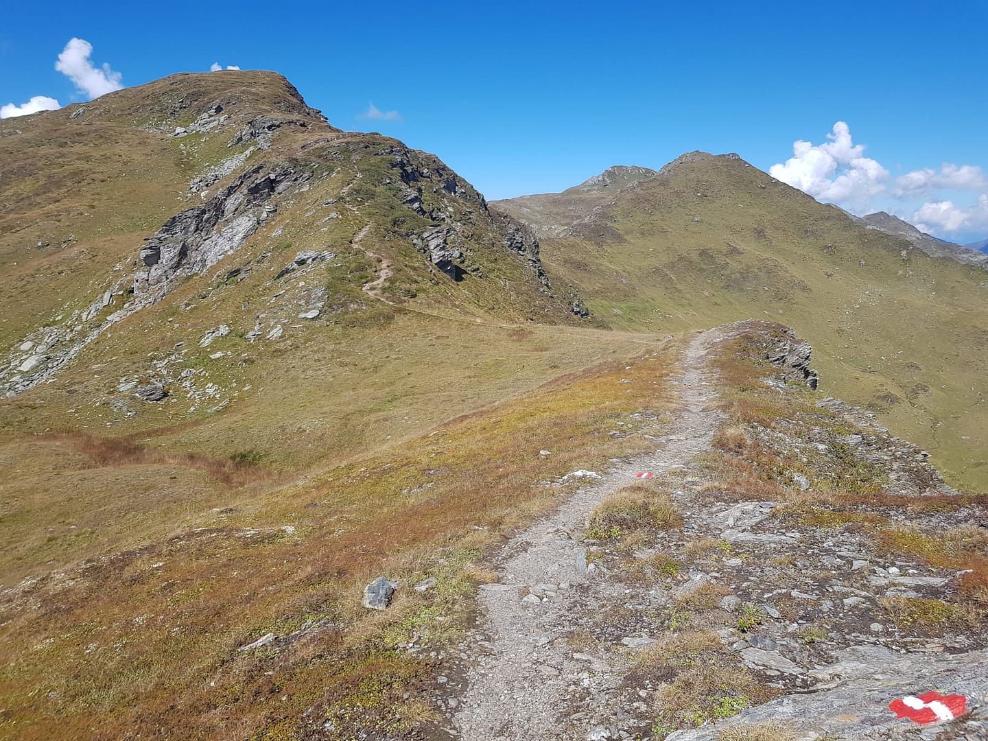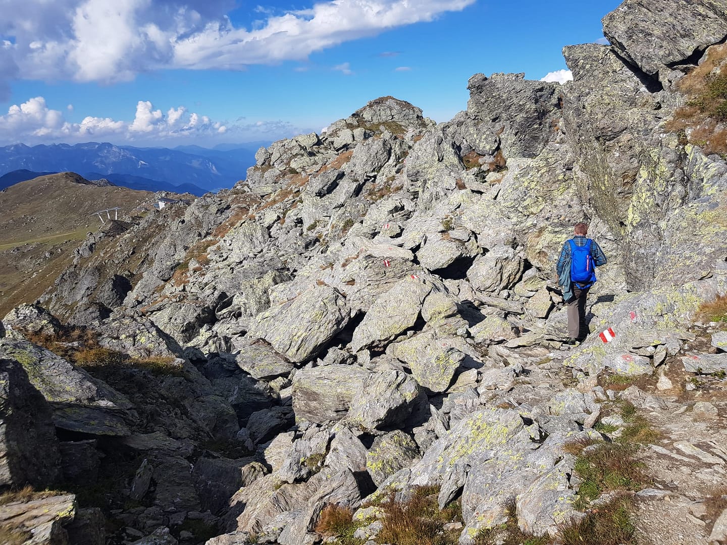 Mit dem Kreuzjoch im Rücken geht es über den „Grat“ zum Kraxenträger, welcher kein Gipfelkreuz besitzt. Auf einem schmalen Pfad geht es leicht aufsteigend rauf zum höchsten Punkt.