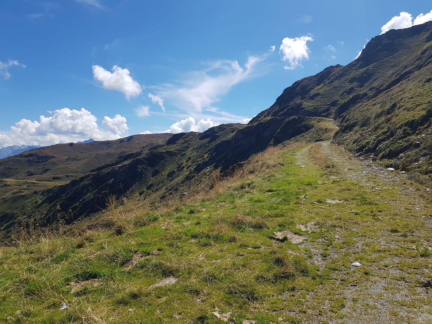 Vom Parkplatz folgen wir den Wegweisen nach rechts auf einen Forstweg, von wo aus wir bereits einige unsere Gipfelziele im Blick haben; voller Vorfreude auf den „Grat“ gehen wir los. Nach ca. 700 m gehen wir vom gut ausgebauten Forstweg runter und folgen den Wegweisern nach links durch die grasbedeckten Hänge. An manchen Stellen sieht man kaum noch einen Pfad, Trittspuren und versteckte Markierungen an Felsen weisen den Weg.
