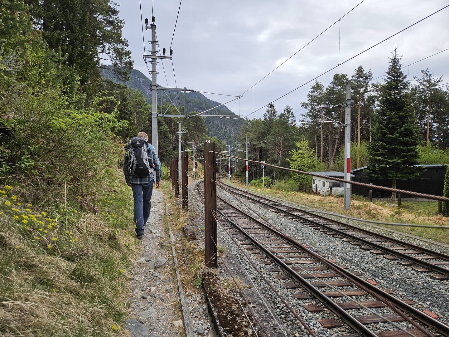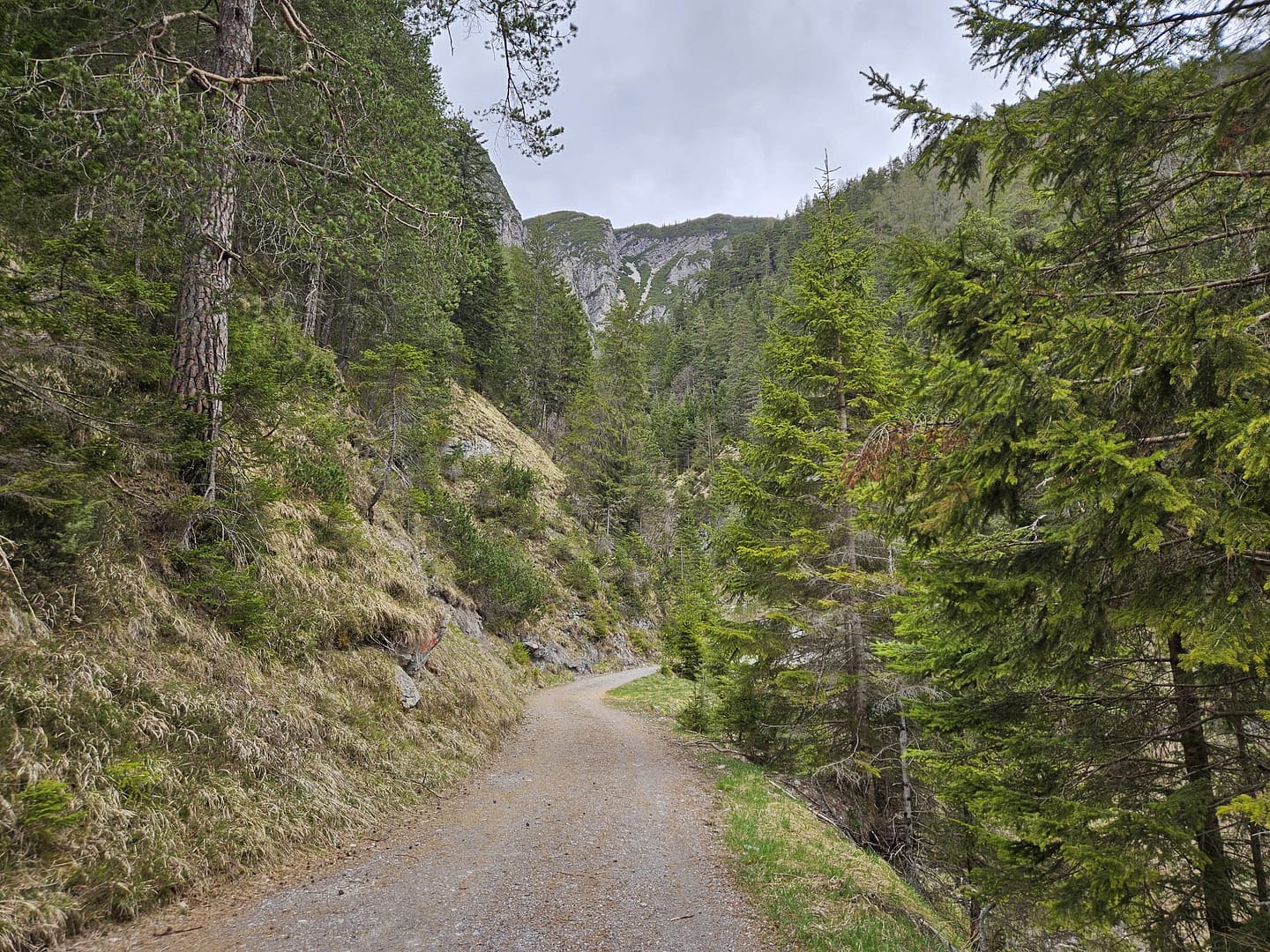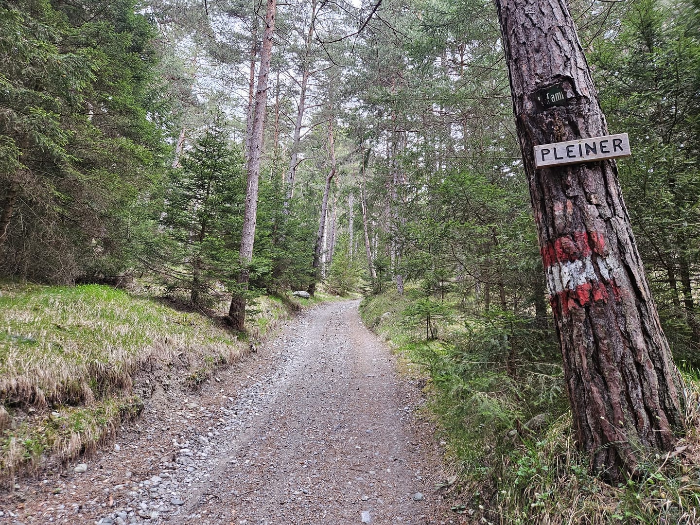 Unsere Wanderung beginnt an einer Parkbucht kurz vor dem Bahnhof. Von dort aus geht es zunächst durch den Bahnhof hindurch und ein kurzes Stück links entlang der Gleise. Schon bald verlassen wir die Zivilisation und tauchen in den ruhigen Wald ein. Nach etwa 900 Metern biegen wir links auf eine breite, sehr steile Forststraße ab und gewinnen zügig an Höhe.