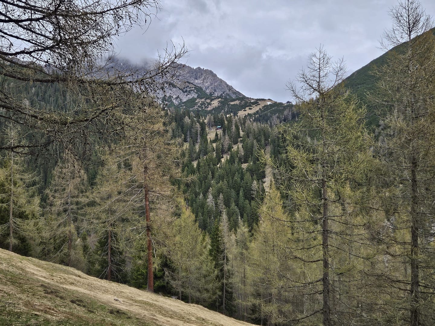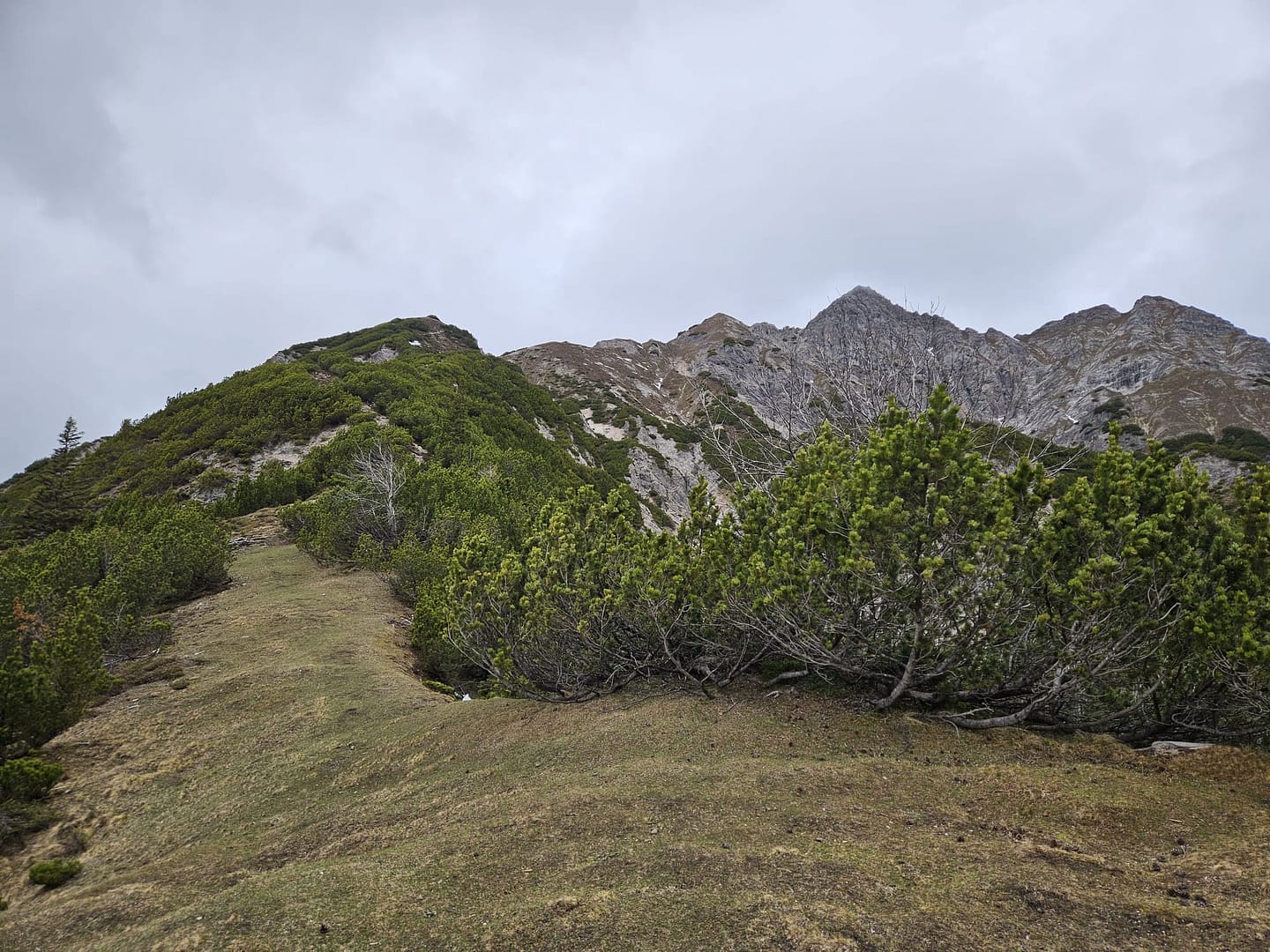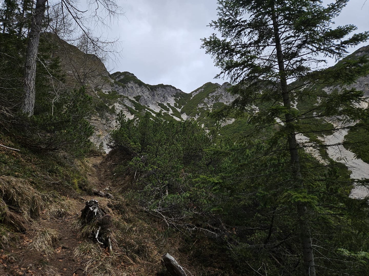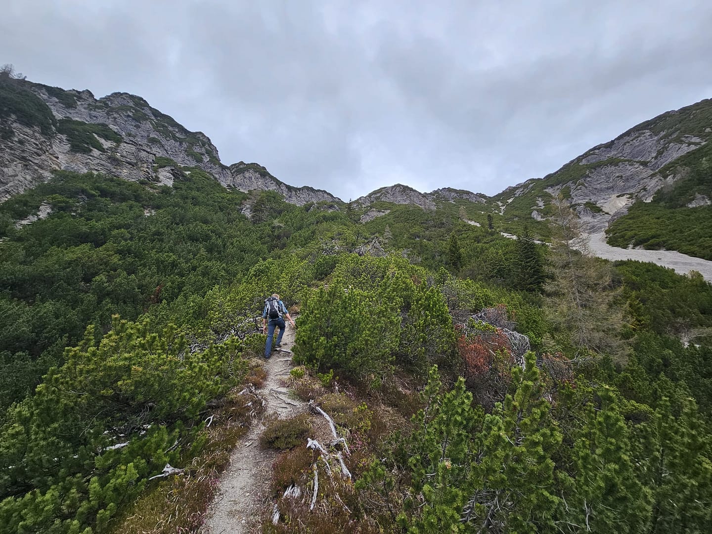 Auf etwa 1.560 Metern haben wir uns kurz verirrt – ein querliegender Ast hätte eigentlich signalisieren sollen, dass es dort nicht weitergeht. Unerwartet führt der Weg in eine schuttige Rinne hinab und beschreibt dann einen weiten Rechtsbogen entlang der Bergflanke. Teilweise ist der Steig durch Abbrüche oder Erosion etwas ausgesetzt. Am Ende des Steiges erreichen wir eine malerisch gelegene Hütte – ein herrlicher Platz zum Verweilen. Von hier führt der Pfad zunächst über eine Wiese, dann durch das Latschenfeld in nordwestlicher Richtung den Bergrücken hinauf bis zum Kreuzjöchl.