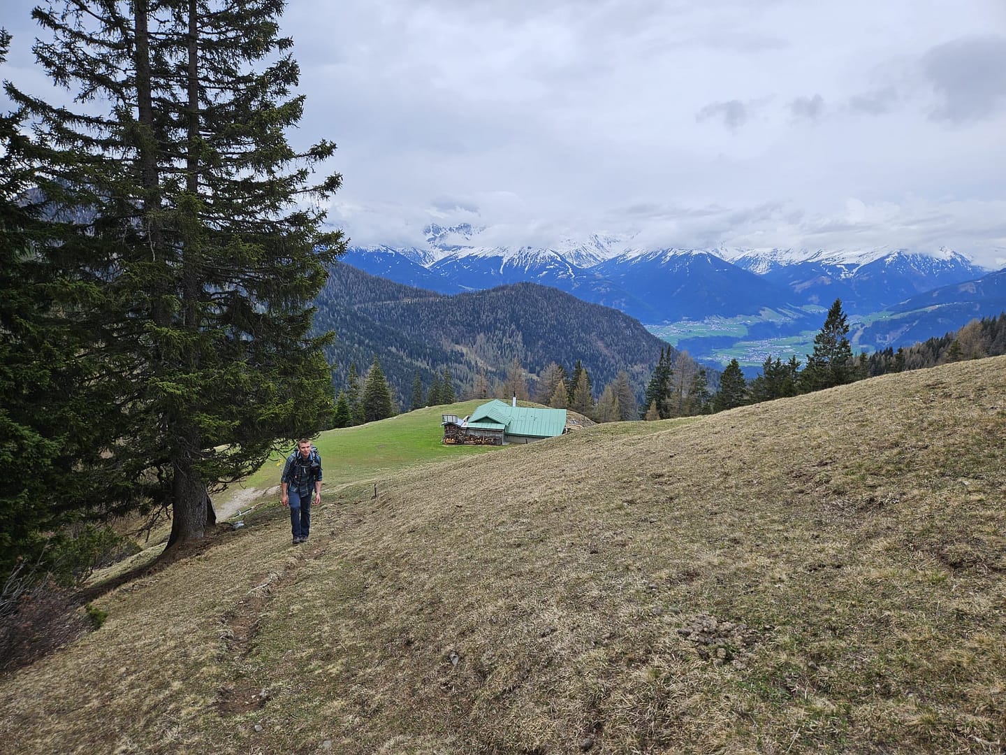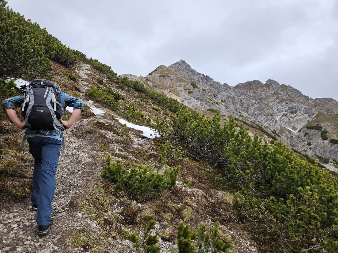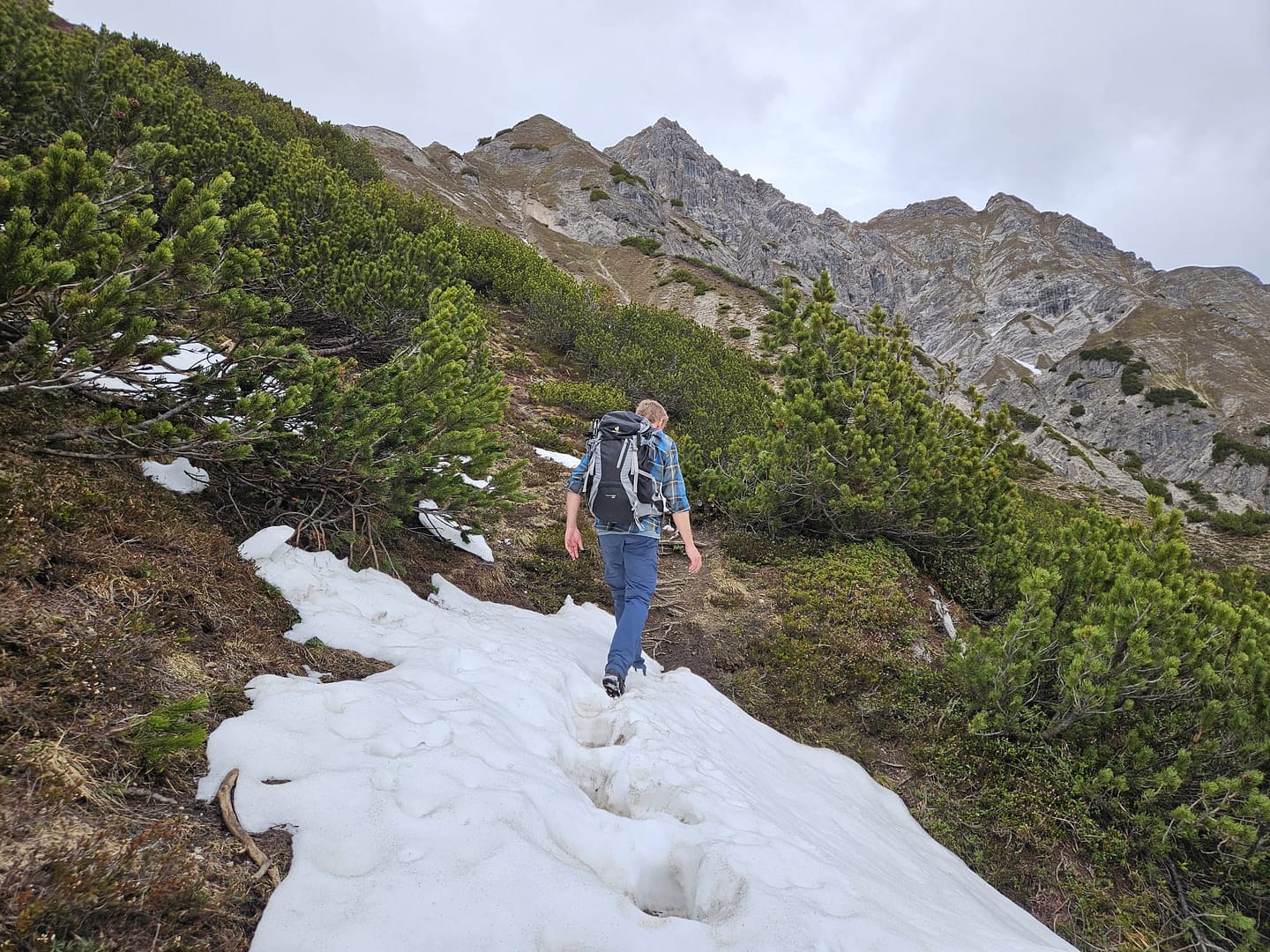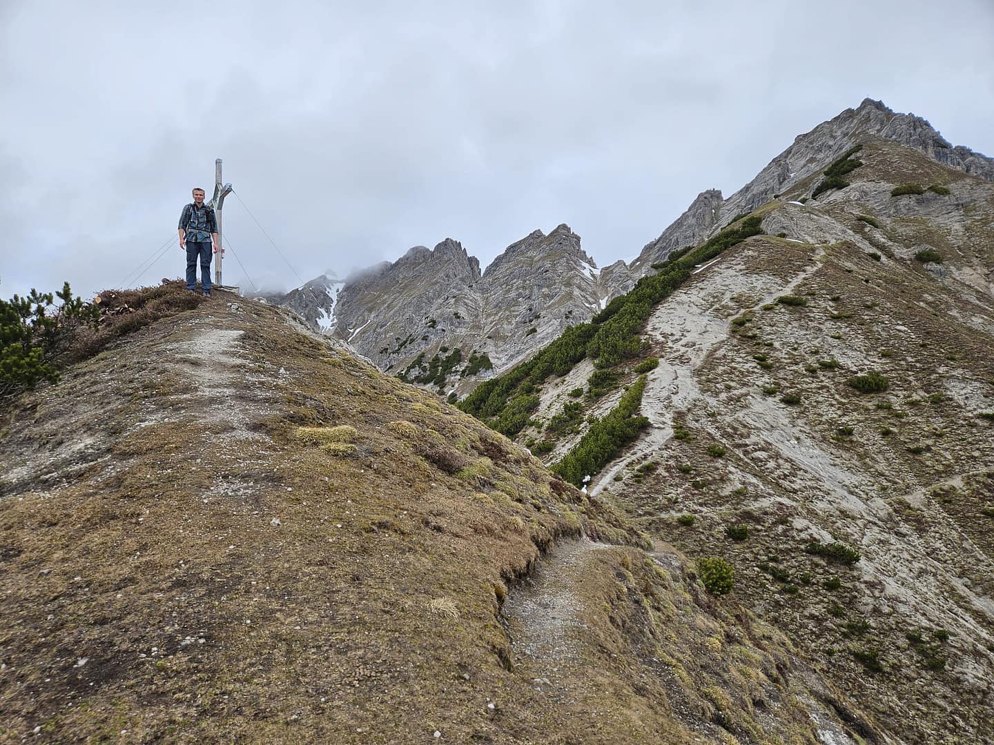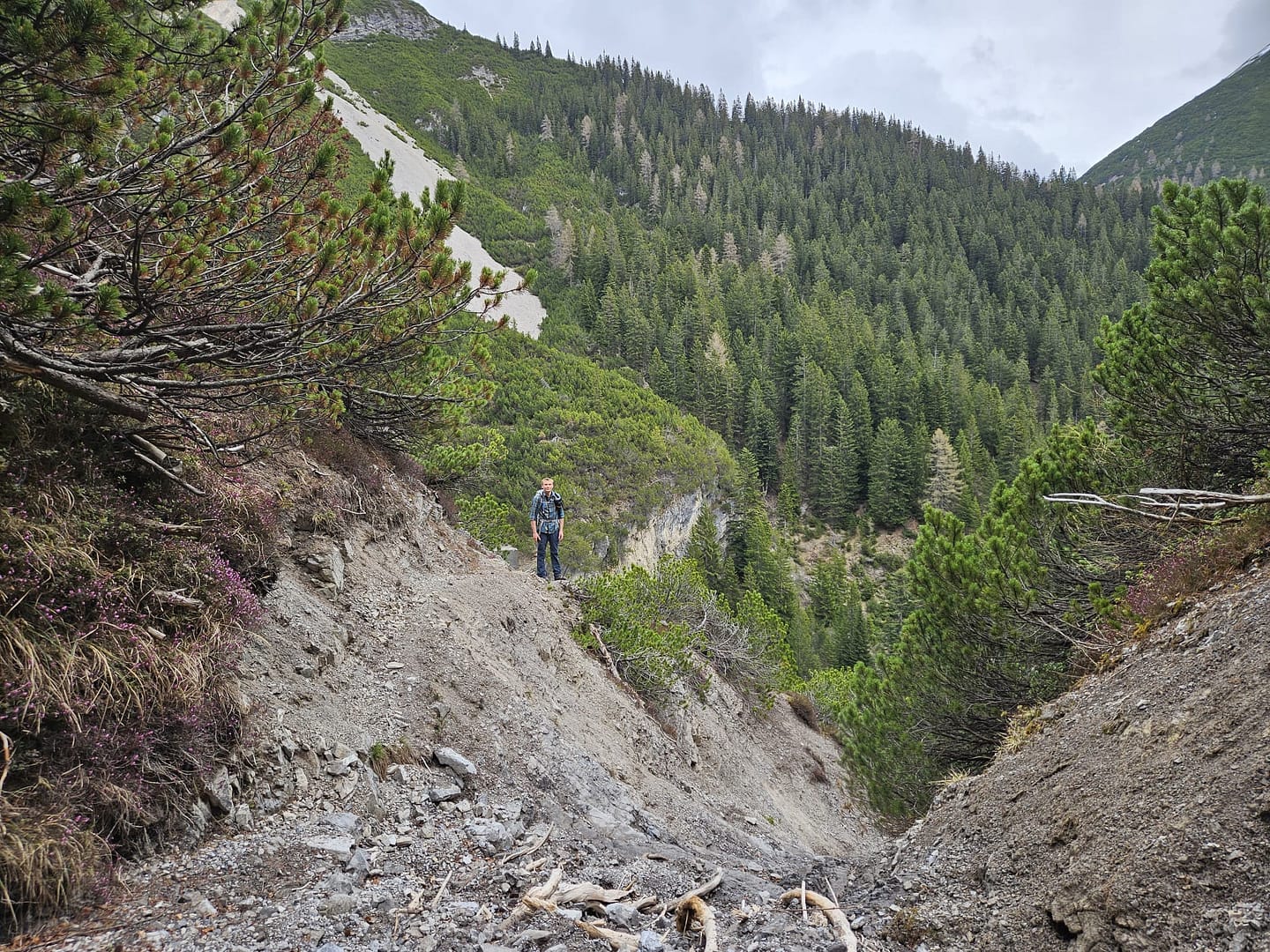 Auf etwa 1.560 Metern haben wir uns kurz verirrt – ein querliegender Ast hätte eigentlich signalisieren sollen, dass es dort nicht weitergeht. Unerwartet führt der Weg in eine schuttige Rinne hinab und beschreibt dann einen weiten Rechtsbogen entlang der Bergflanke. Teilweise ist der Steig durch Abbrüche oder Erosion etwas ausgesetzt. Am Ende des Steiges erreichen wir eine malerisch gelegene Hütte – ein herrlicher Platz zum Verweilen. Von hier führt der Pfad zunächst über eine Wiese, dann durch das Latschenfeld in nordwestlicher Richtung den Bergrücken hinauf bis zum Kreuzjöchl.