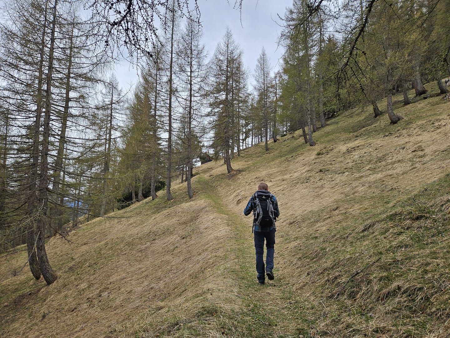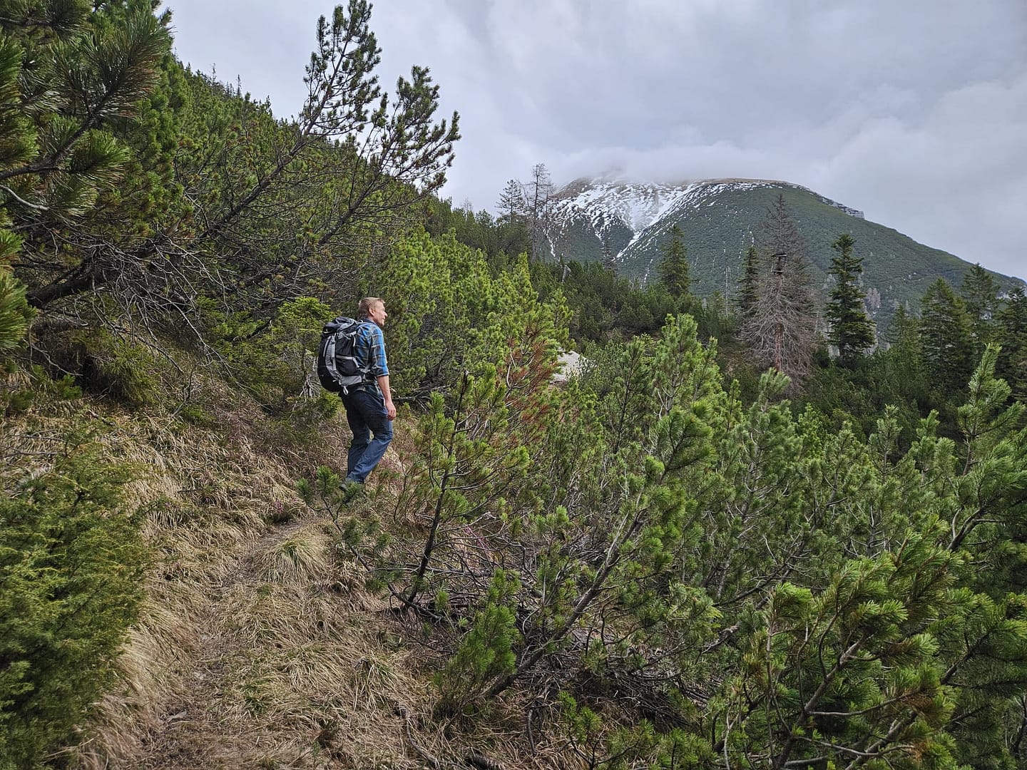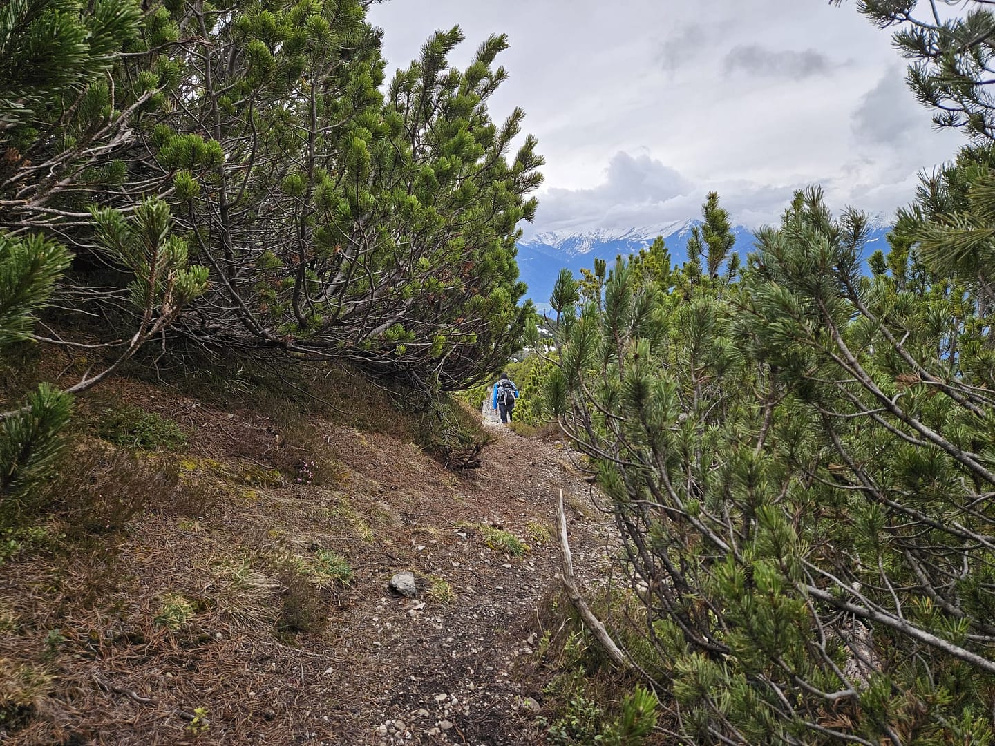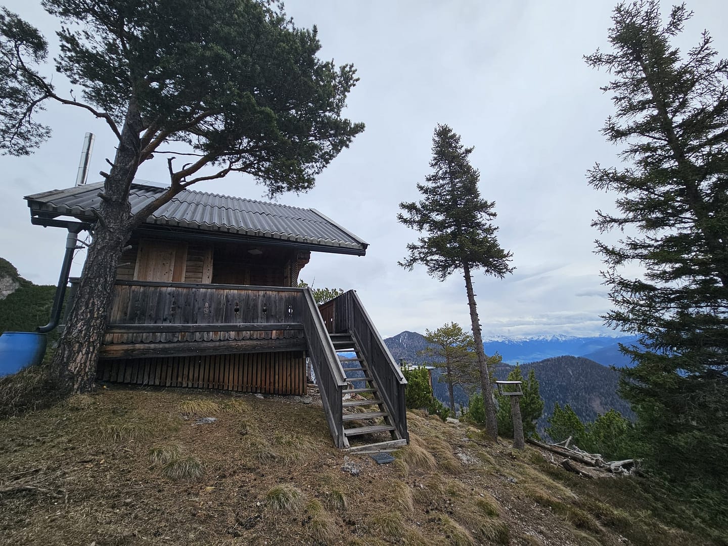 Auf etwa 1.560 Metern haben wir uns kurz verirrt – ein querliegender Ast hätte eigentlich signalisieren sollen, dass es dort nicht weitergeht. Unerwartet führt der Weg in eine schuttige Rinne hinab und beschreibt dann einen weiten Rechtsbogen entlang der Bergflanke. Teilweise ist der Steig durch Abbrüche oder Erosion etwas ausgesetzt. Am Ende des Steiges erreichen wir eine malerisch gelegene Hütte – ein herrlicher Platz zum Verweilen. Von hier führt der Pfad zunächst über eine Wiese, dann durch das Latschenfeld in nordwestlicher Richtung den Bergrücken hinauf bis zum Kreuzjöchl.