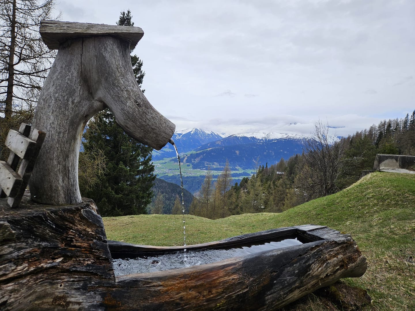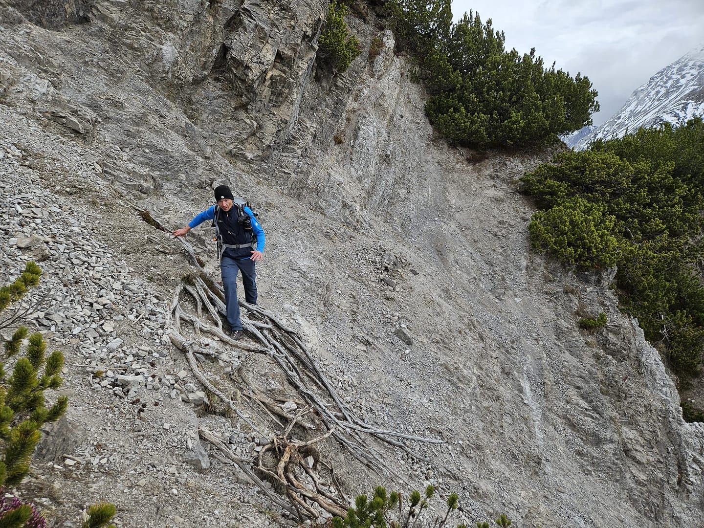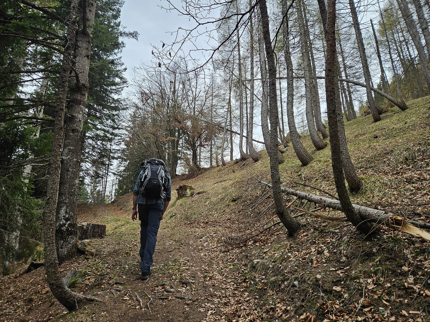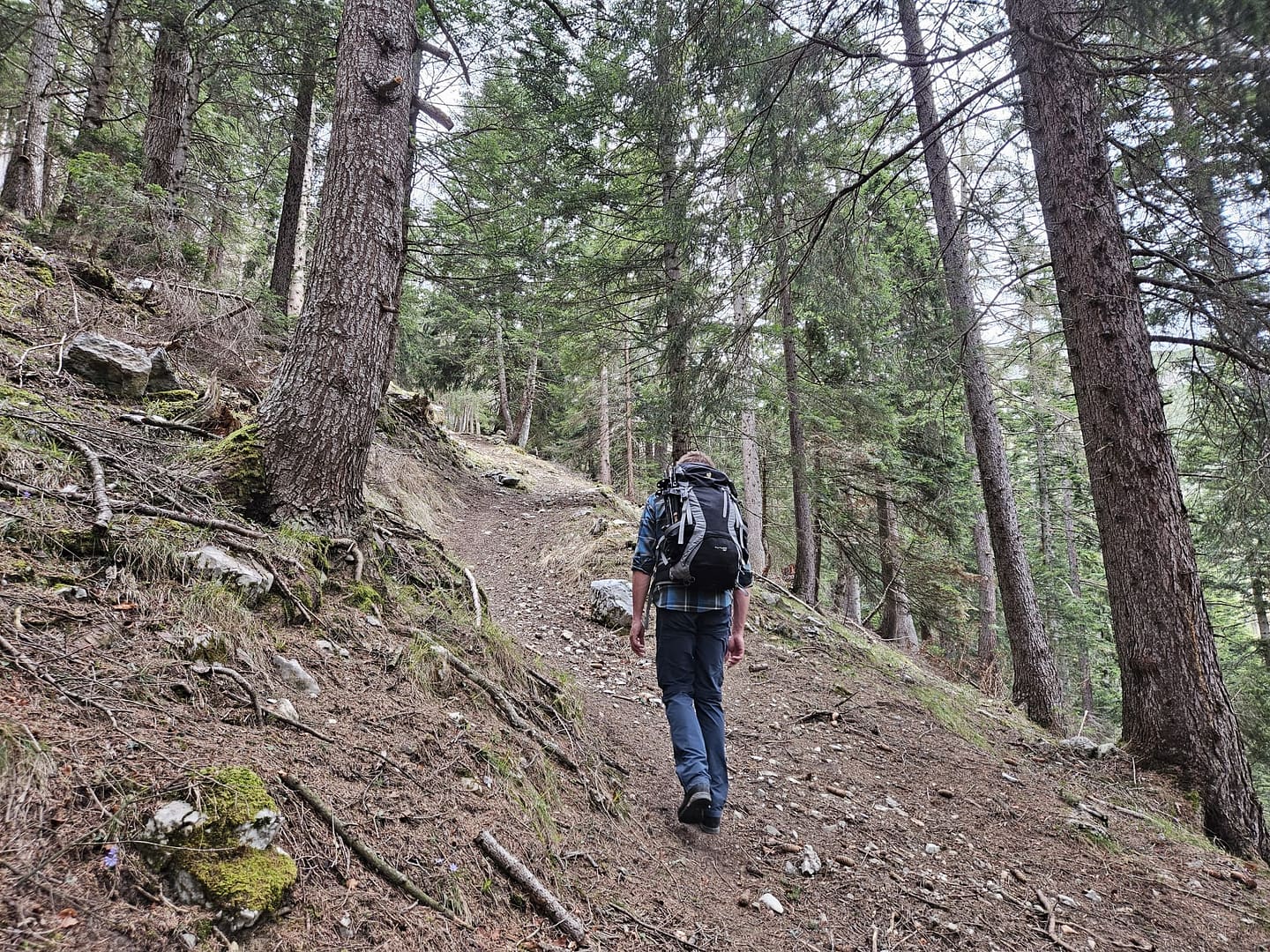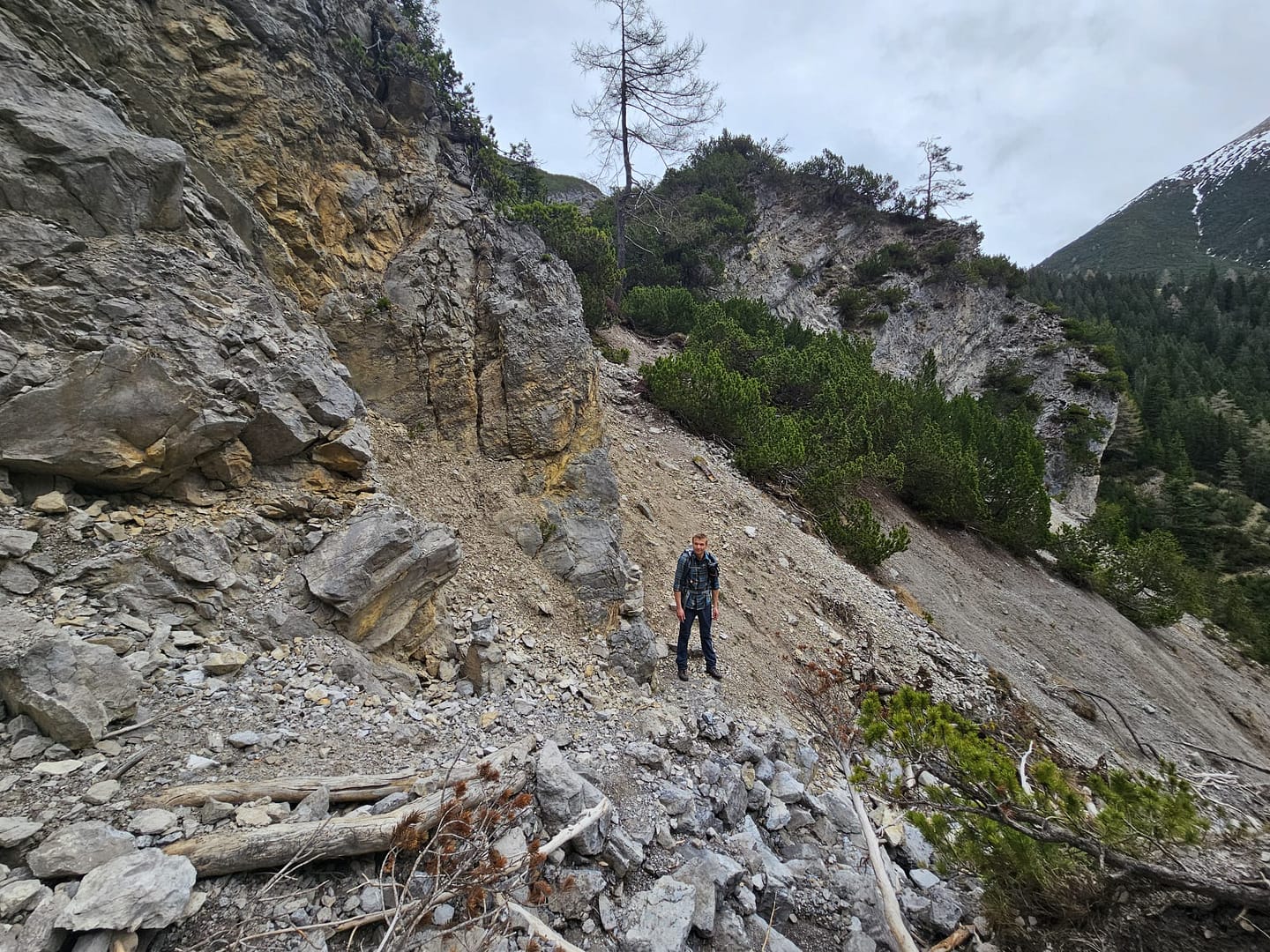 Auf etwa 1.560 Metern haben wir uns kurz verirrt – ein querliegender Ast hätte eigentlich signalisieren sollen, dass es dort nicht weitergeht. Unerwartet führt der Weg in eine schuttige Rinne hinab und beschreibt dann einen weiten Rechtsbogen entlang der Bergflanke. Teilweise ist der Steig durch Abbrüche oder Erosion etwas ausgesetzt. Am Ende des Steiges erreichen wir eine malerisch gelegene Hütte – ein herrlicher Platz zum Verweilen. Von hier führt der Pfad zunächst über eine Wiese, dann durch das Latschenfeld in nordwestlicher Richtung den Bergrücken hinauf bis zum Kreuzjöchl.